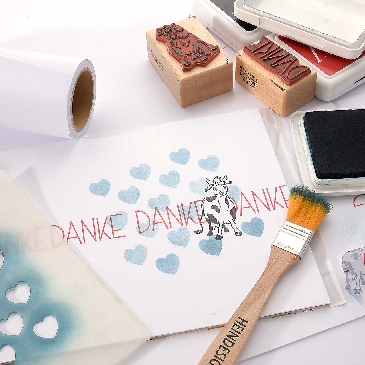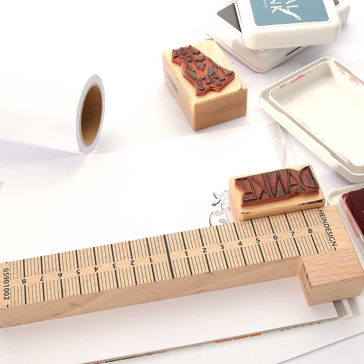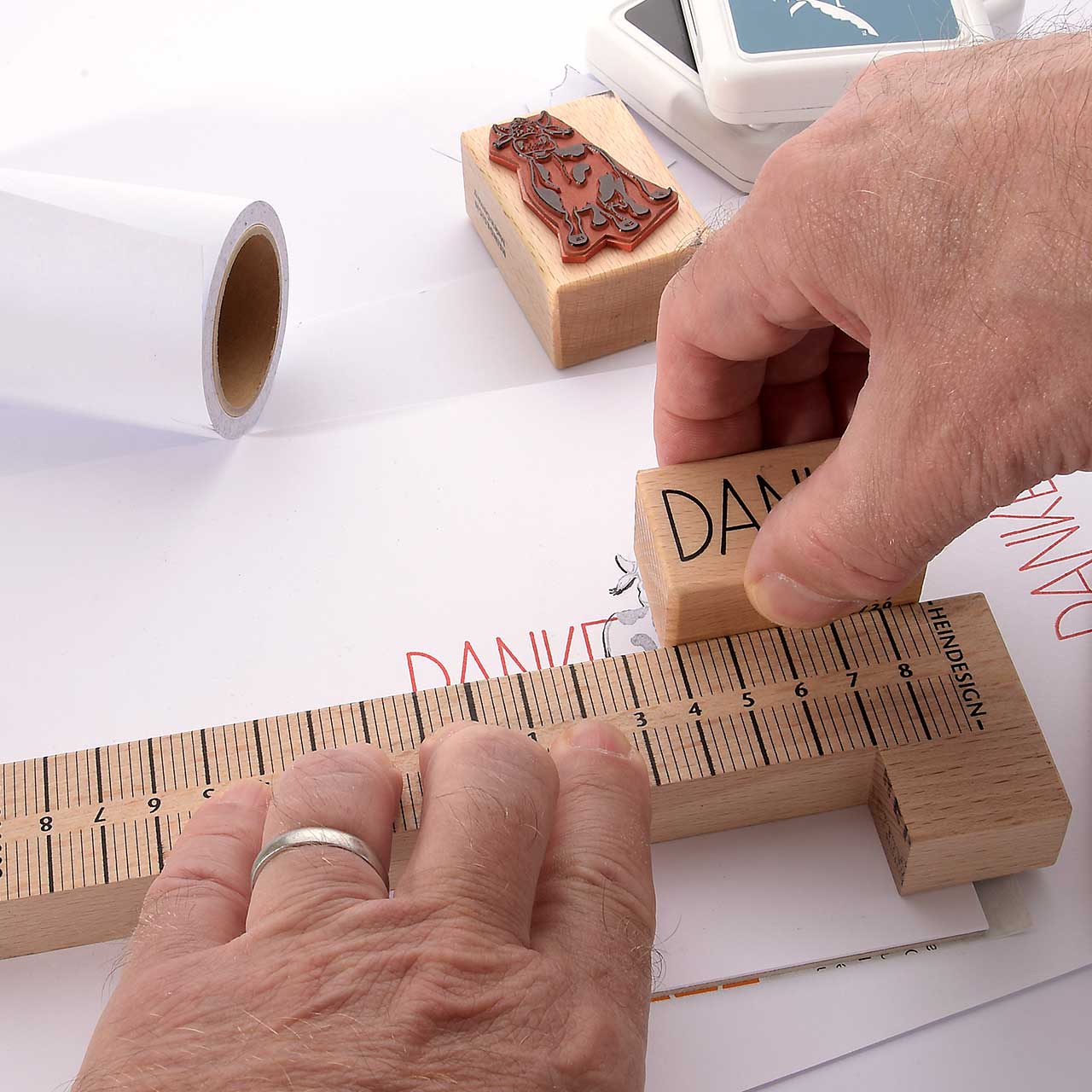 Stempeln Sie das Danke Textmotiv mit dem roten Stempelkissen und mit Hilfe des Stempelanlegewinkels mehrmals in einer Reihe über Ihre Karte.