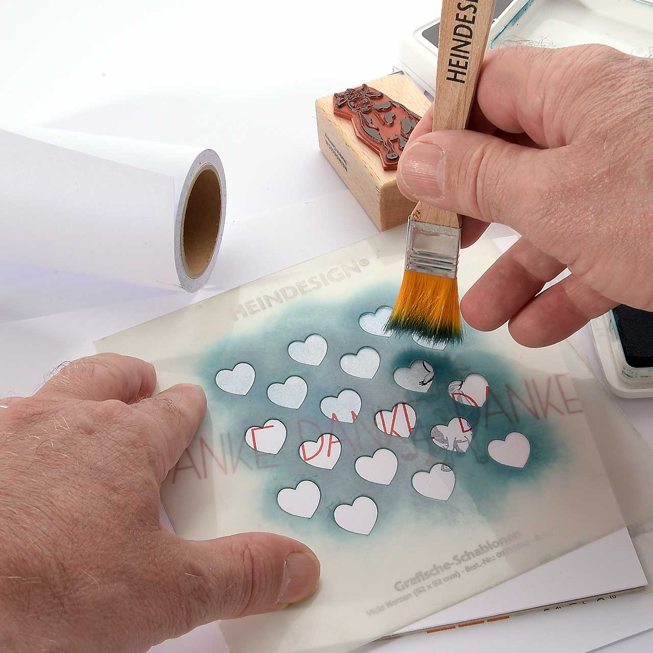 Legen Sie die Vielen Herzen Schablone diagonal auf Ihre Karte und tupfen Sie mit dem Pinsel blaue Farbe aus dem Stempelkissen auf.