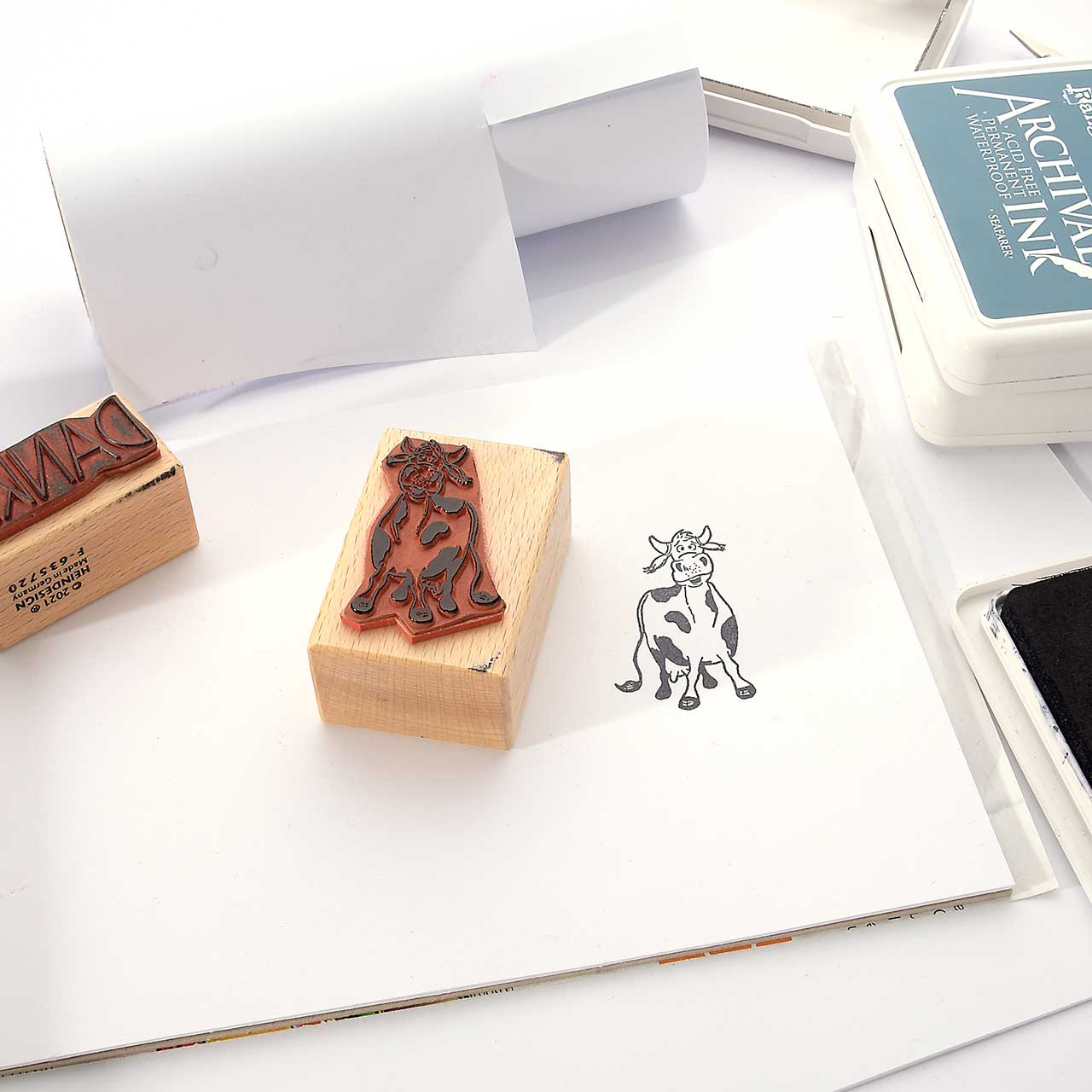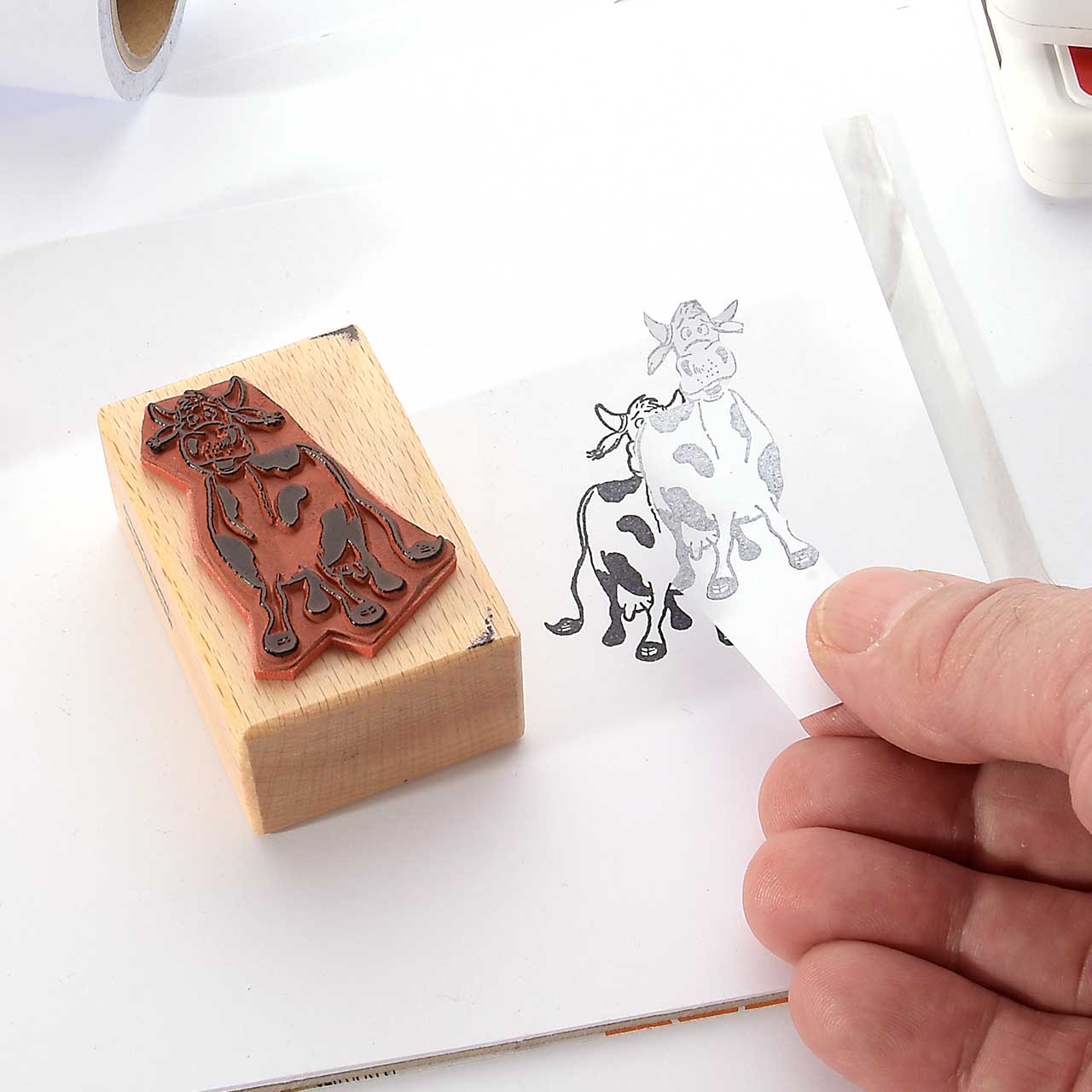 Stempeln Sie das Kuh-Motiv mit dem schwarzen Stempelkissen in die rechte Mitte Ihrer Karte.