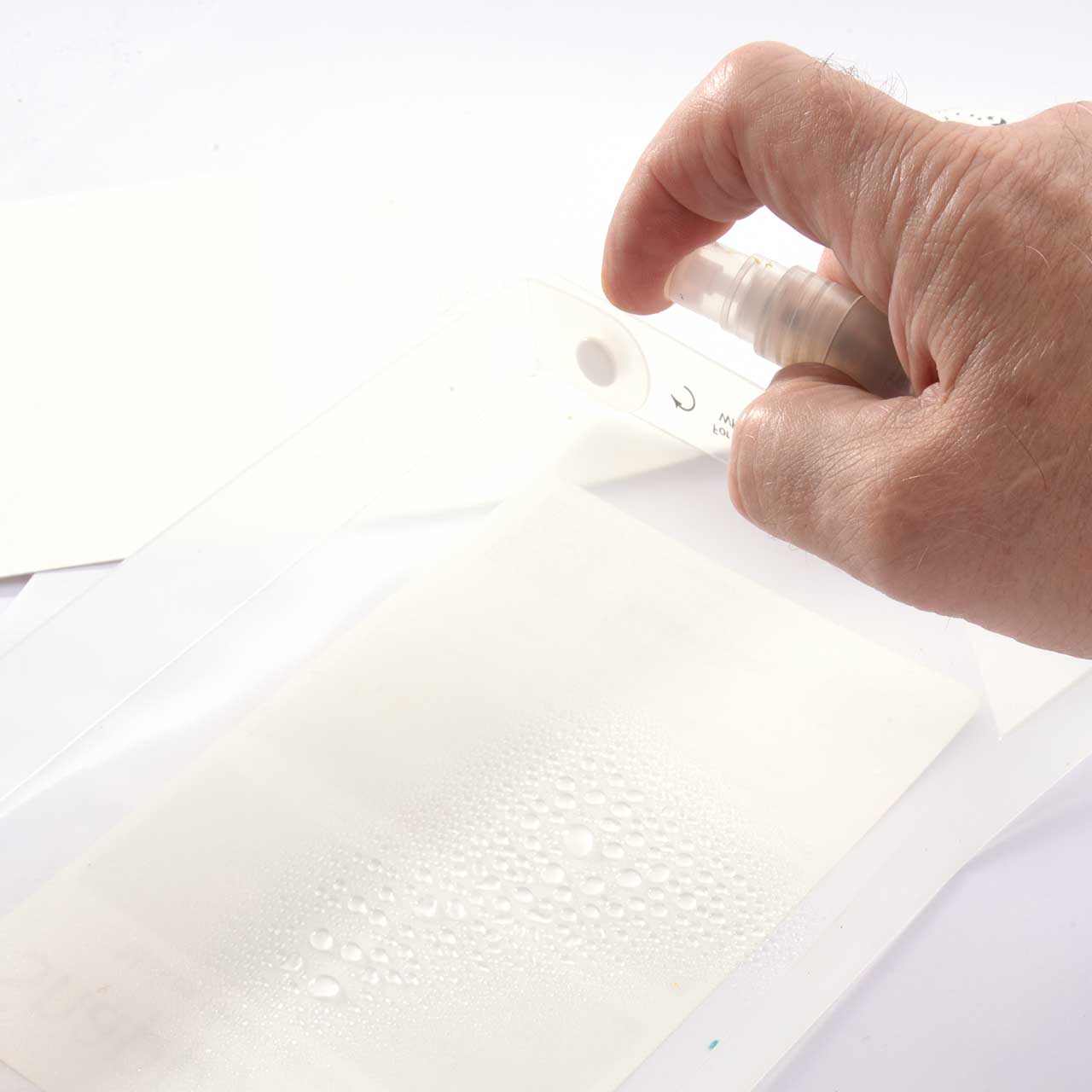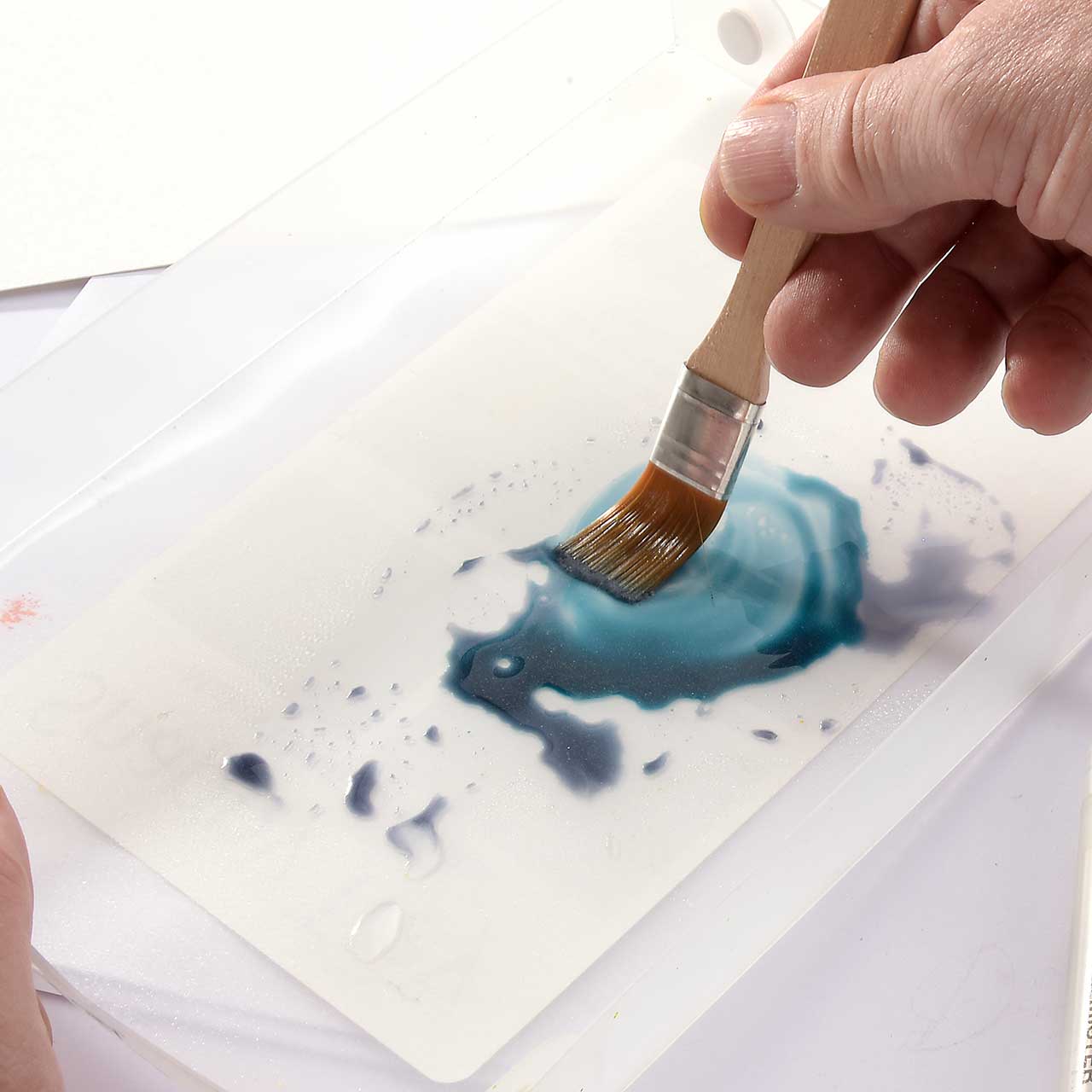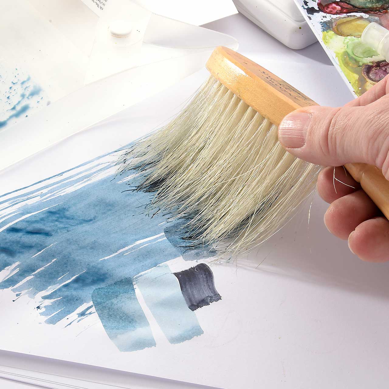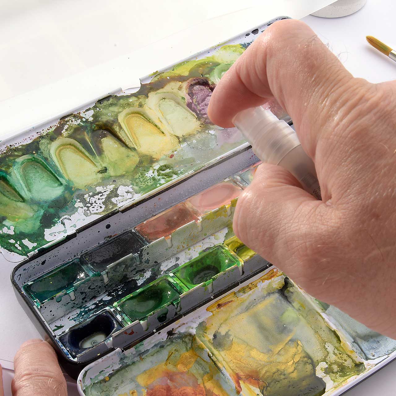 Sprühen Sie einen Wassernebel auf Ihren Malkasten (dadurch wird die Farbe etwas weicher und lässt sich besser verarbeiten).