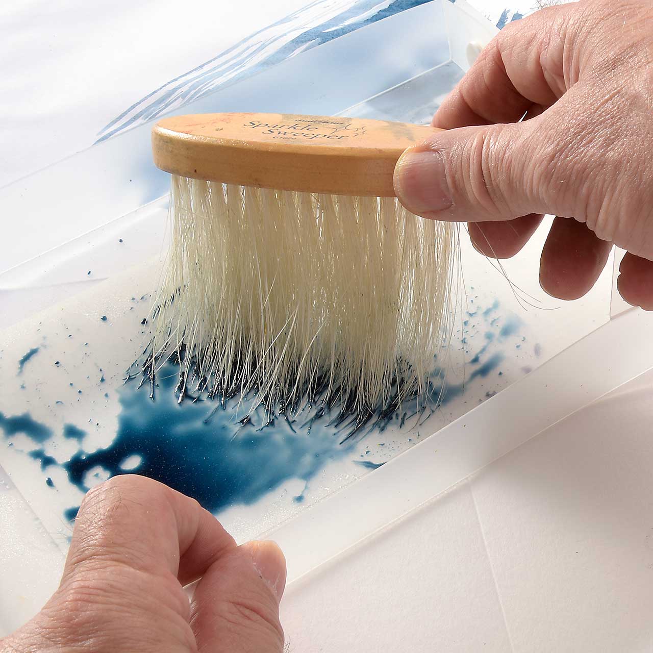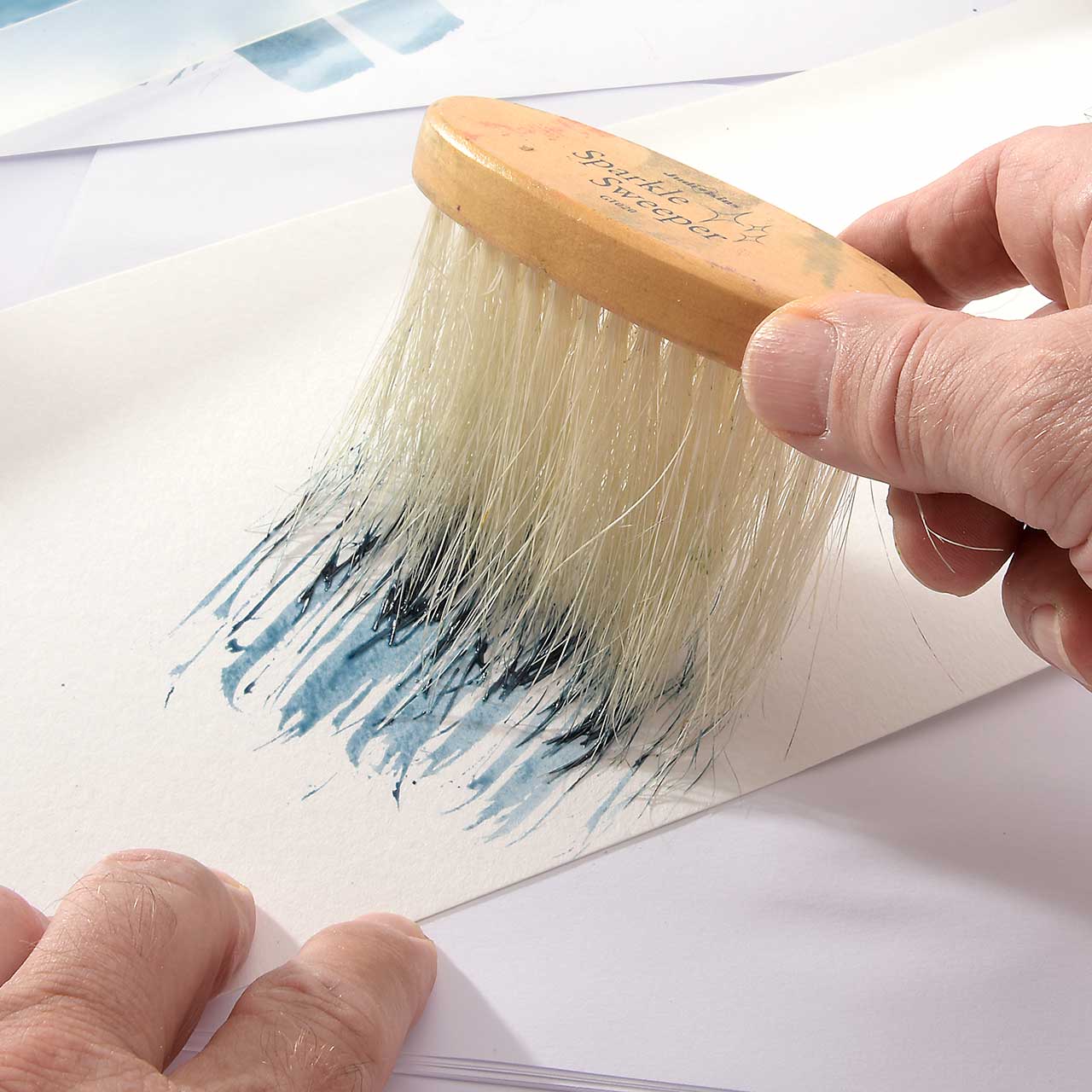 Nehmen Sie die blaue Farbe mit dem Flotten Feger auf und machen Sie eine Probe auf einem Stück Schmierpapier.