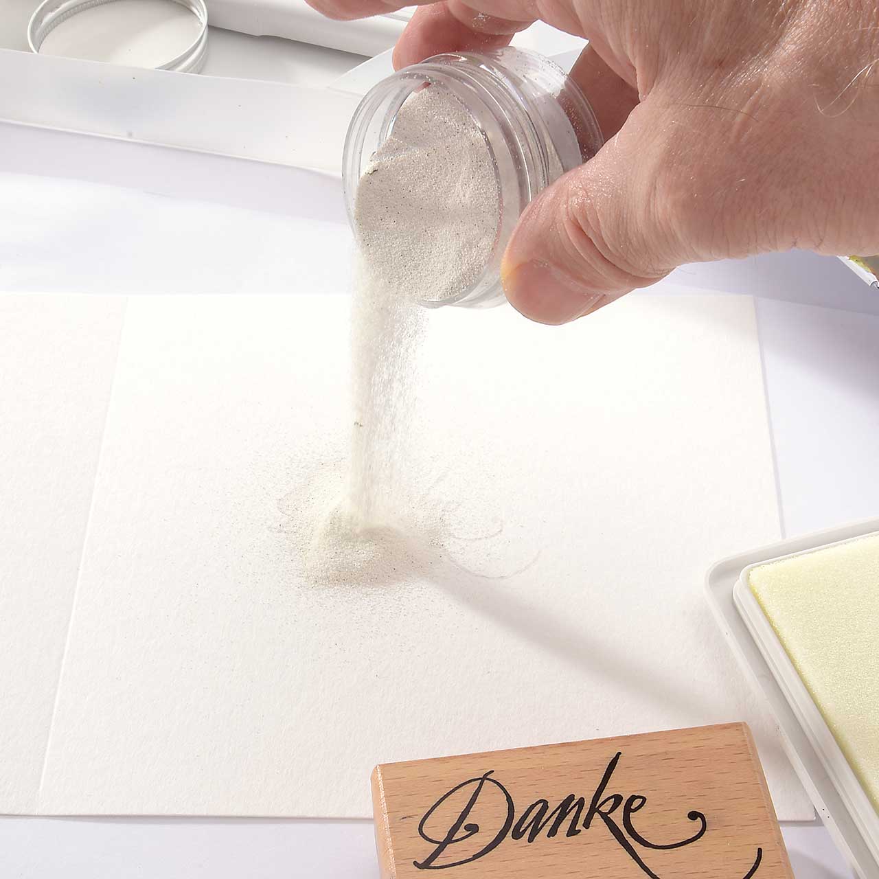 Stempeln und embossen Sie das „Danke“ Textmotiv mit dem weißen Sternenstaub in die Mitte ihrer Karte.