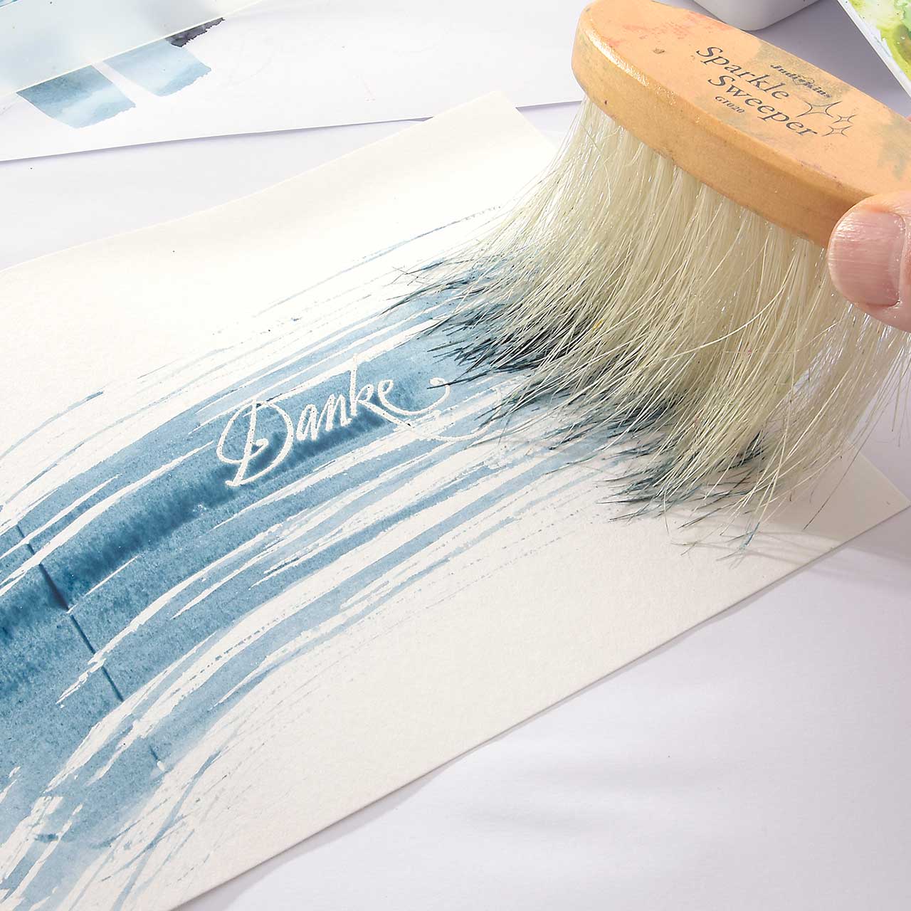 Nehmen Sie erneut blaue Farbe auf und machen Sie einen breiten Strich von der Rückseite der Karte, über das weiße Danke zum Rand der Karte an der rechten Seite.