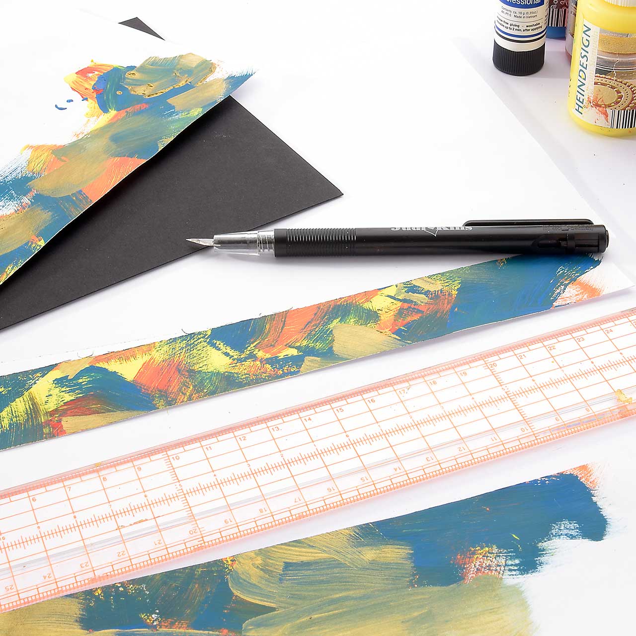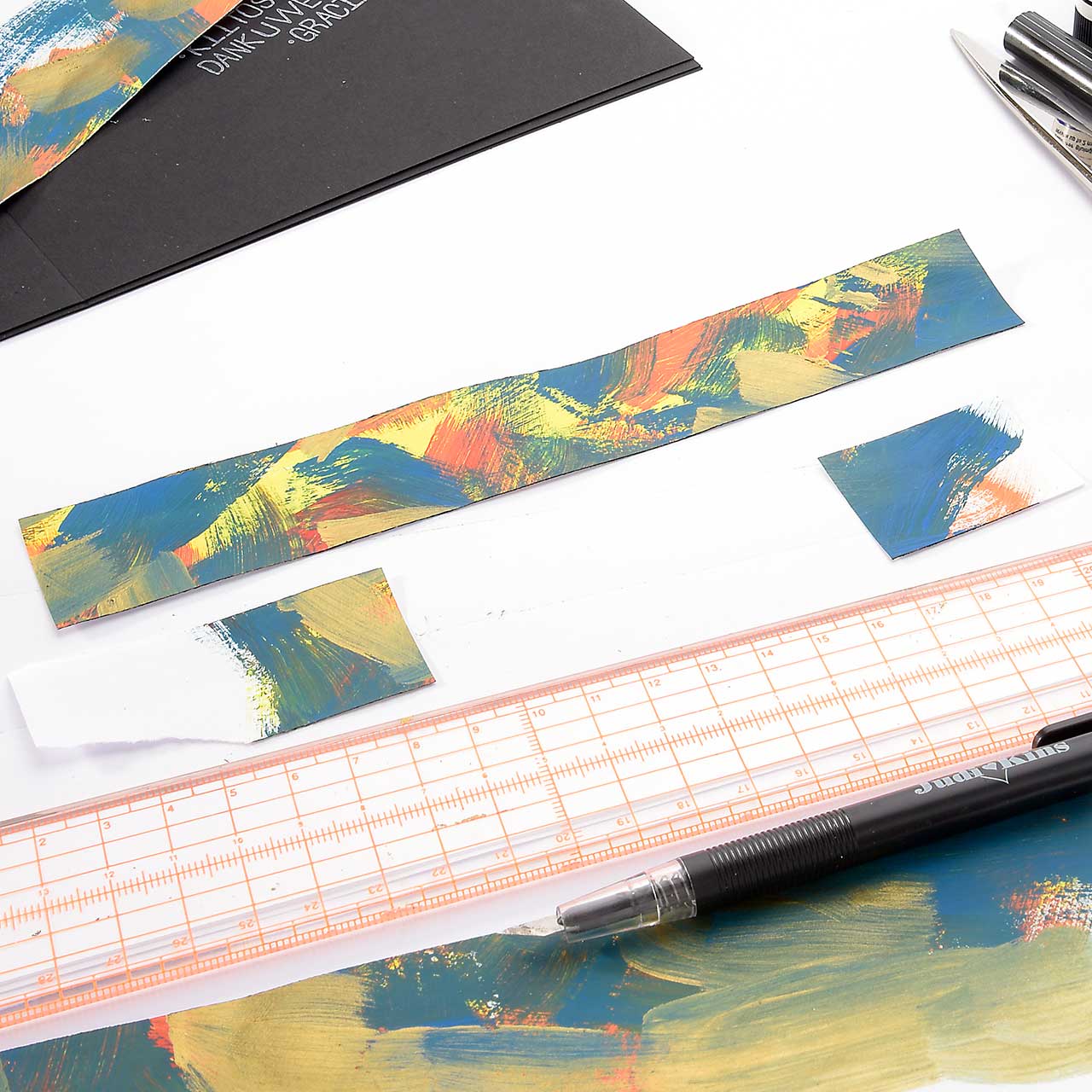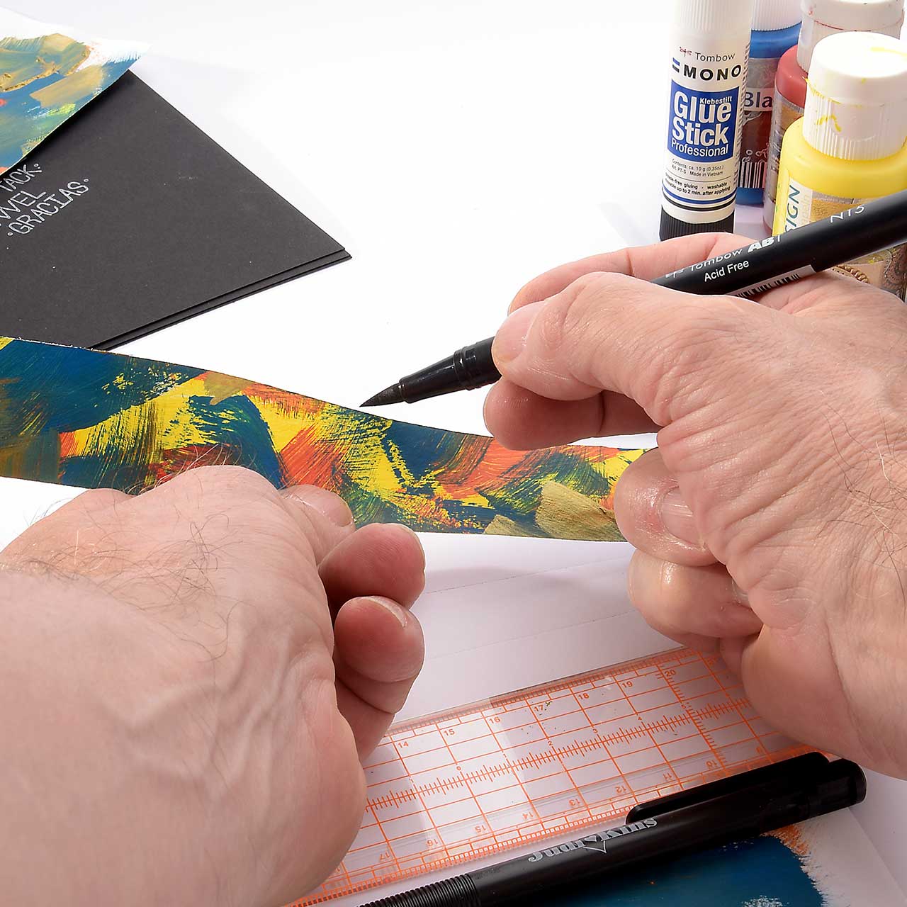 Schneiden Sie von der bunten Malerei einen etwa 3 cm breiten und 18 cm langen Streifen. Malen Sie die geschnittene Kante des Papierstreifens mit dem schwarzen Tombow Dual Brushpen (ABT) an.