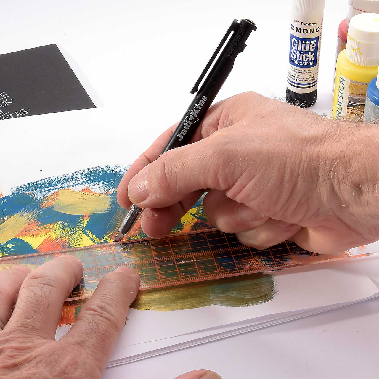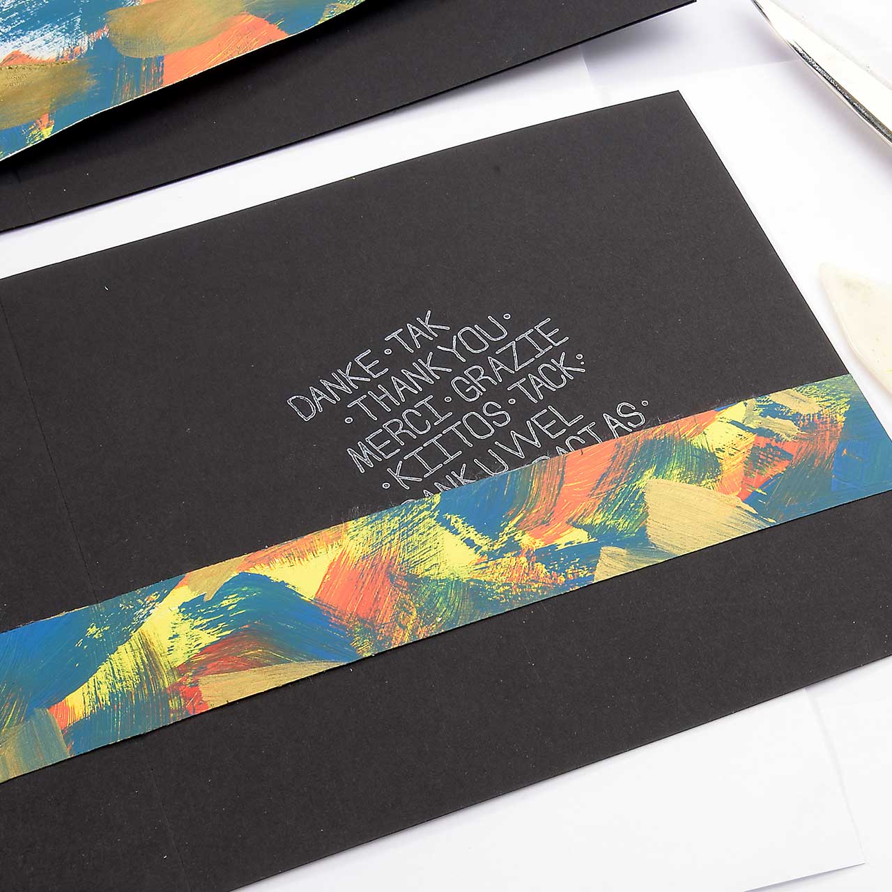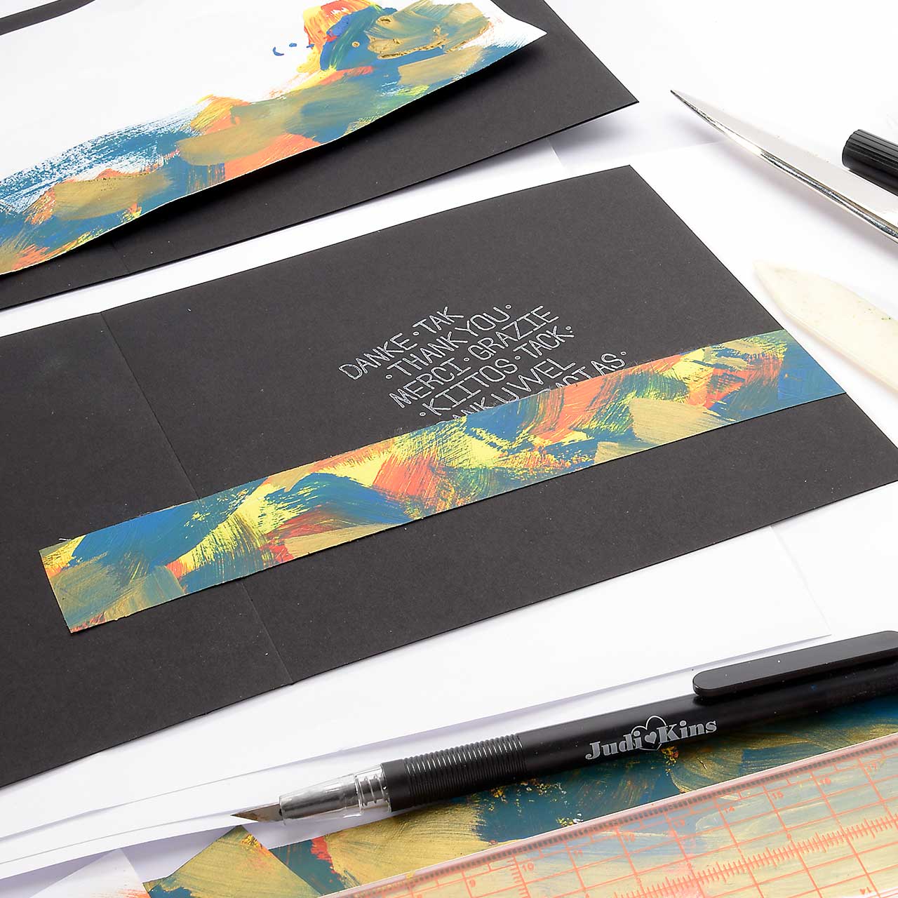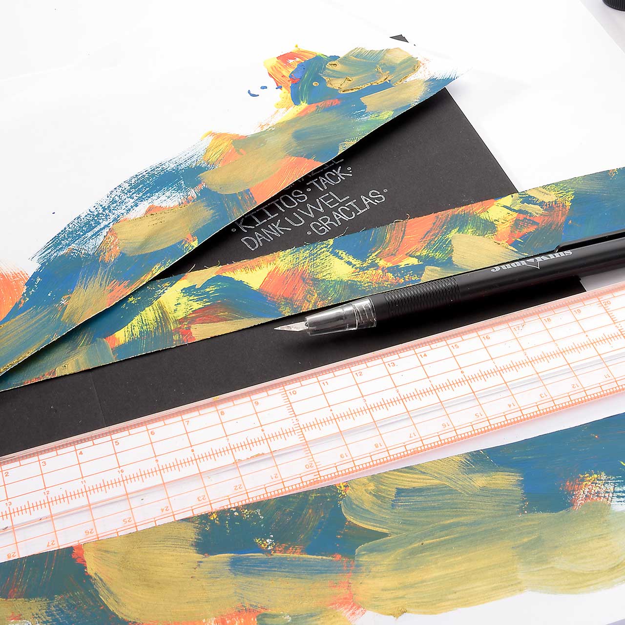 Schneiden Sie von der bunten Malerei einen etwa 3 cm breiten und 18 cm langen Streifen. Malen Sie die geschnittene Kante des Papierstreifens mit dem schwarzen Tombow Dual Brushpen (ABT) an.