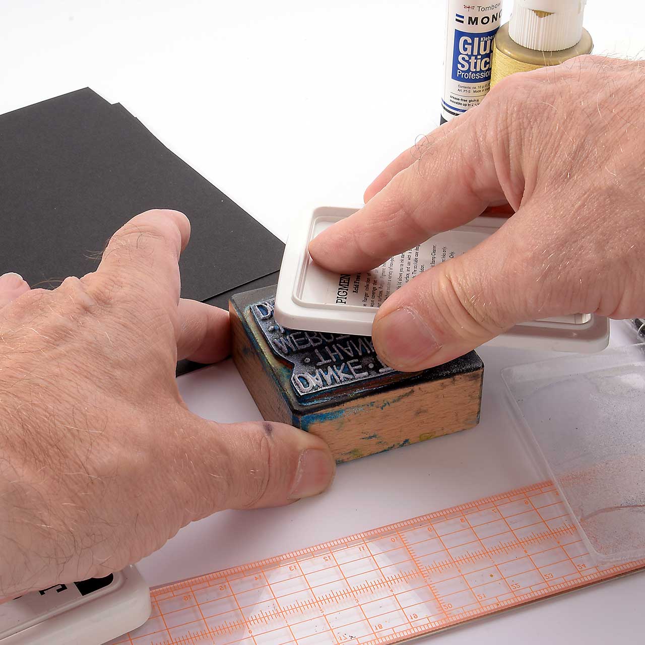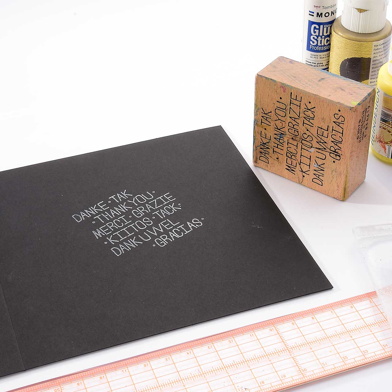 Stempeln Sie das „Danke·Tak“ Textmotiv mit dem weißen Pigment Stempelkissen in die Mitte Ihrer Karte.