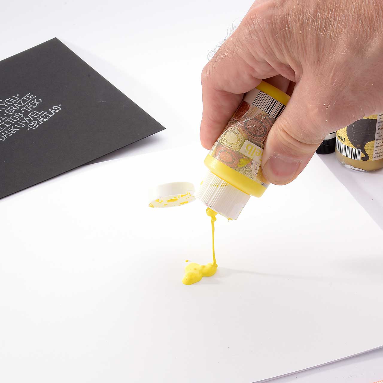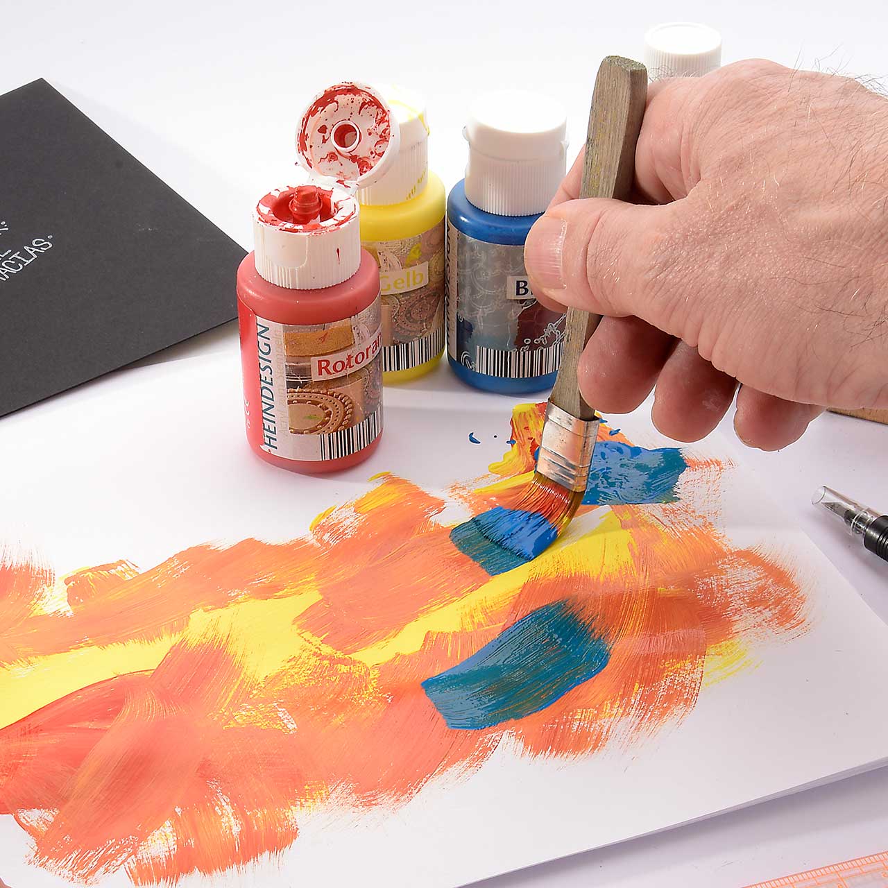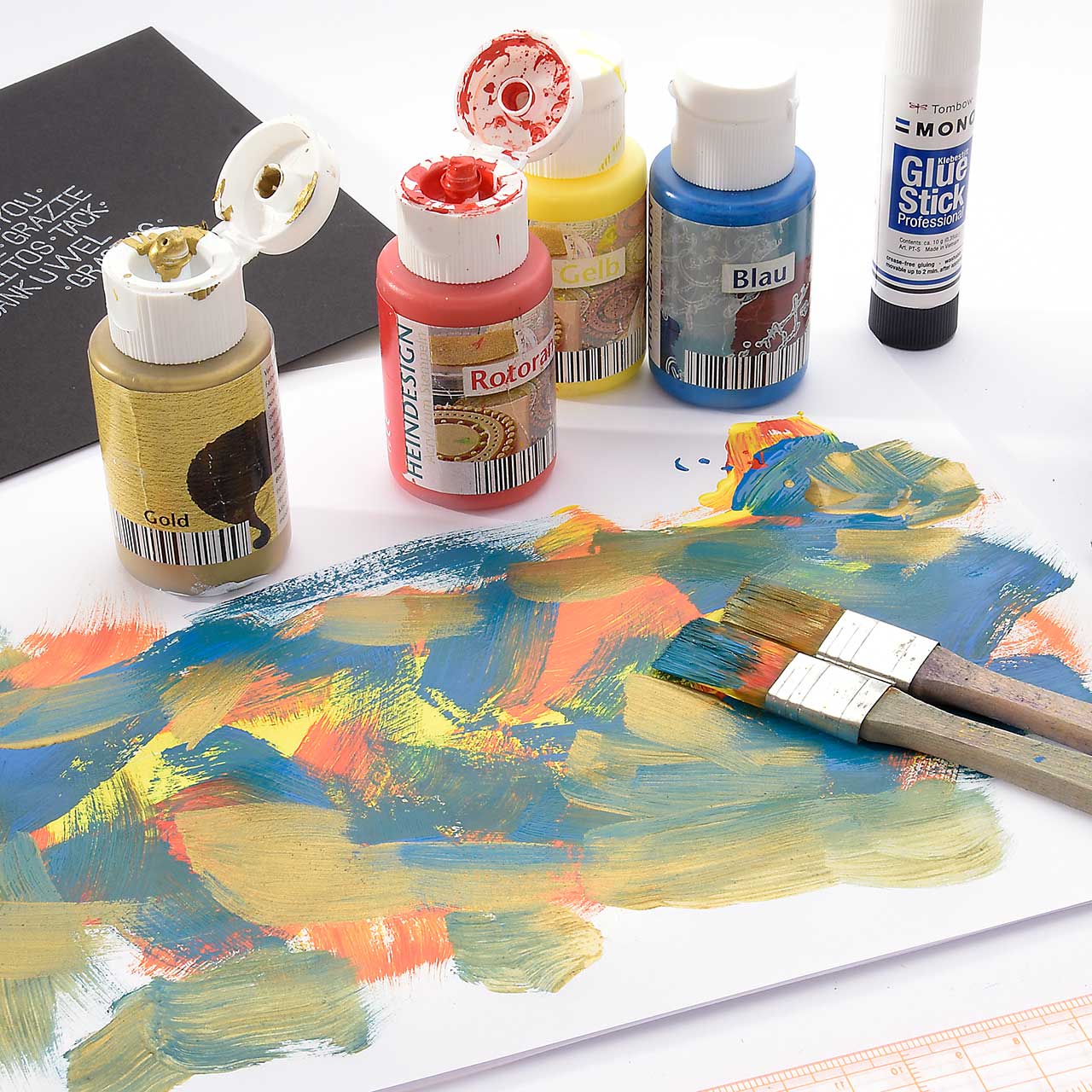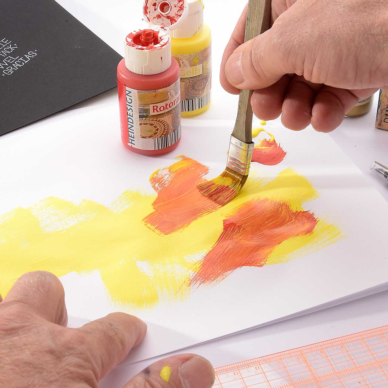 Malen Sie mit den Acrylfarben Gelb, Rot, Blau und Gold ein wildes, buntes Pinselstrichs Muster auf ein Blatt Kopierpapier. Beginnen Sie mit der gelben Farbe und malen Sie später rote, blaue und goldene Farbe hinzu.