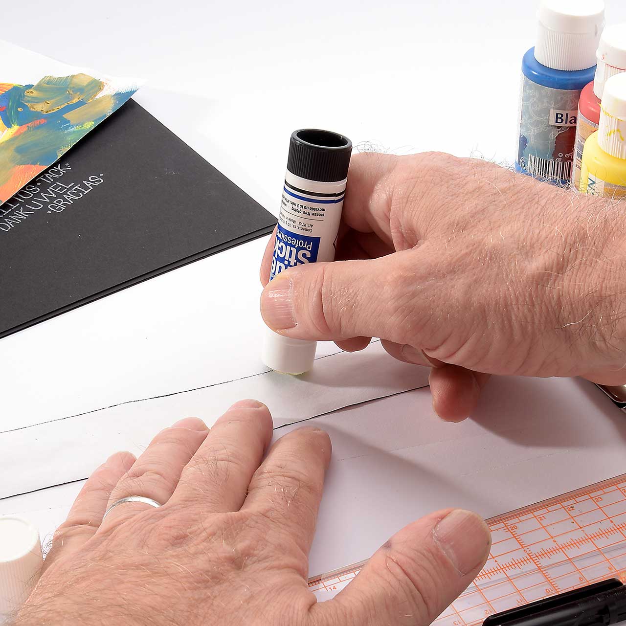 Kleben Sie den Streifen mit dem Tombow Klebestick so auf Ihre Karte, dass ein Stück von dem „Danke·Tak“ Motiv abgedeckt wird.