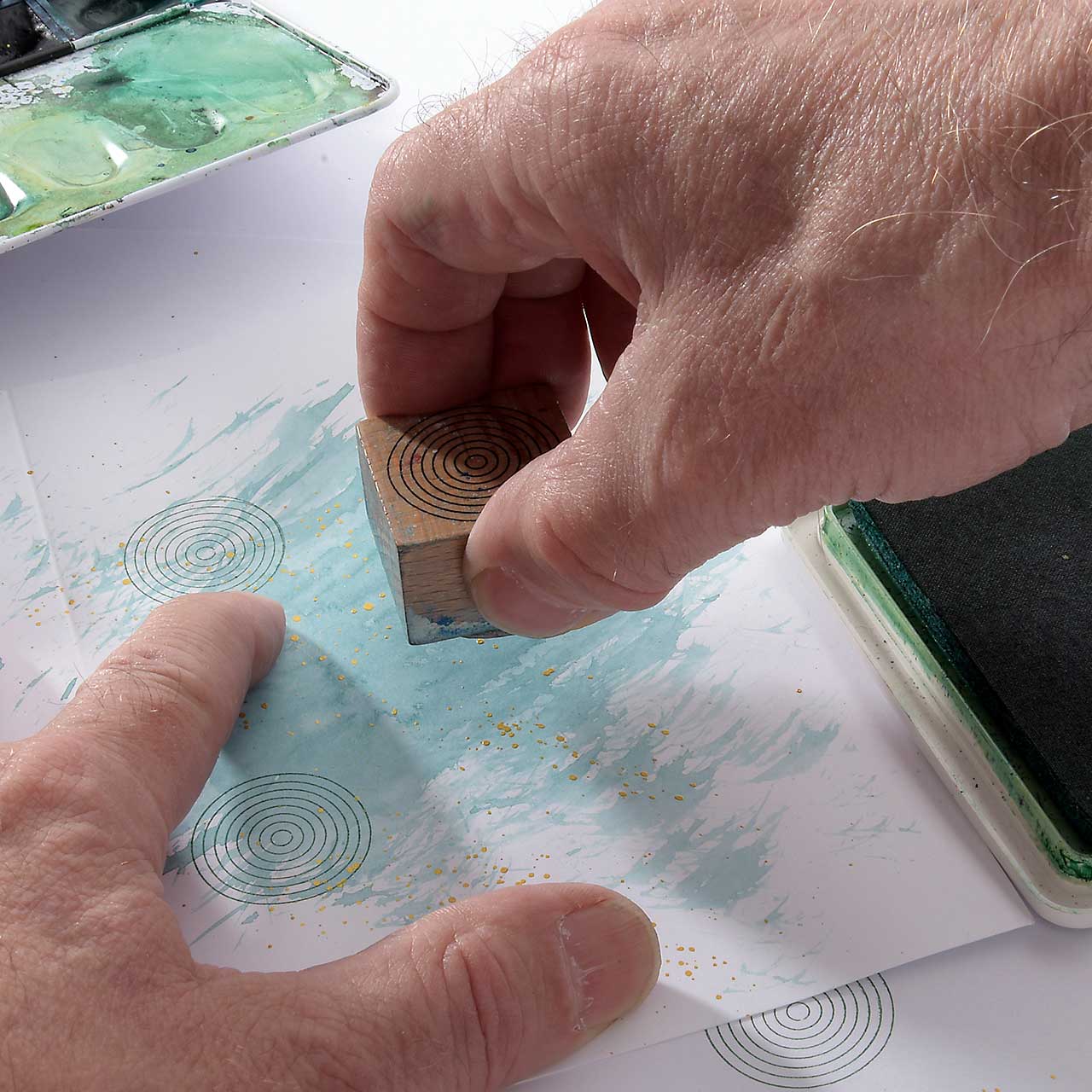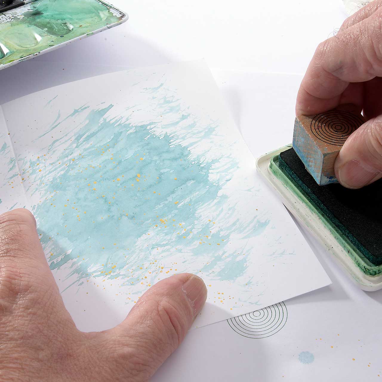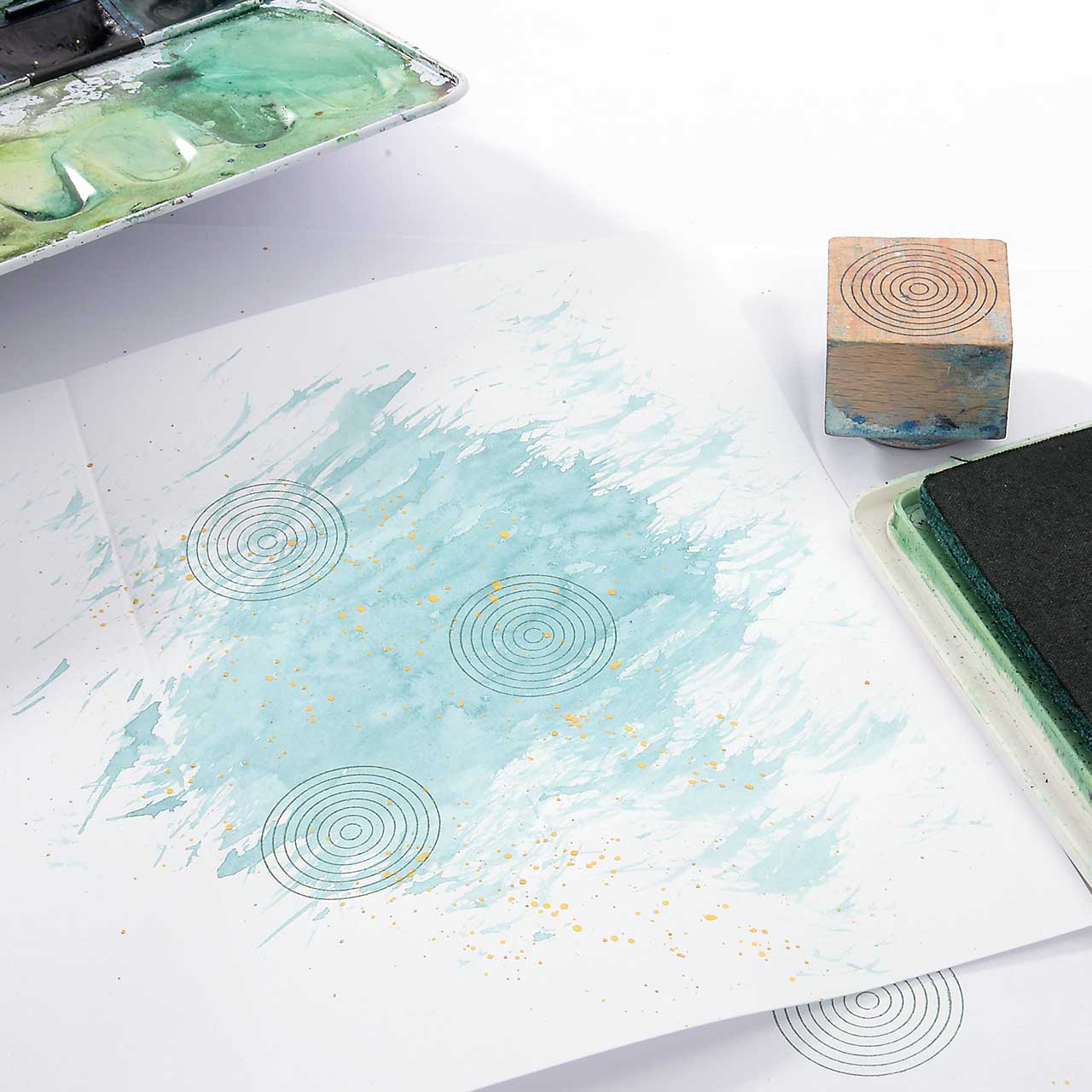 Stempeln Sie das Kreis Motiv mit dem dunkelgrünen Stempelkissen dreimal verteilt auf ihre Karte. Für ein gleichmäßiges Druckbild färben Sie den Stempel vor jedem Abdruck erneut ein.