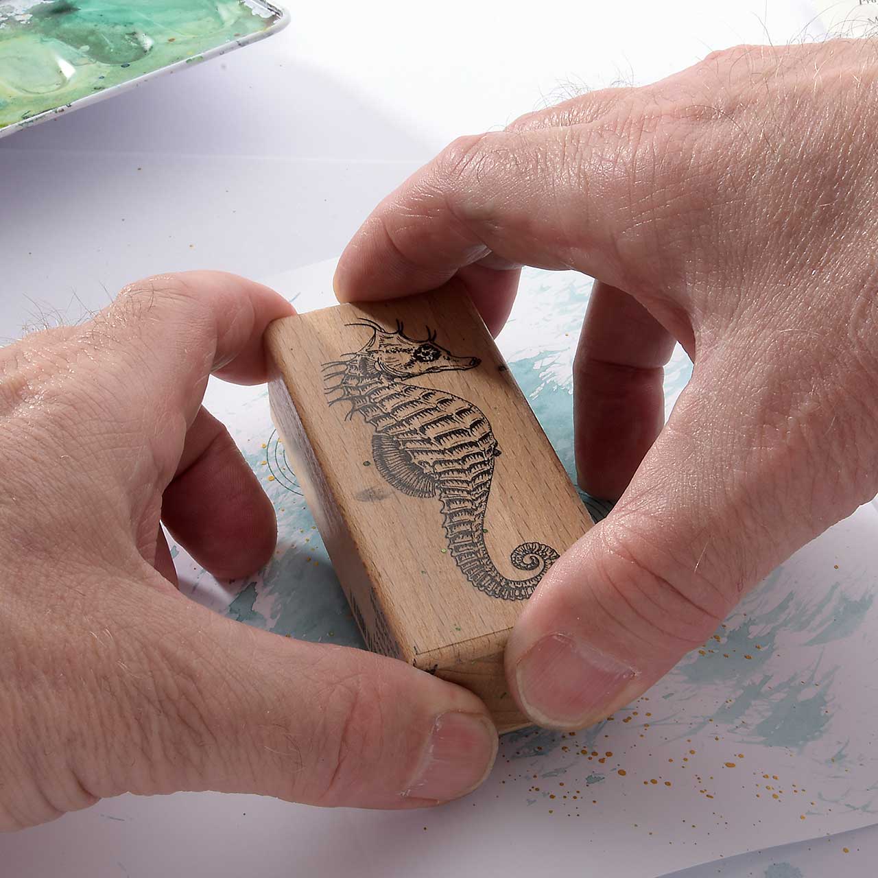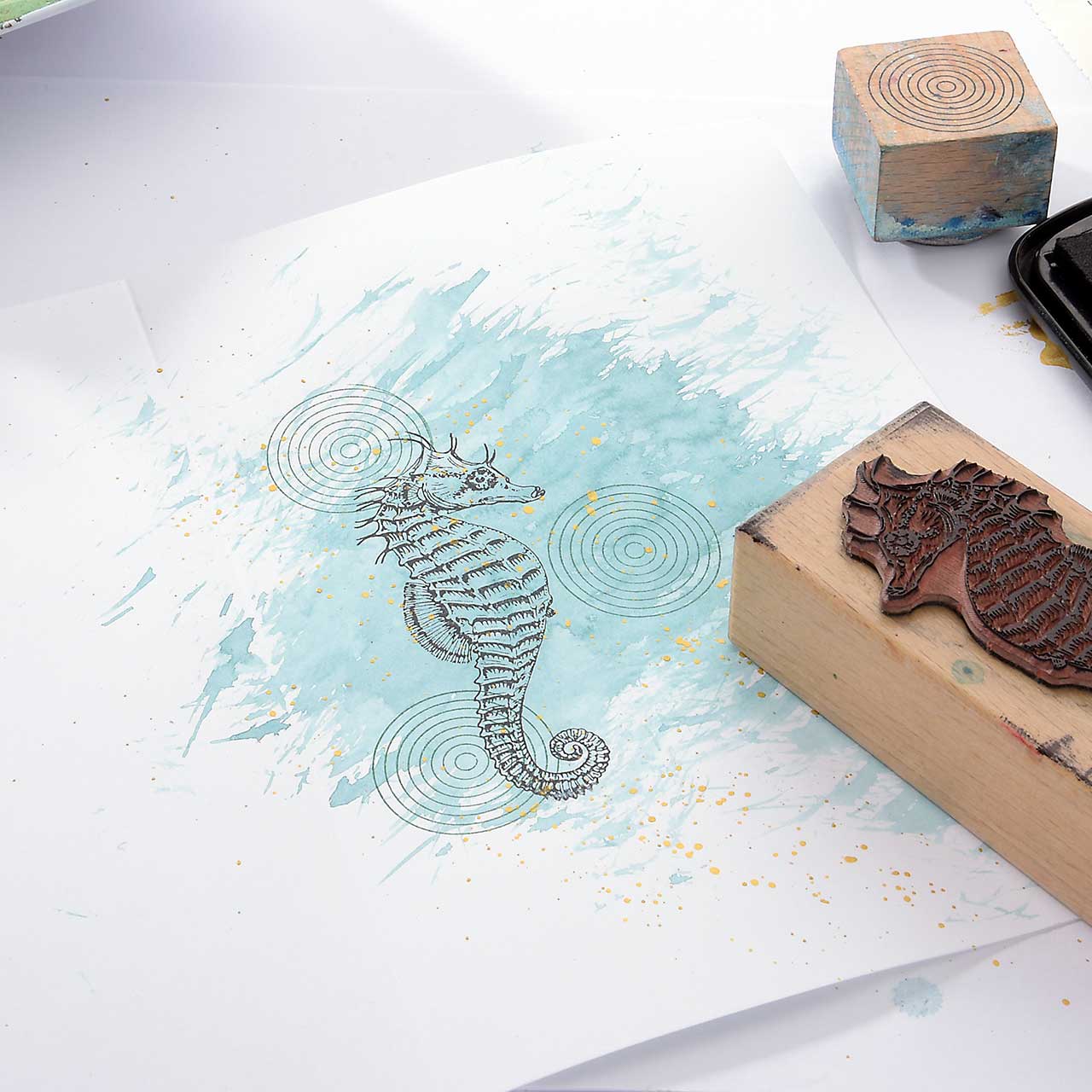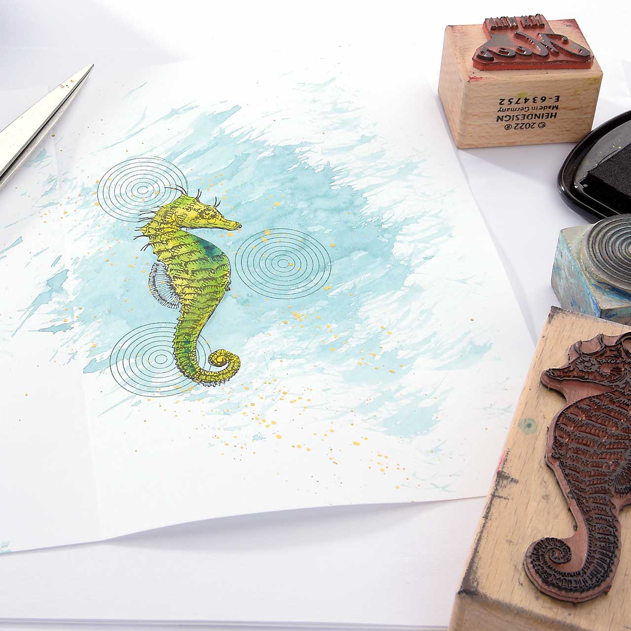 Stempeln Sie das Seepferdchen Motiv mit dem schwarzen Stempelkissen in die linke Mitte Ihrer Karte.