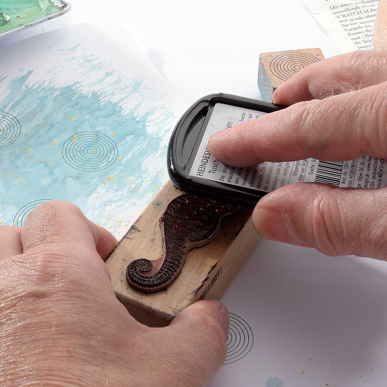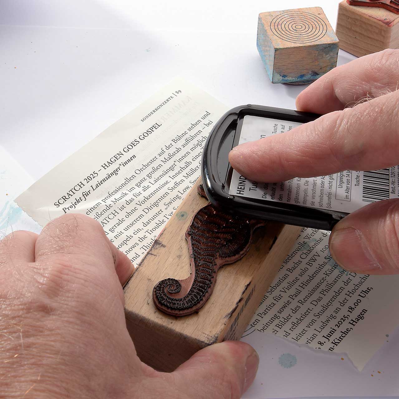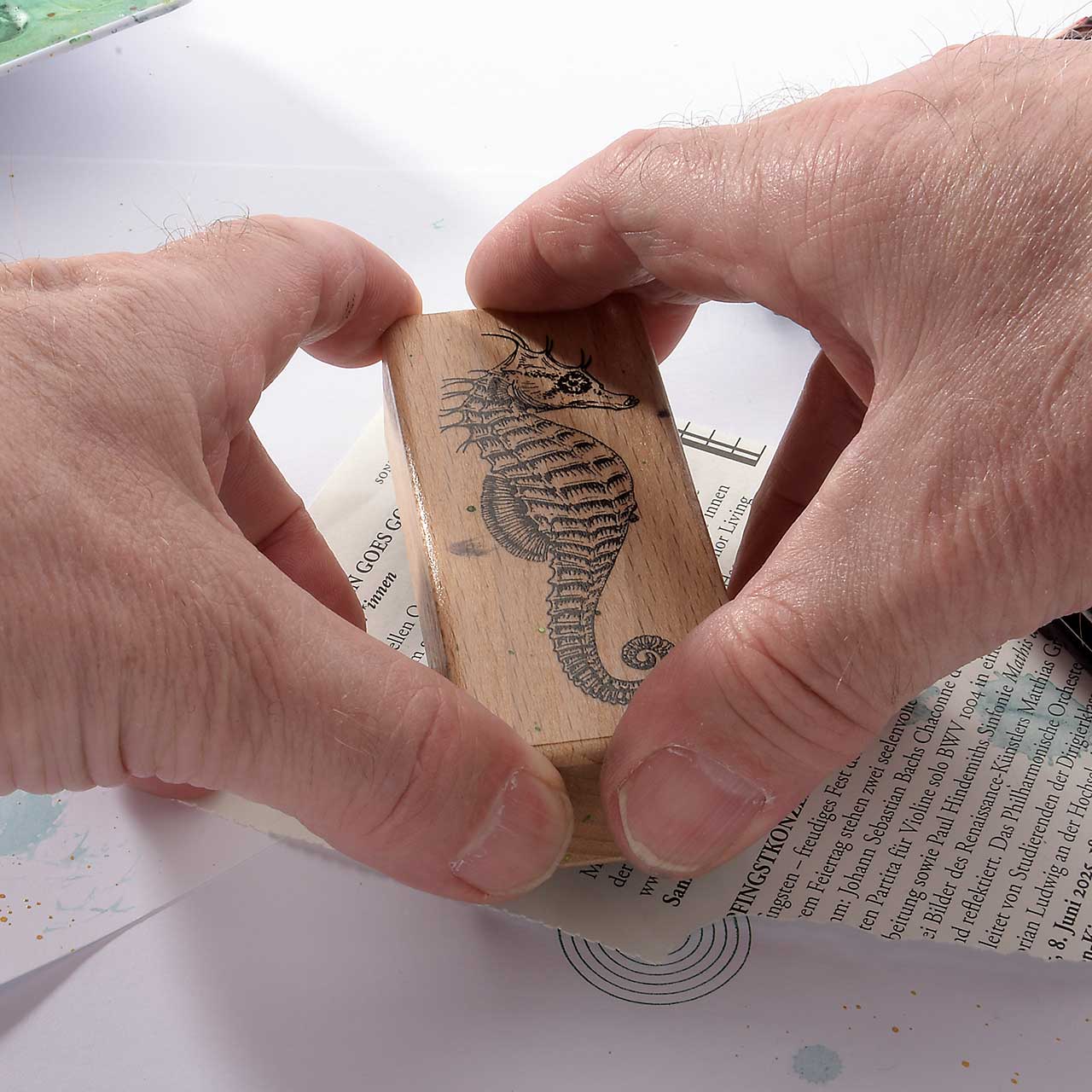 Stempeln Sie das Seepferdchen Motiv ein weiteres Mal mit dem schwarzen Stempelkissen auf eine alte Buchseite.