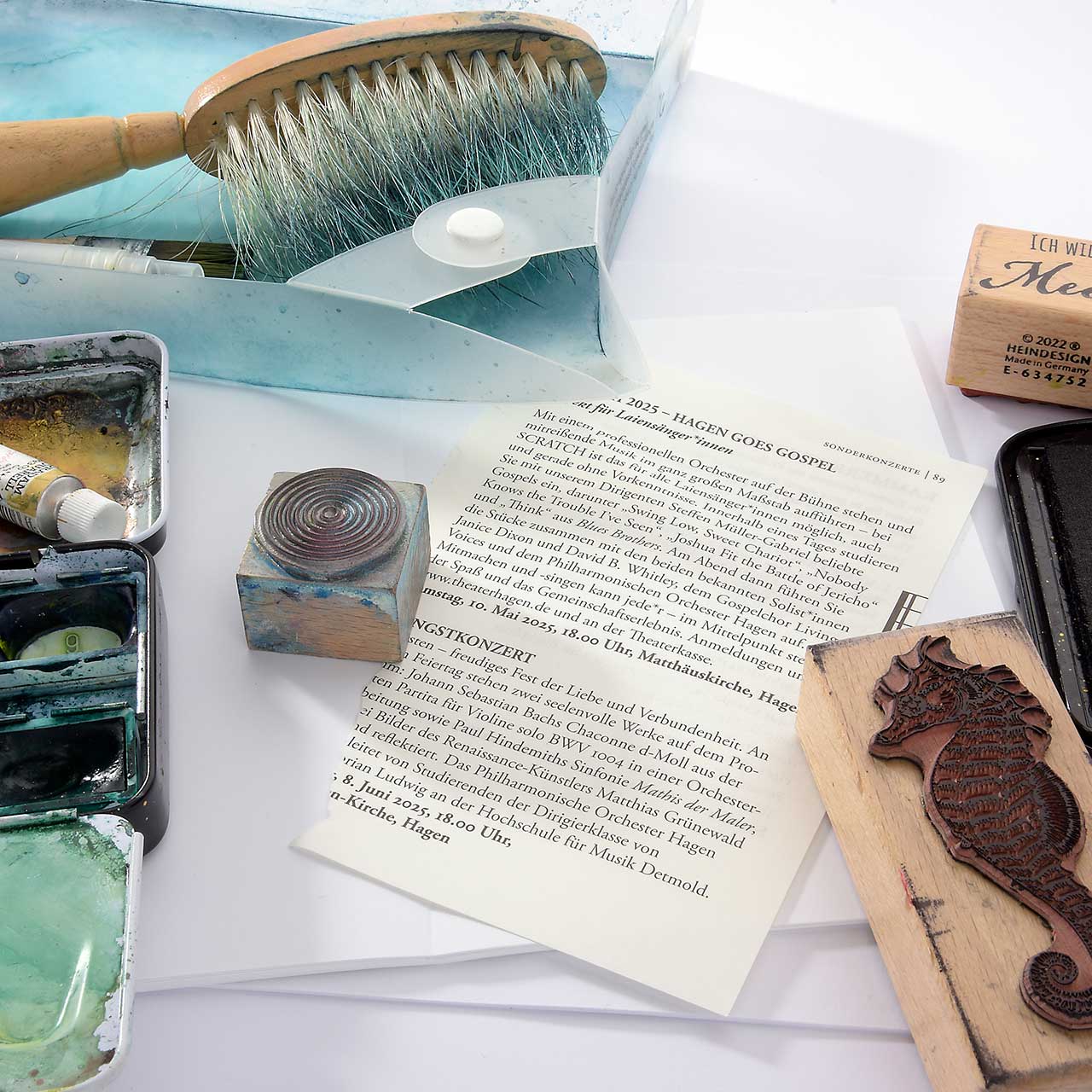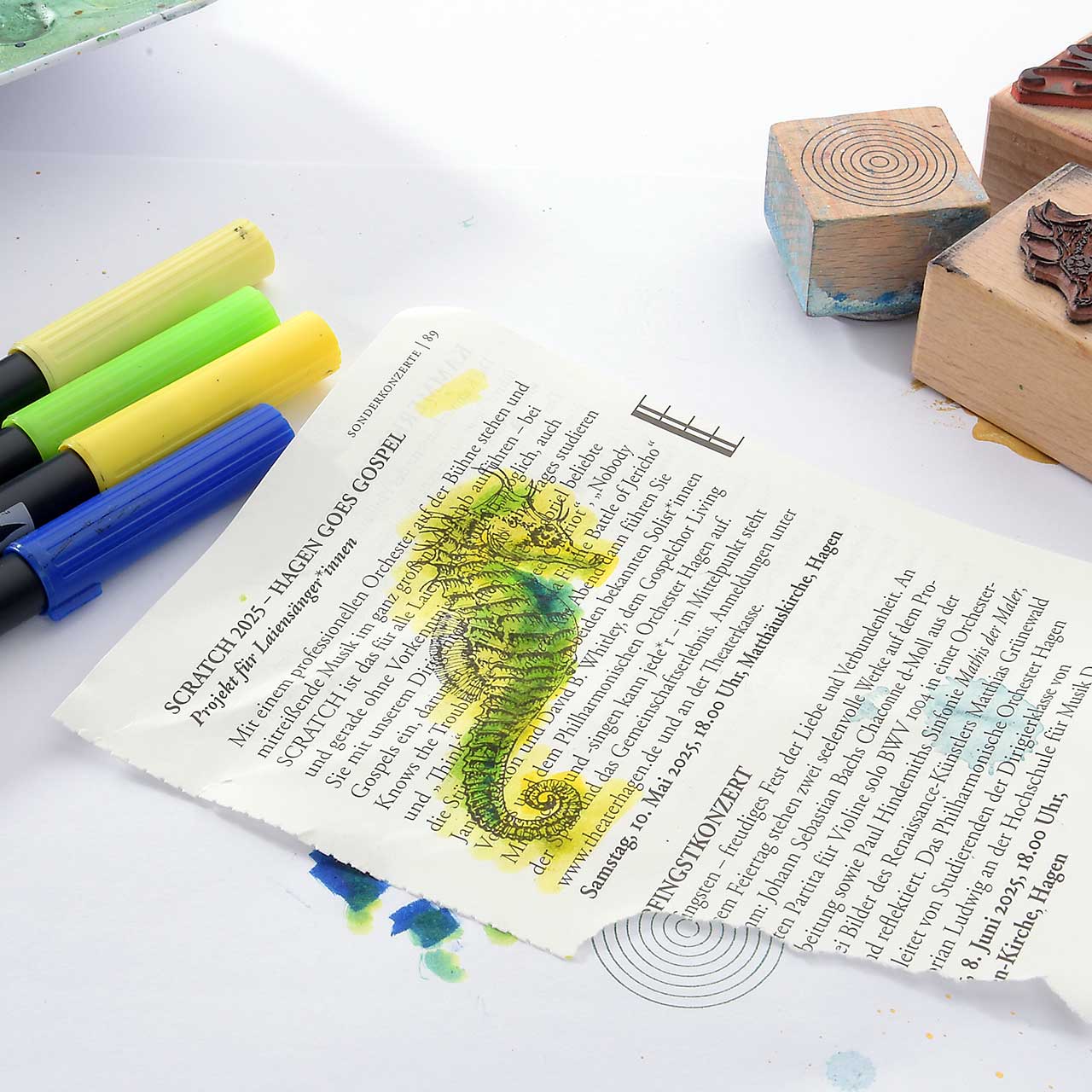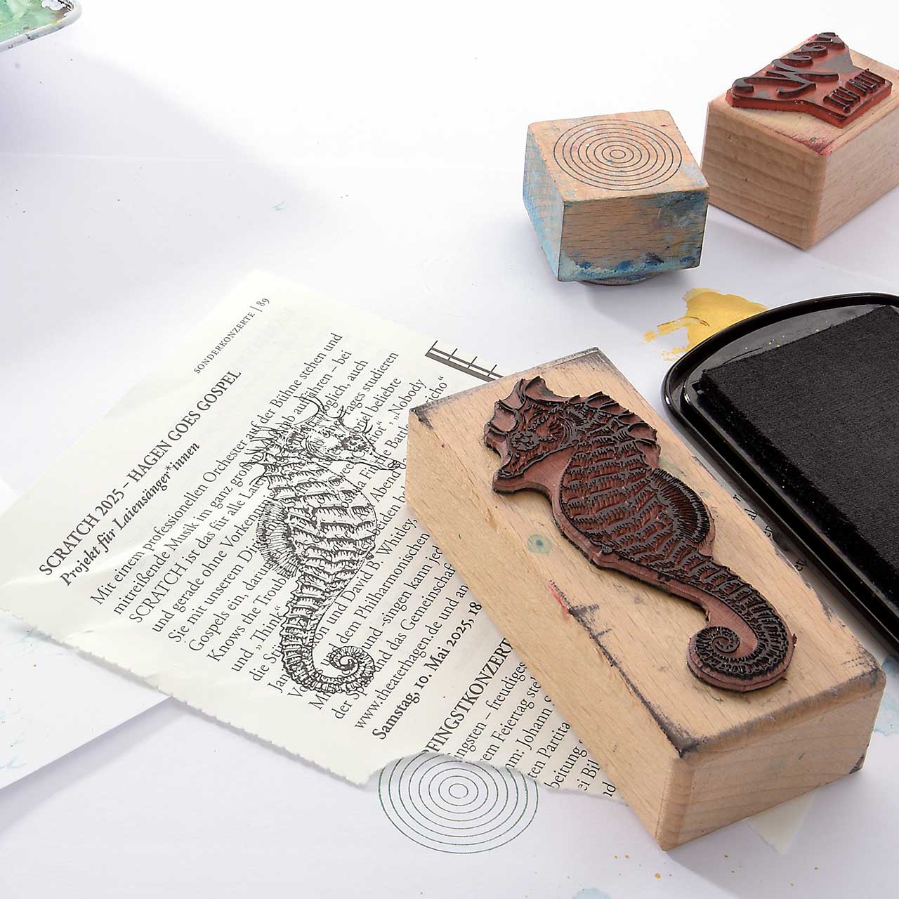 Stempeln Sie das Seepferdchen Motiv ein weiteres Mal mit dem schwarzen Stempelkissen auf eine alte Buchseite.