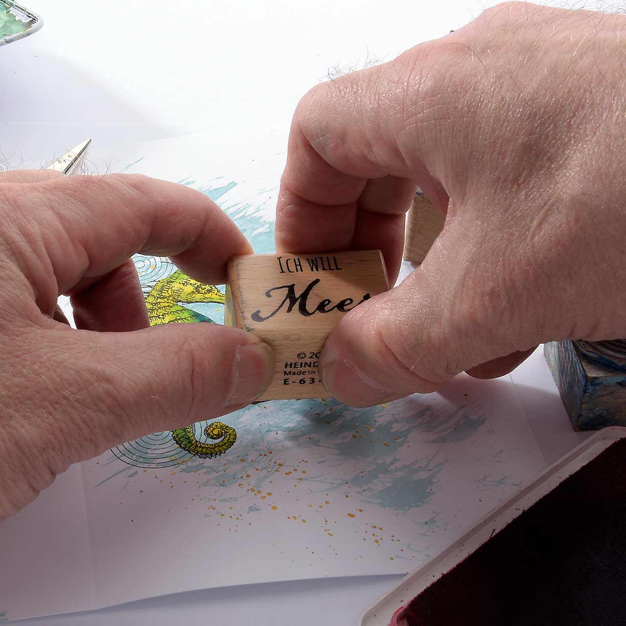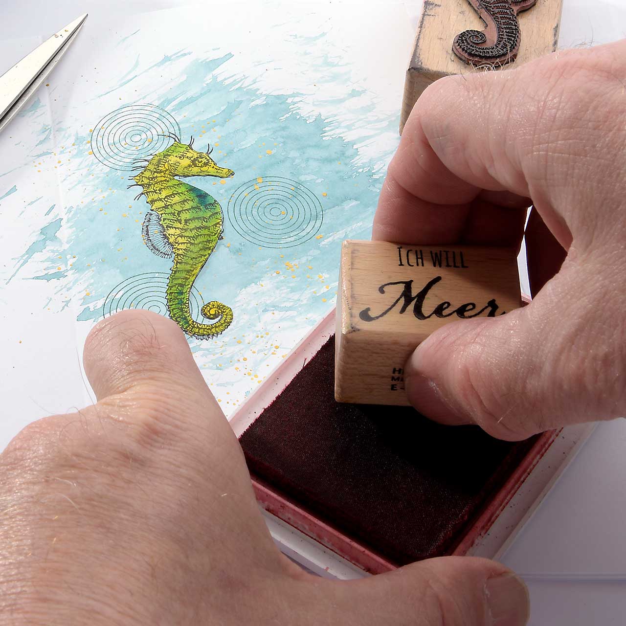 Stempeln Sie das „Ich will Meer“ Textmotiv mit dem roten Stempelkissen rechts neben das Seepferdchen Motiv auf ihre Karte.