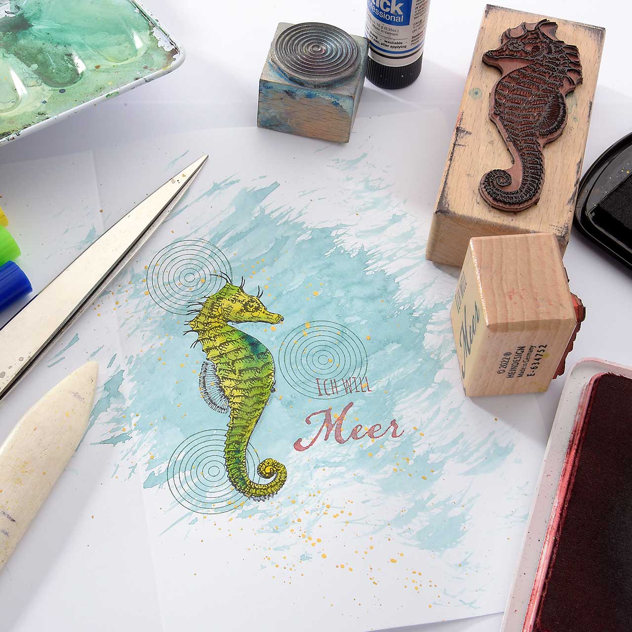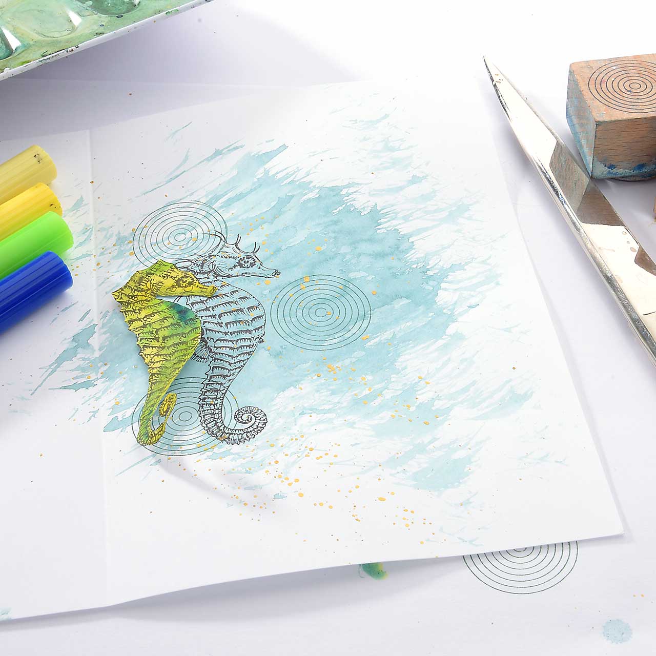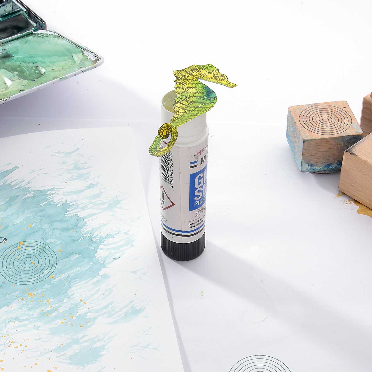 Schneiden Sie das Seepferdchen Motiv aus der Buchseite aus und kleben Sie es mit dem Tombow Klebestick auf das zuvor gestempelte Seepferdchen Motiv auf Ihrer Karte.