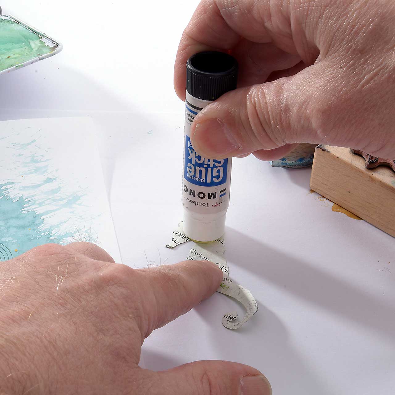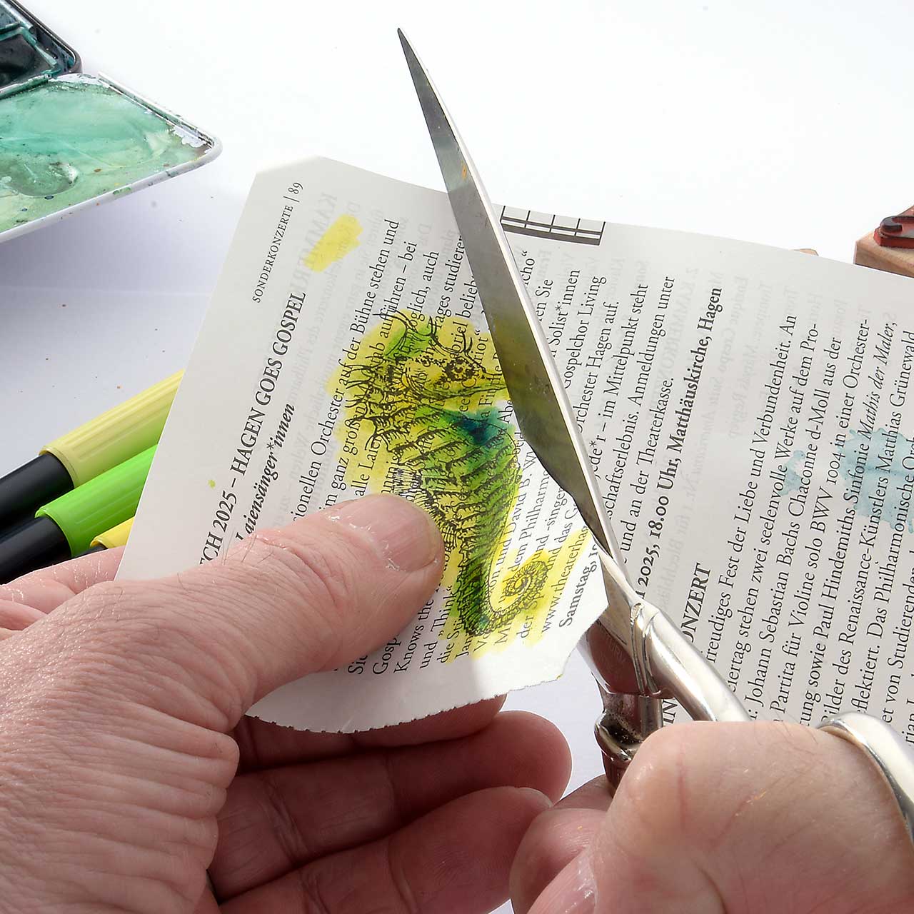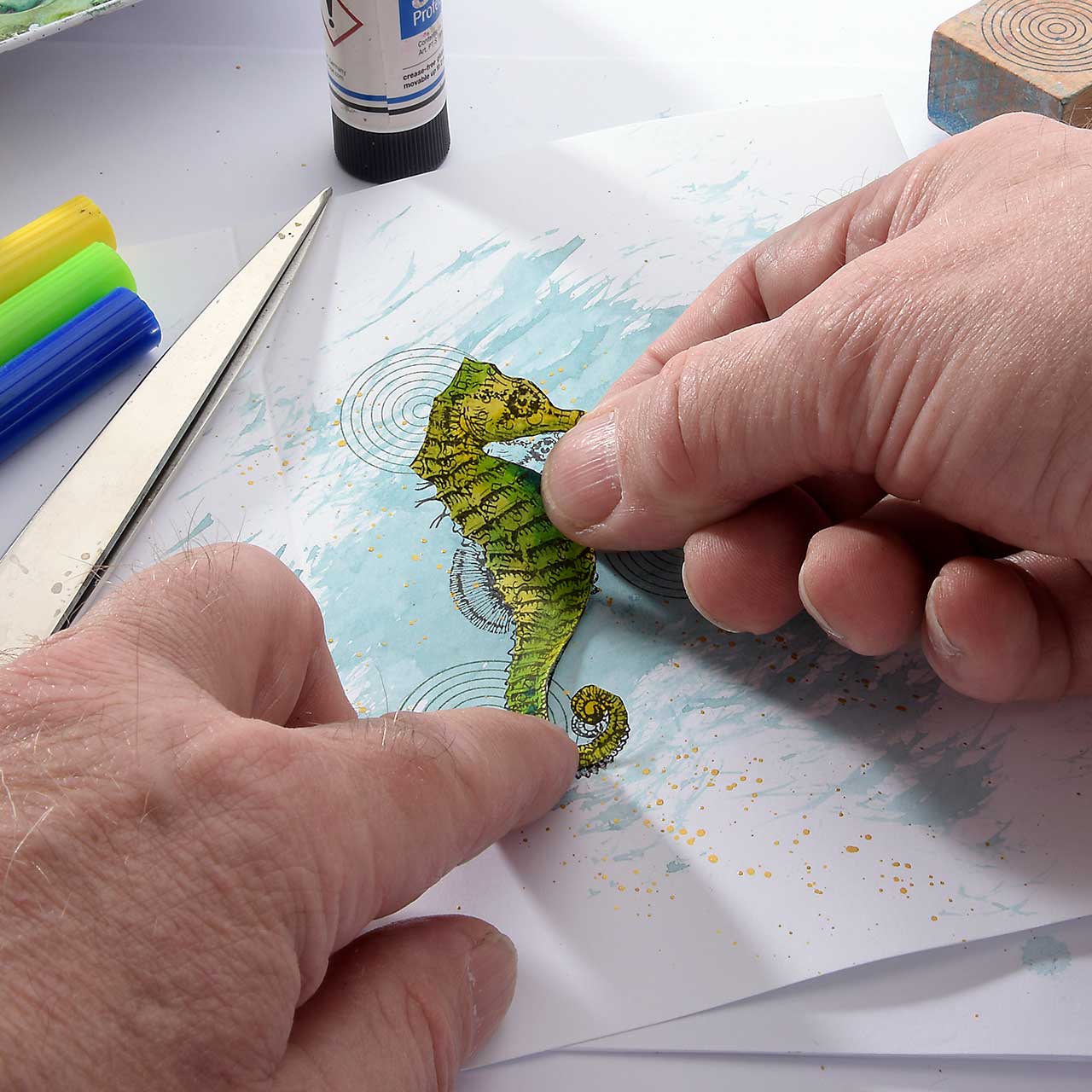 Schneiden Sie das Seepferdchen Motiv aus der Buchseite aus und kleben Sie es mit dem Tombow Klebestick auf das zuvor gestempelte Seepferdchen Motiv auf Ihrer Karte.