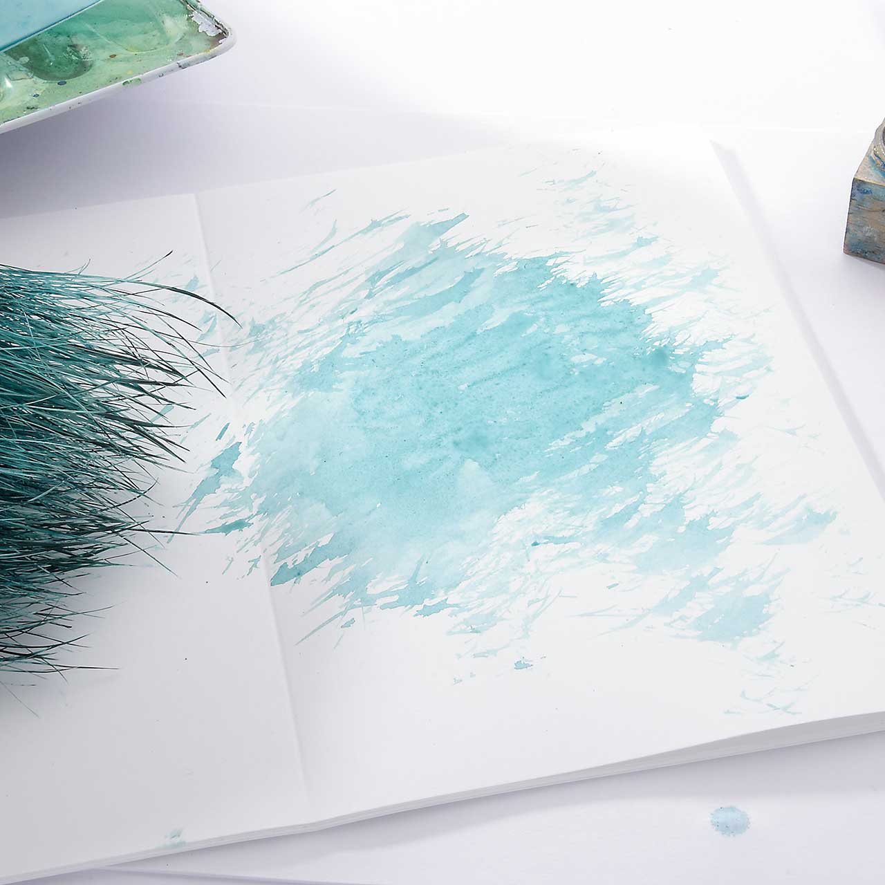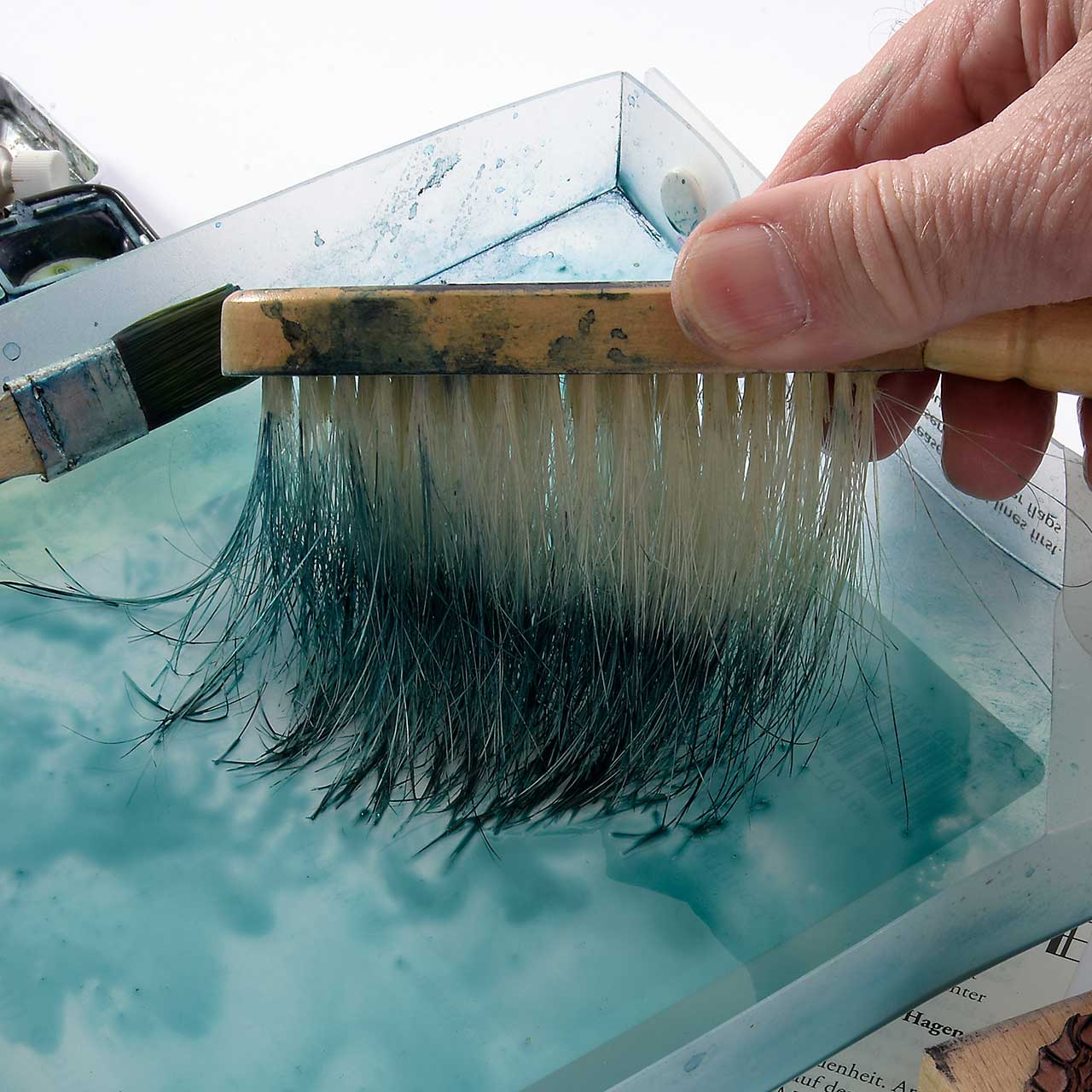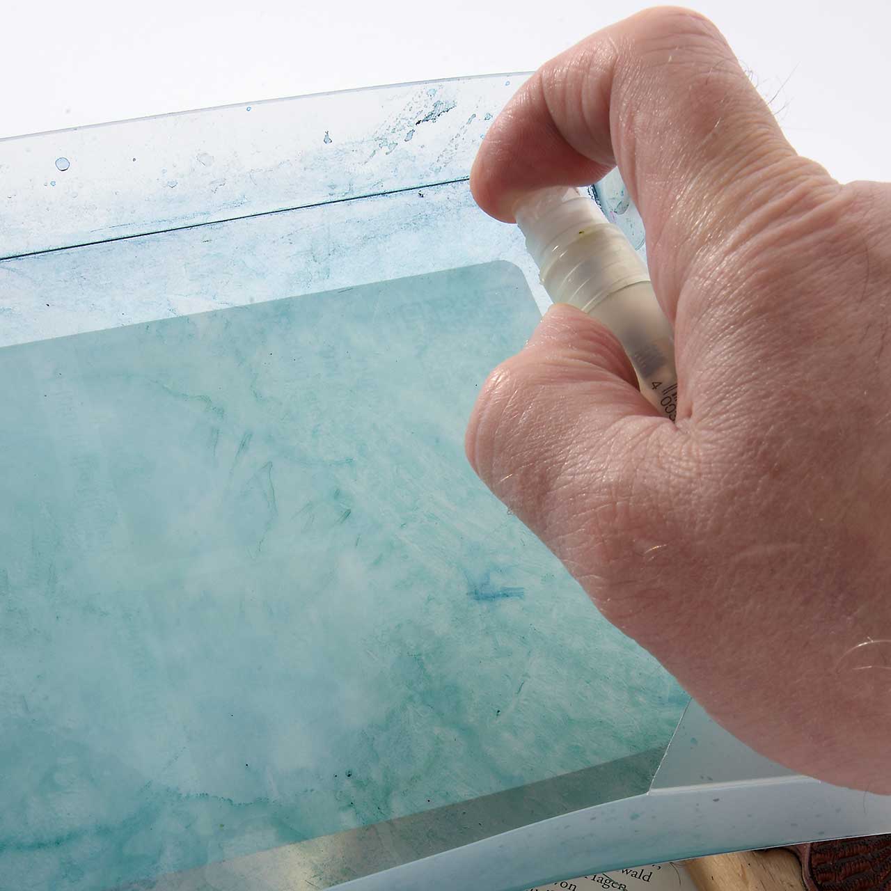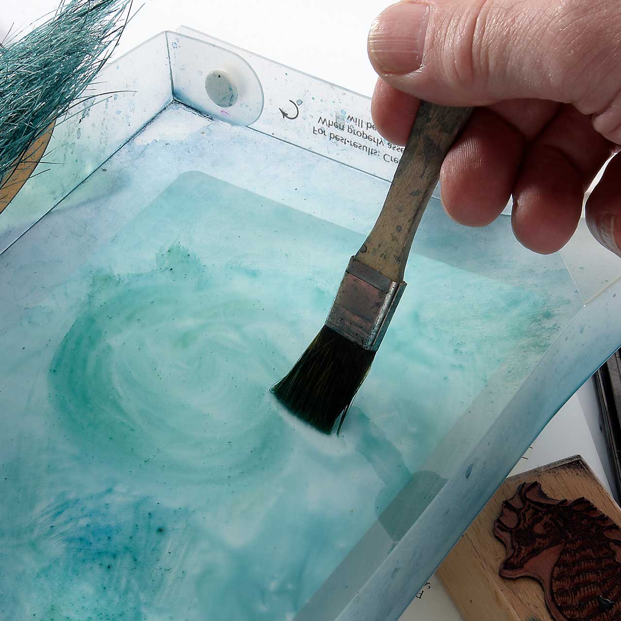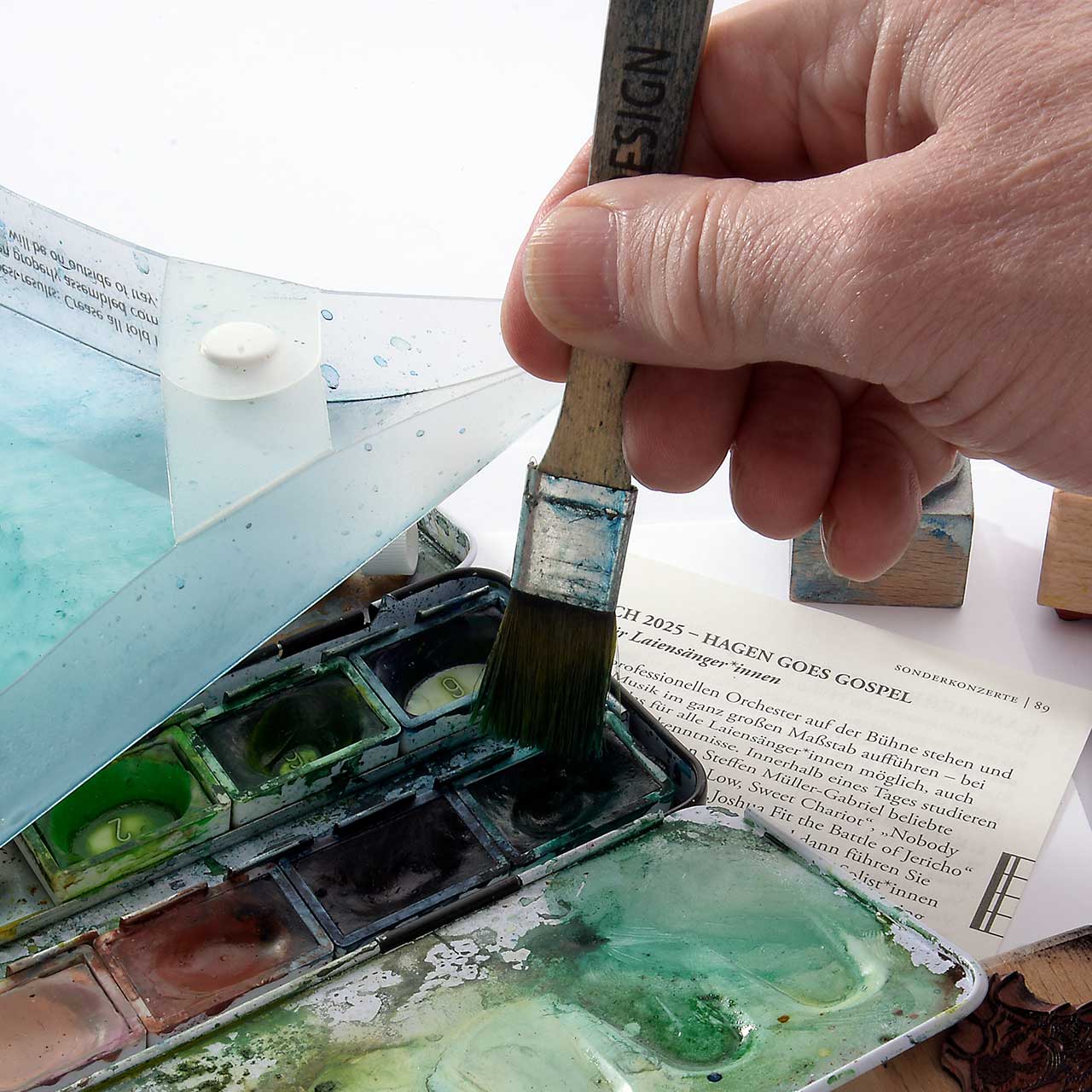 Bereiten Sie das SnappyTray mit Wasser und blauer Aquarellfarbe vor. Indem Sie mit dem Sprühfläschchen Wasser in das SnappyTray sprühen und mit dem Pinsel blaue Aquarellfarbe hinzufügen. Sie benötigen eine mittelgroße, dunkelblaue Pfütze in dem Schälchen.