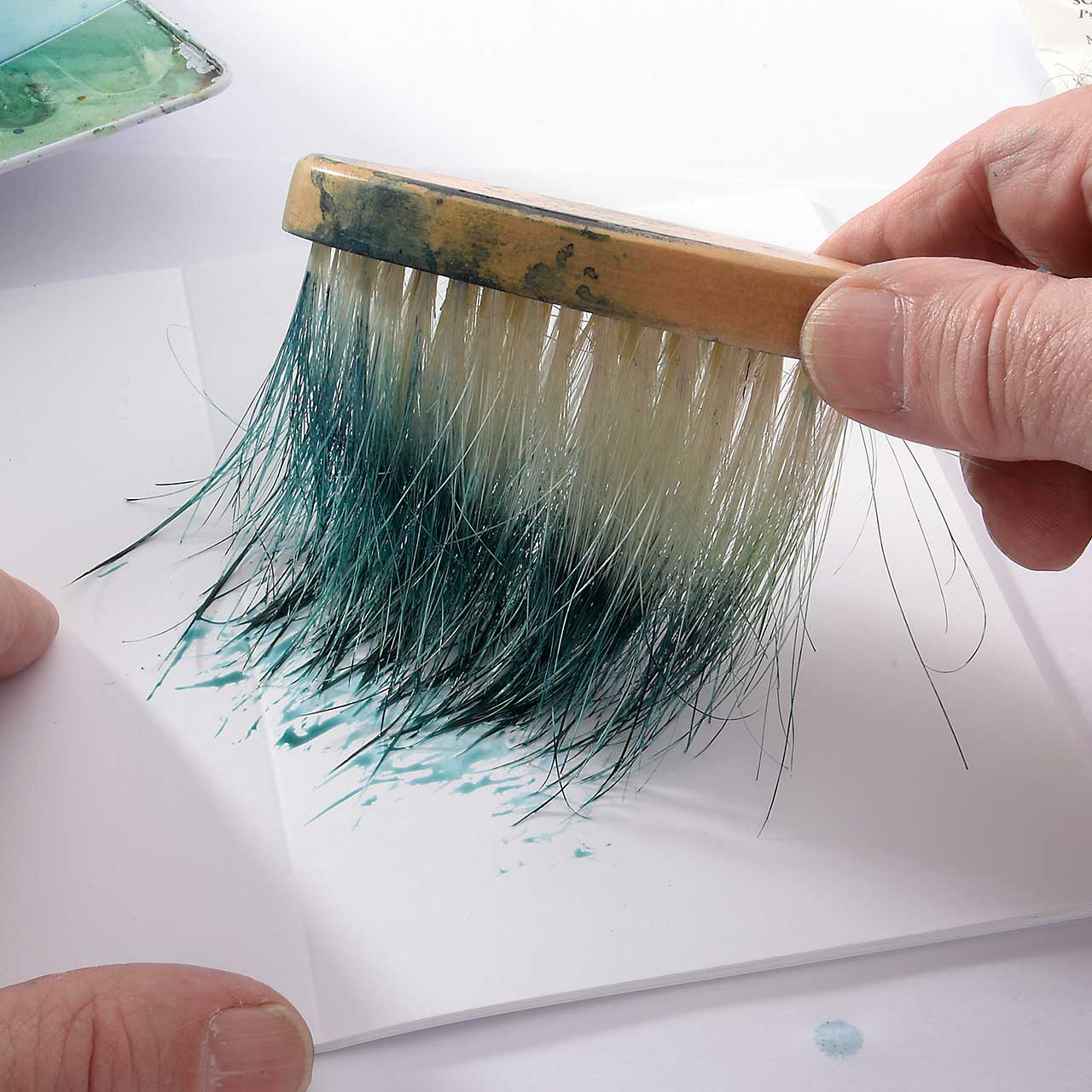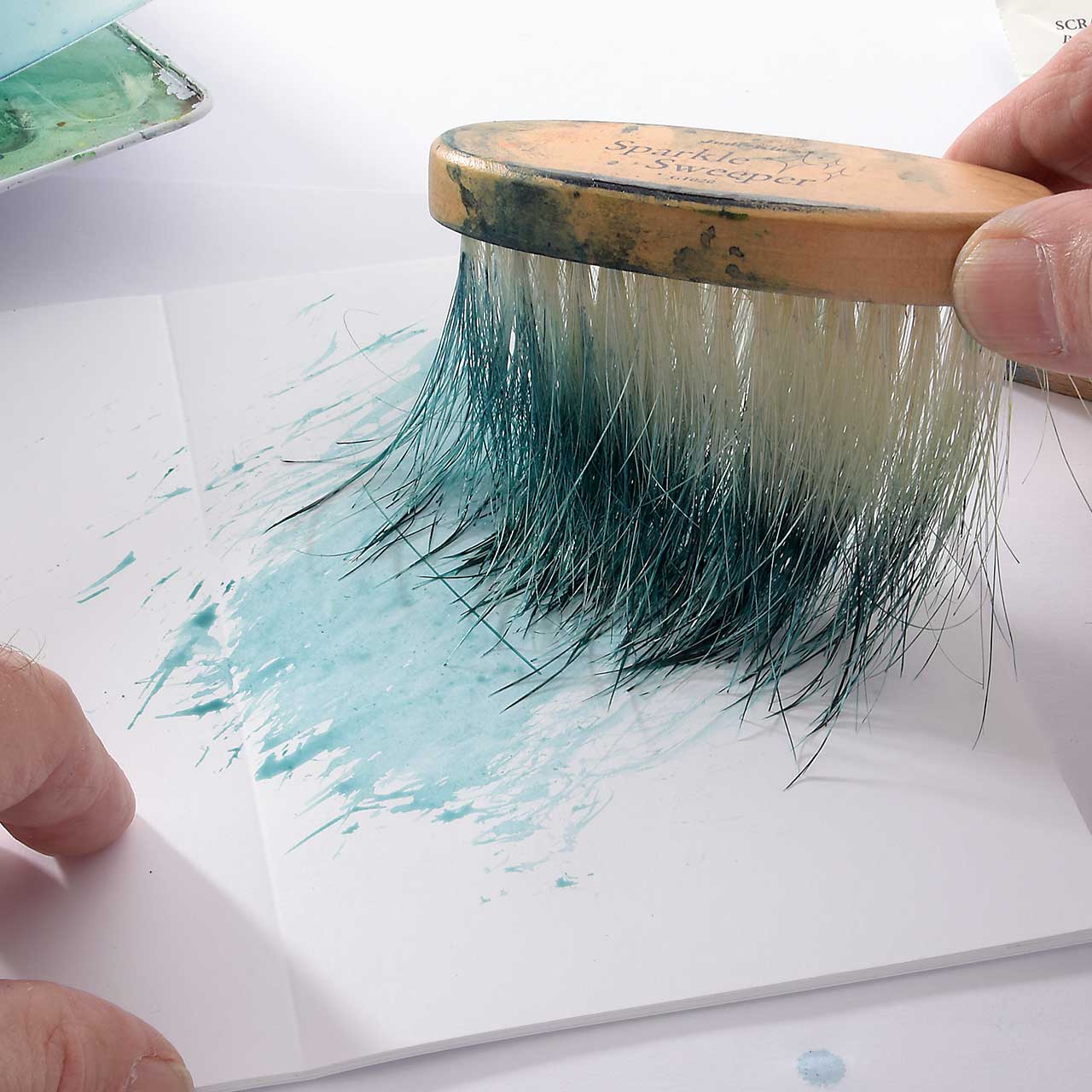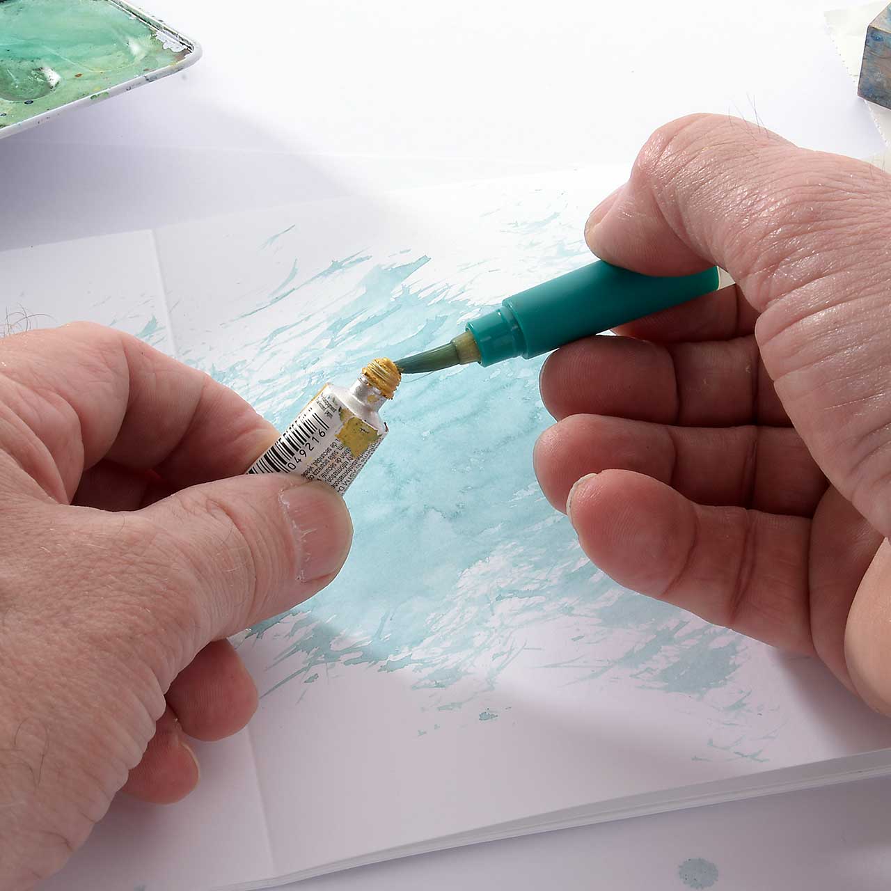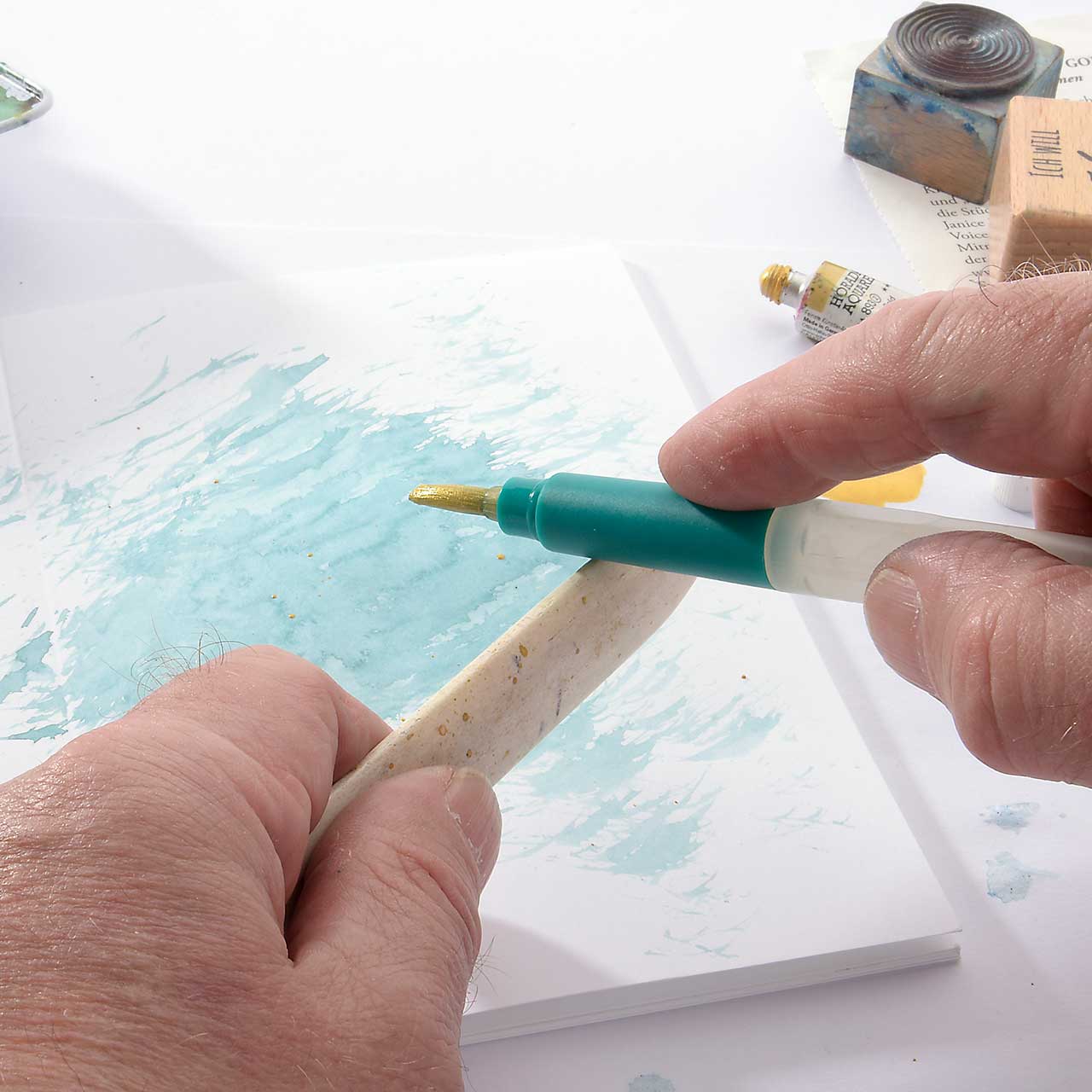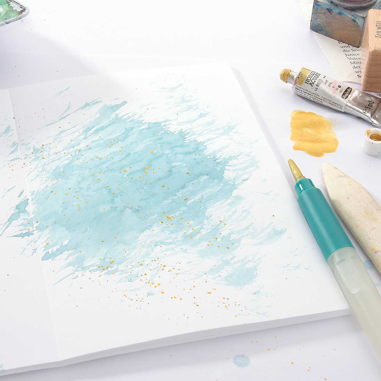 Nehmen Sie mit dem nassen Füllerpinsel etwas goldene Farbe auf und klecksen Sie einige Sprenkel auf Ihre Karte.