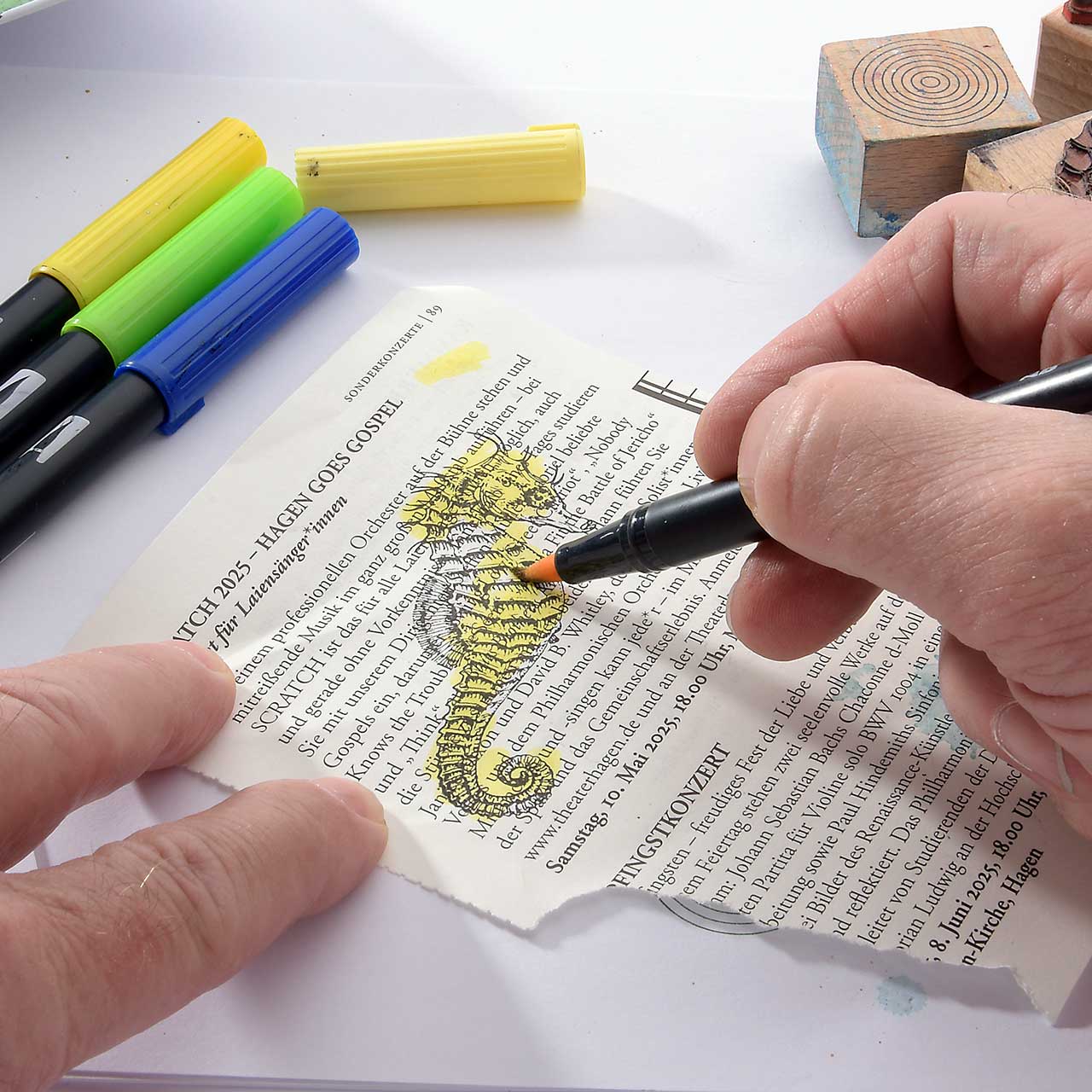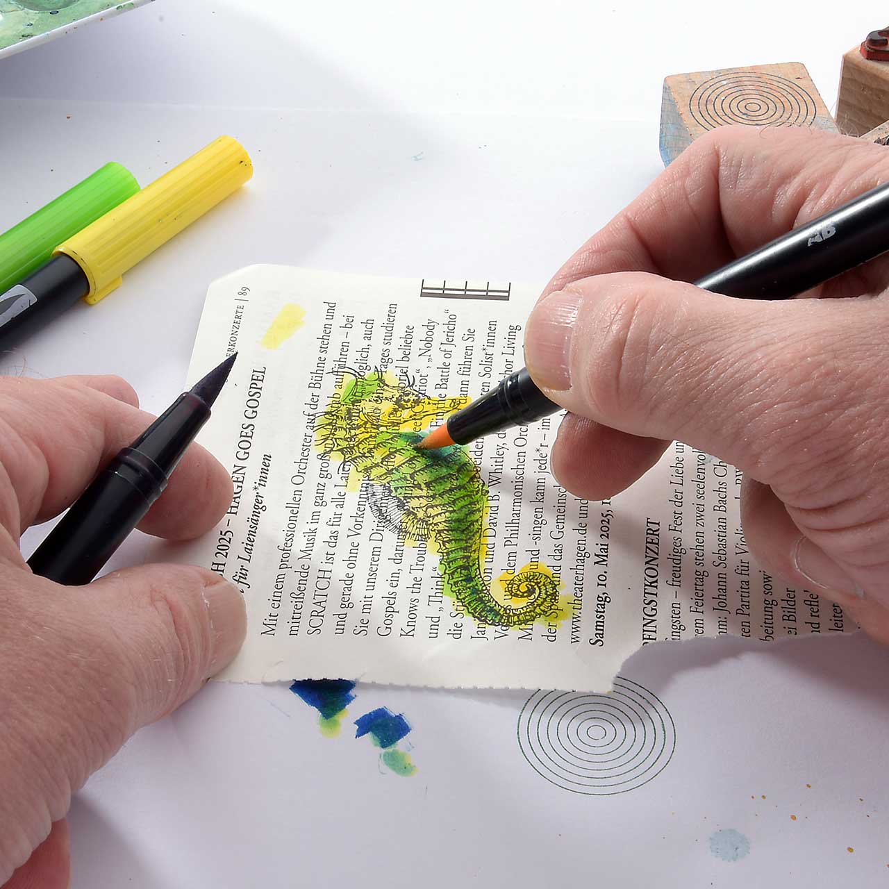 Kolorieren Sie das Seepferdchen Motiv auf der Buchseite vor dem Ausschneiden mit den Tombow Dual Brushpen Faserschreibern (ABT).
