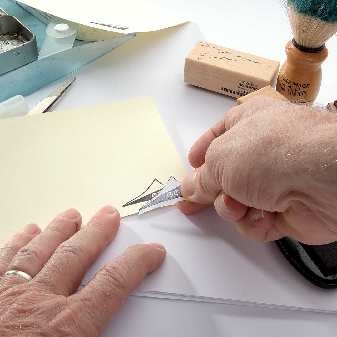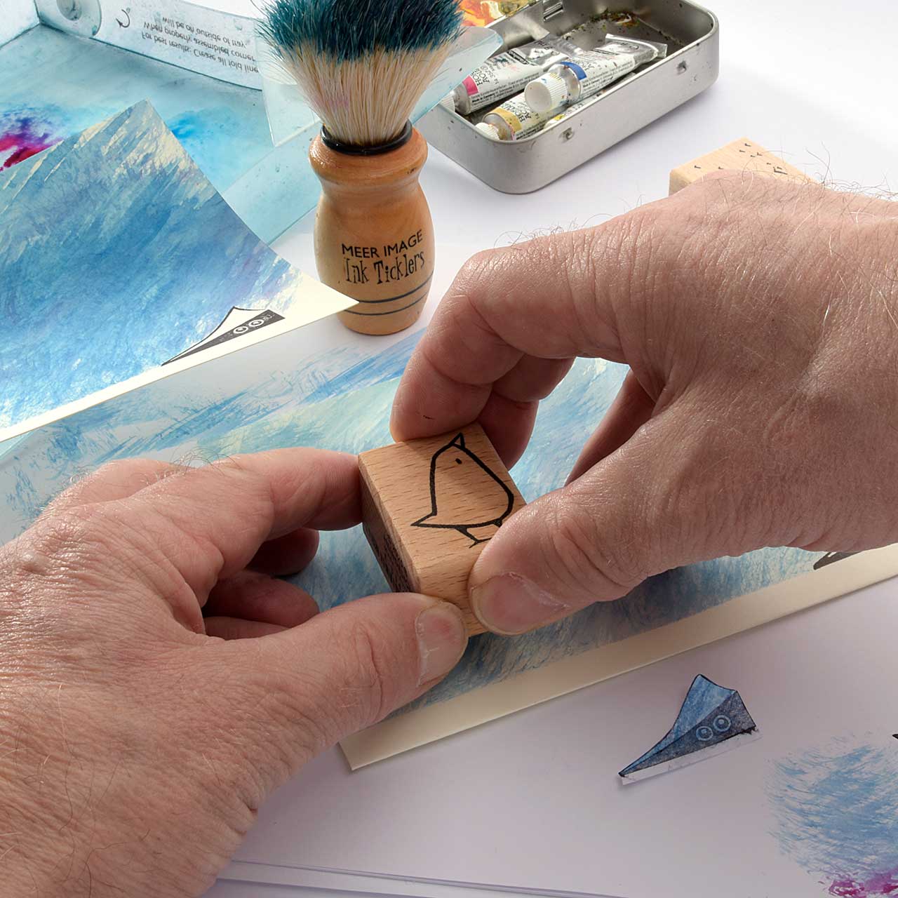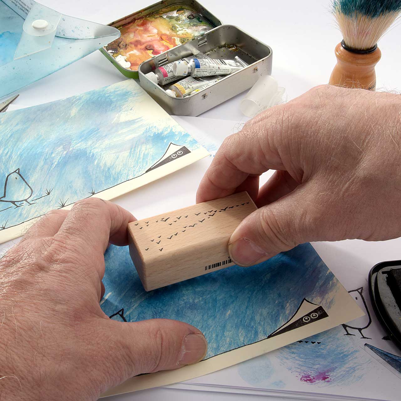 Stempeln Sie das Flugvögel Motiv rechts über das Vogel Motiv. (stempeln Sie vorsichtig, mit wenig Druck, die kleinen Vögel können leicht verschmieren).