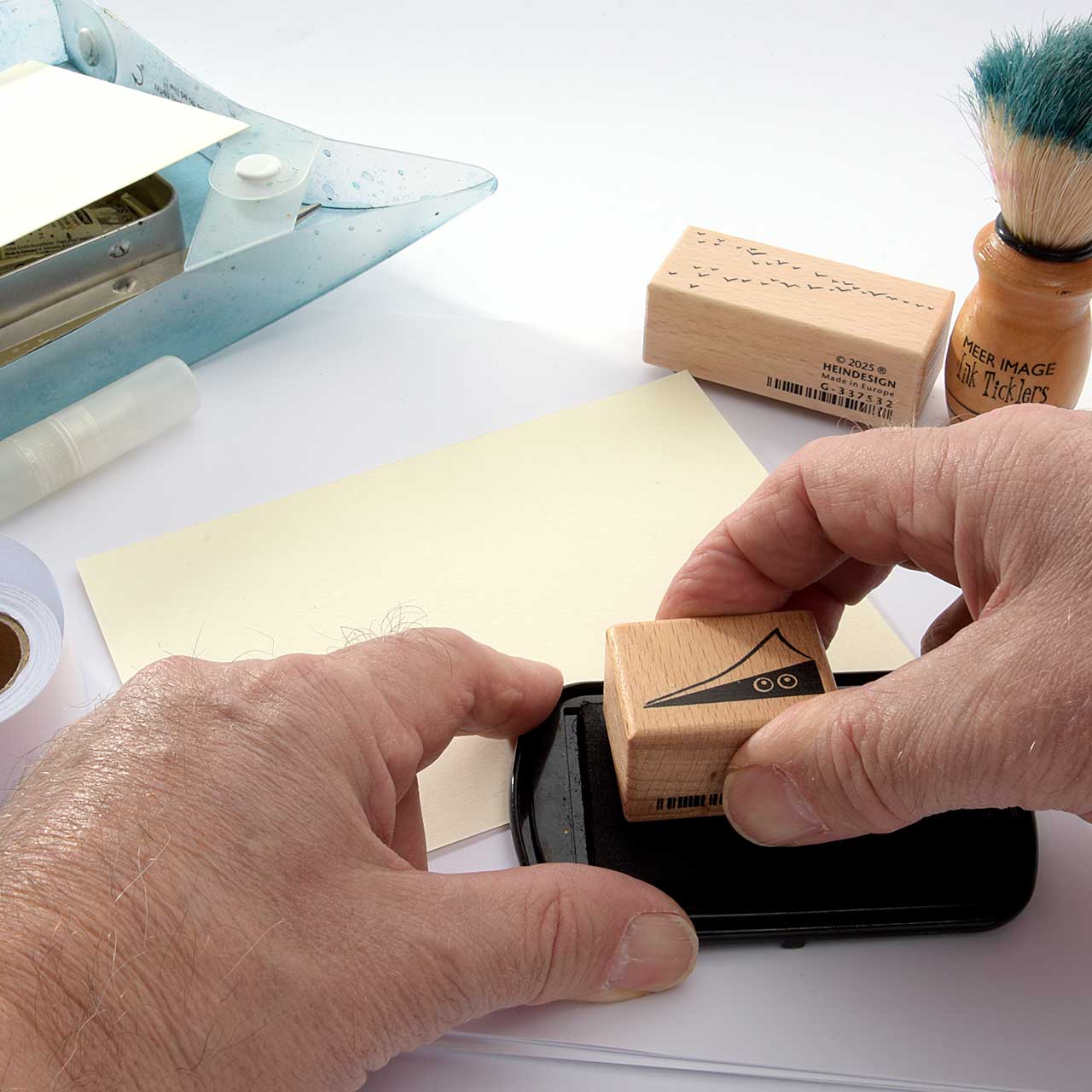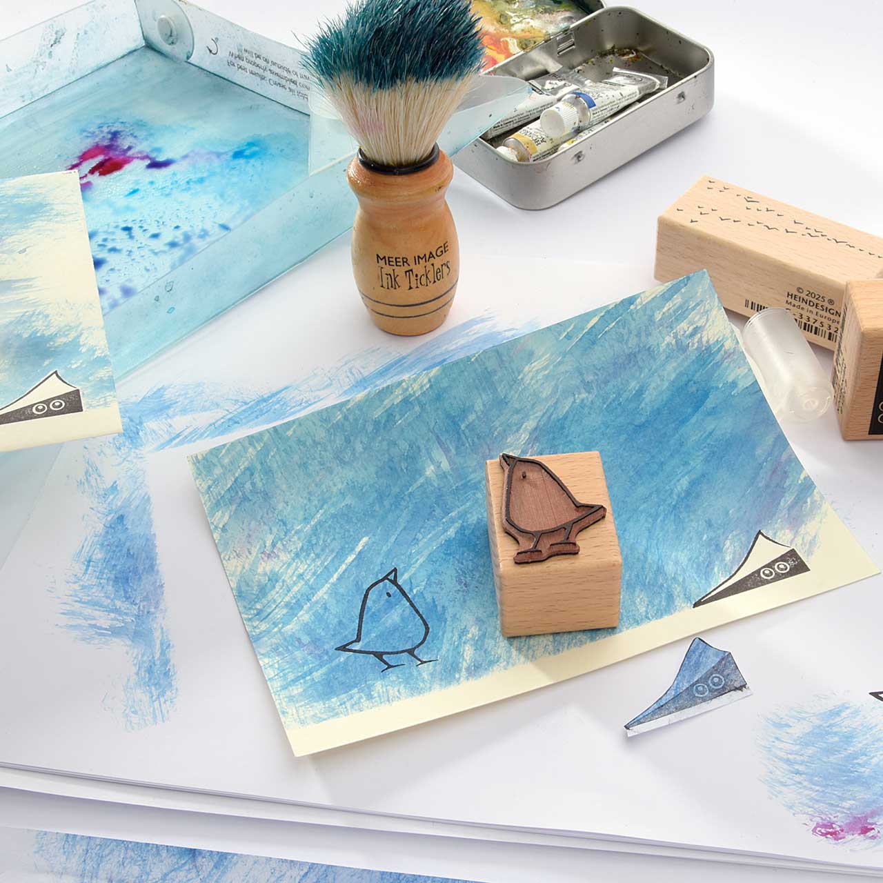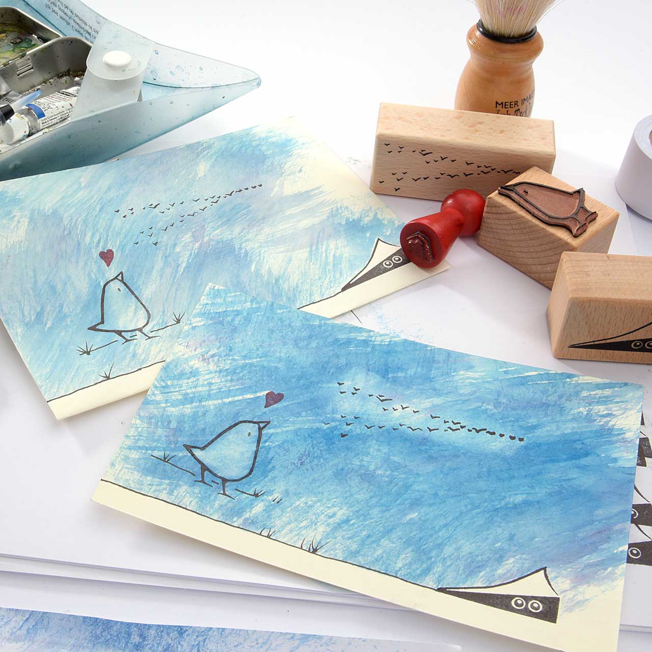 Stempeln Sie das Flugvögel Motiv rechts über das Vogel Motiv. (stempeln Sie vorsichtig, mit wenig Druck, die kleinen Vögel können leicht verschmieren).