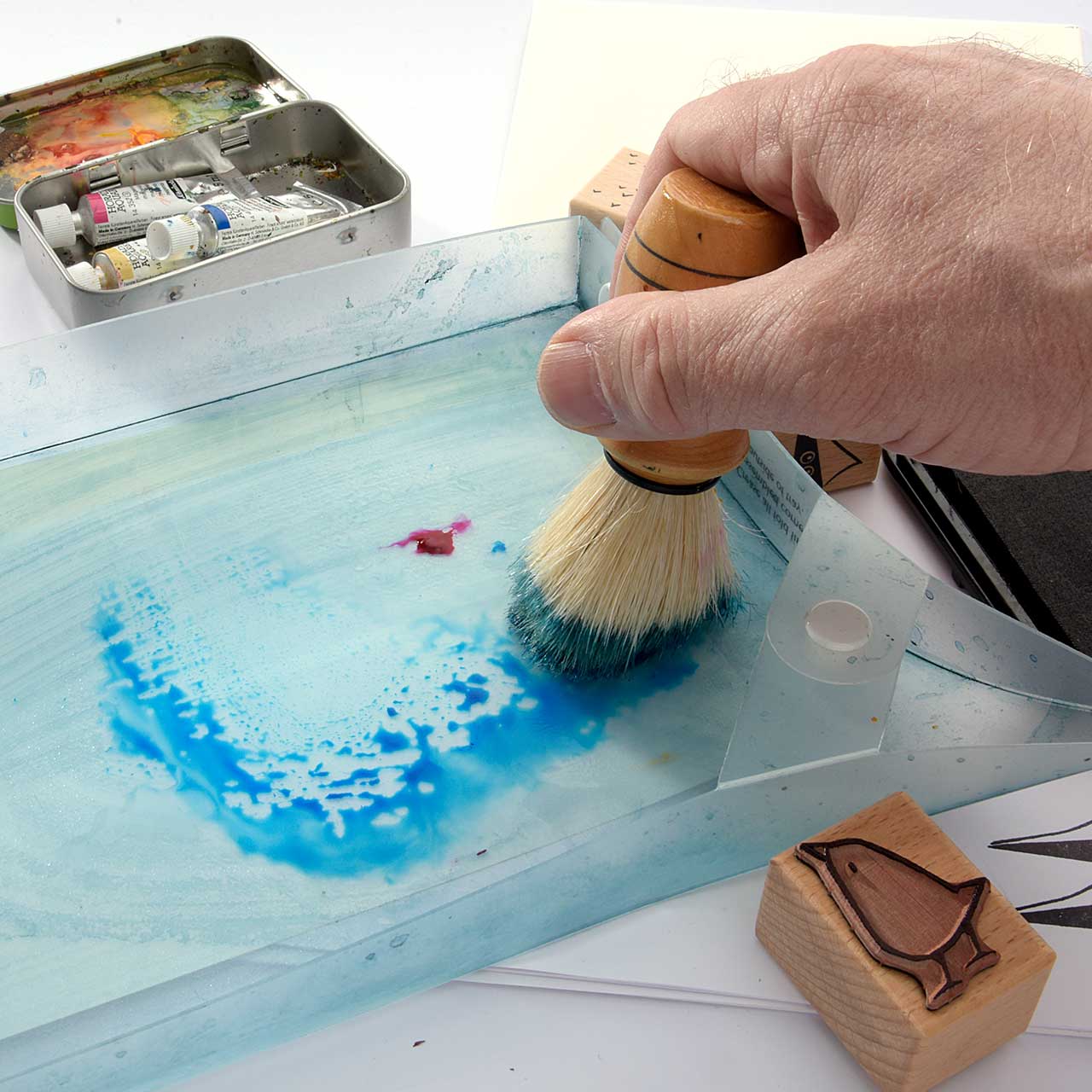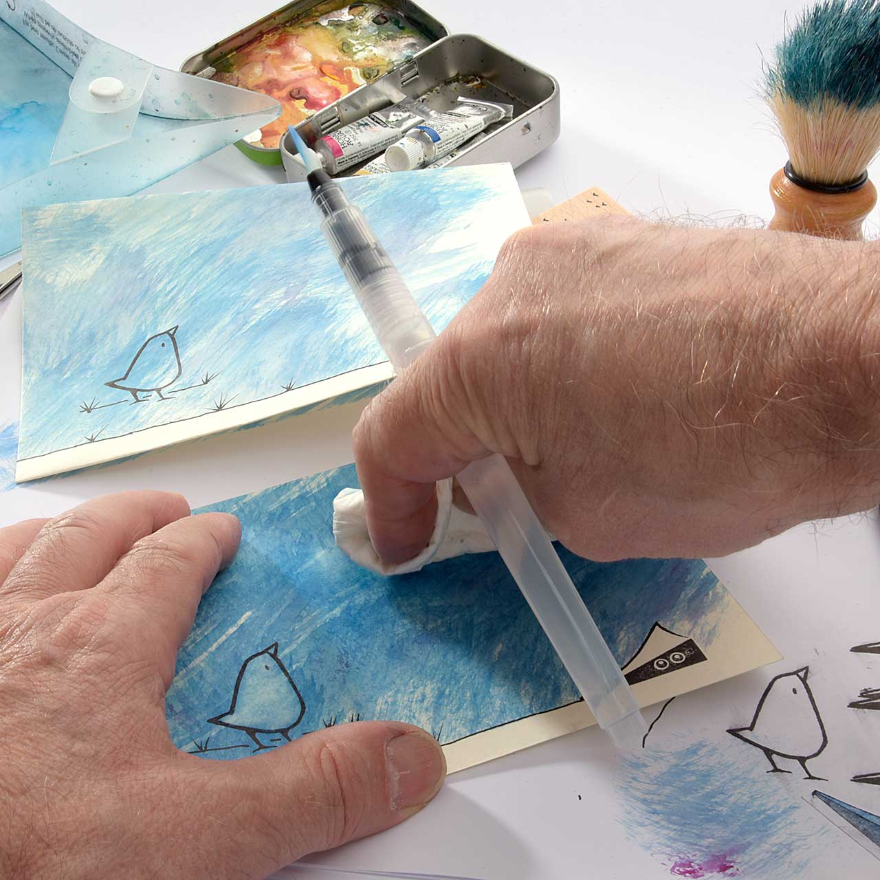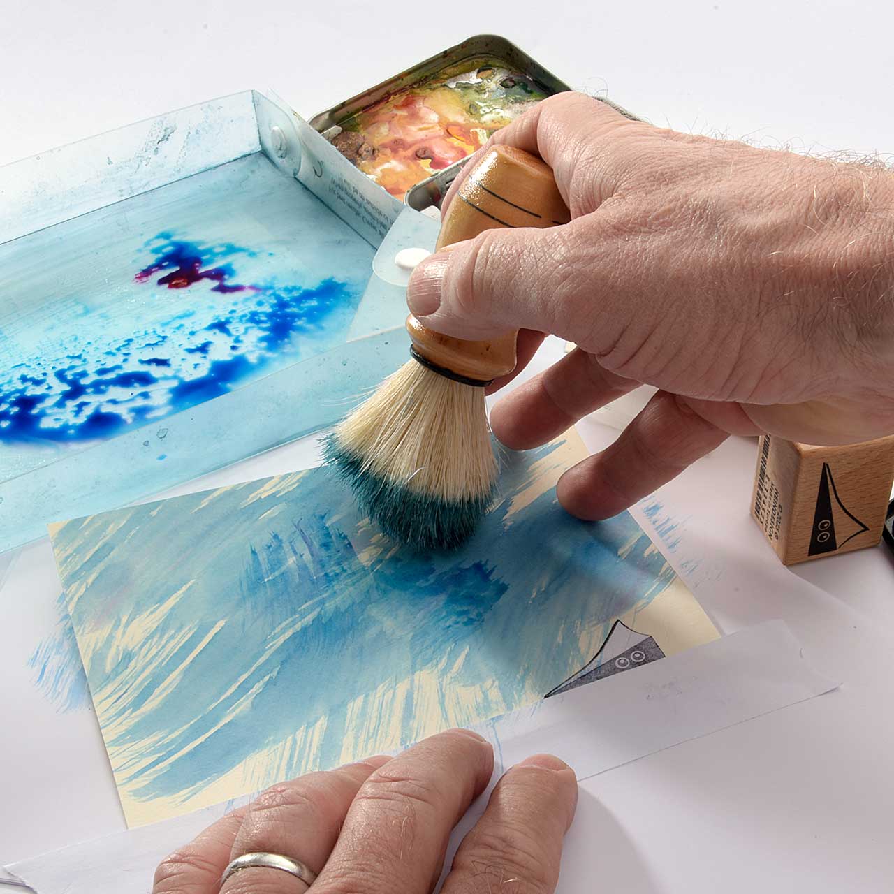 Nehmen Sie mit dem Ink Tickler blaue, wässerige Aquarellfarbe auf und tupfen Sie die Farbe auf Ihre Karte.