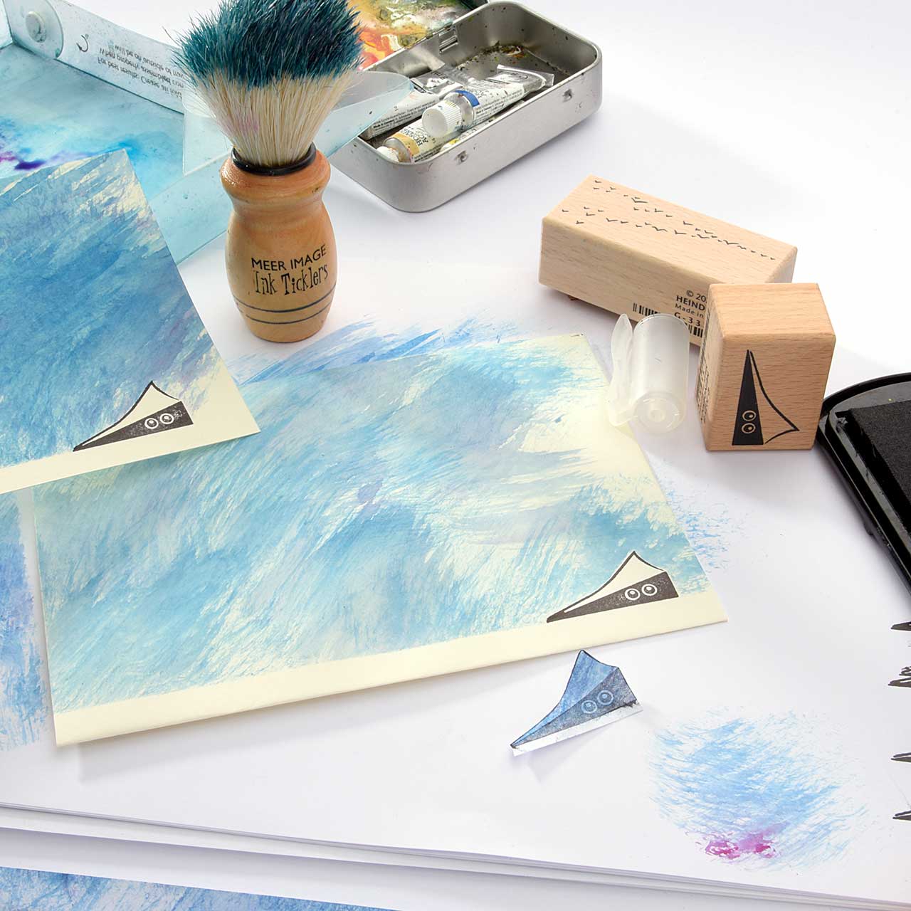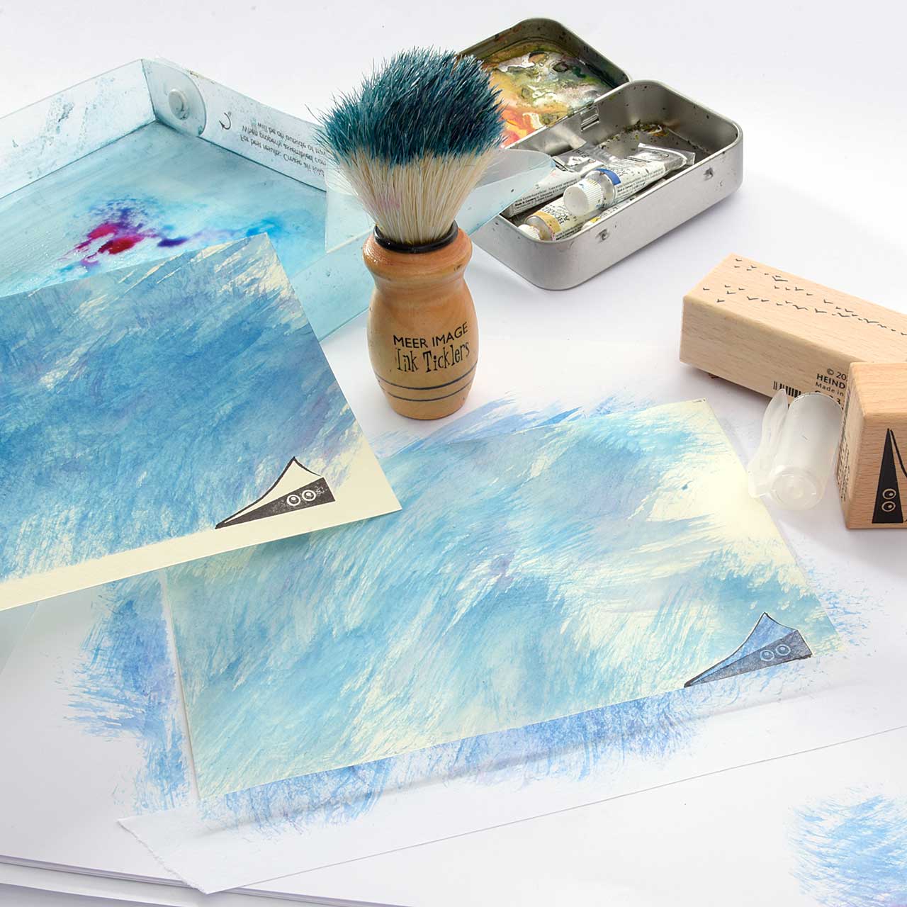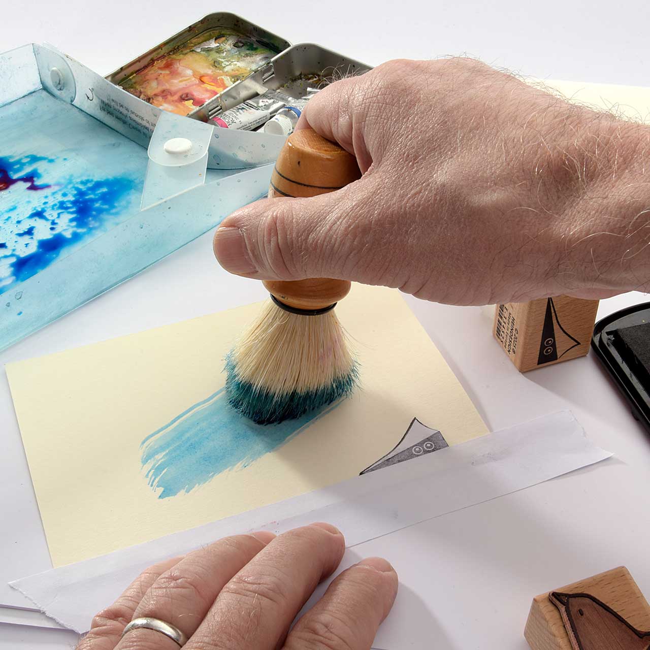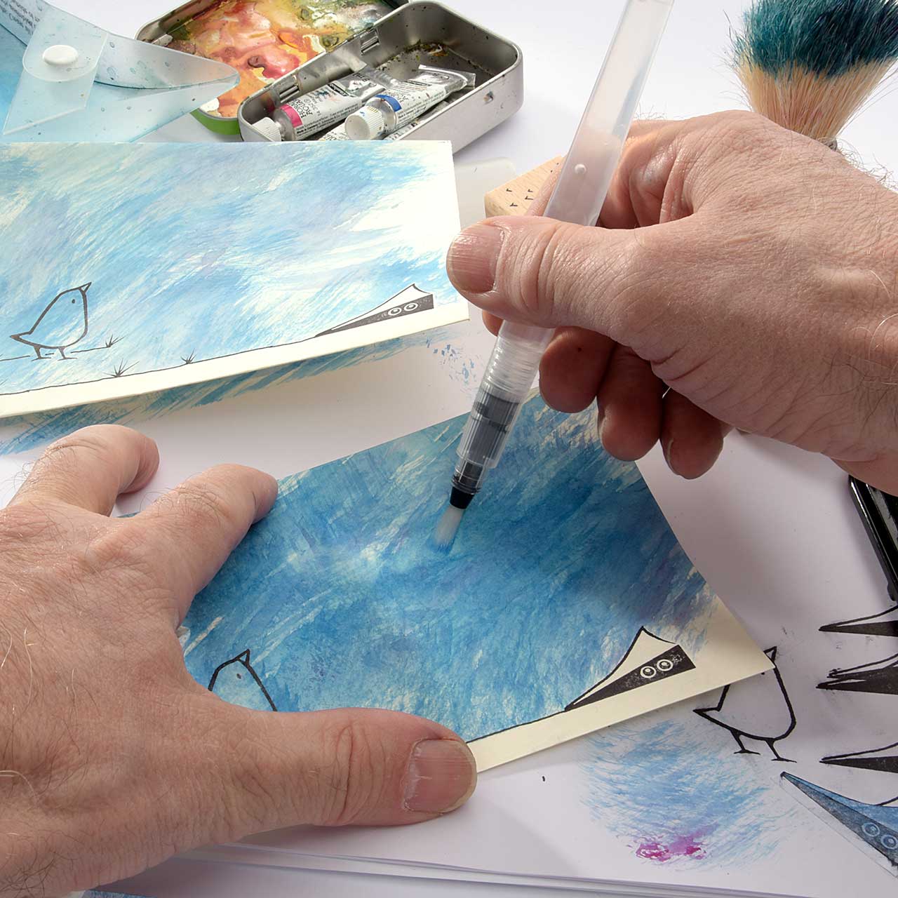Nehmen Sie mit dem Ink Tickler blaue, wässerige Aquarellfarbe auf und tupfen Sie die Farbe auf Ihre Karte.
