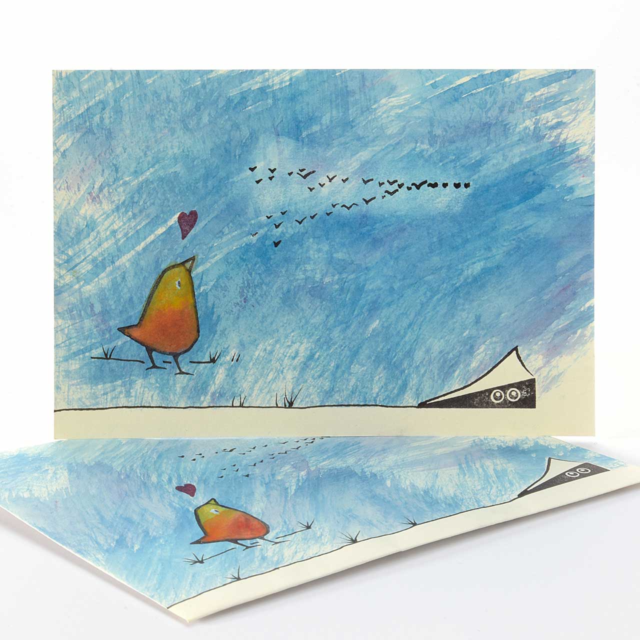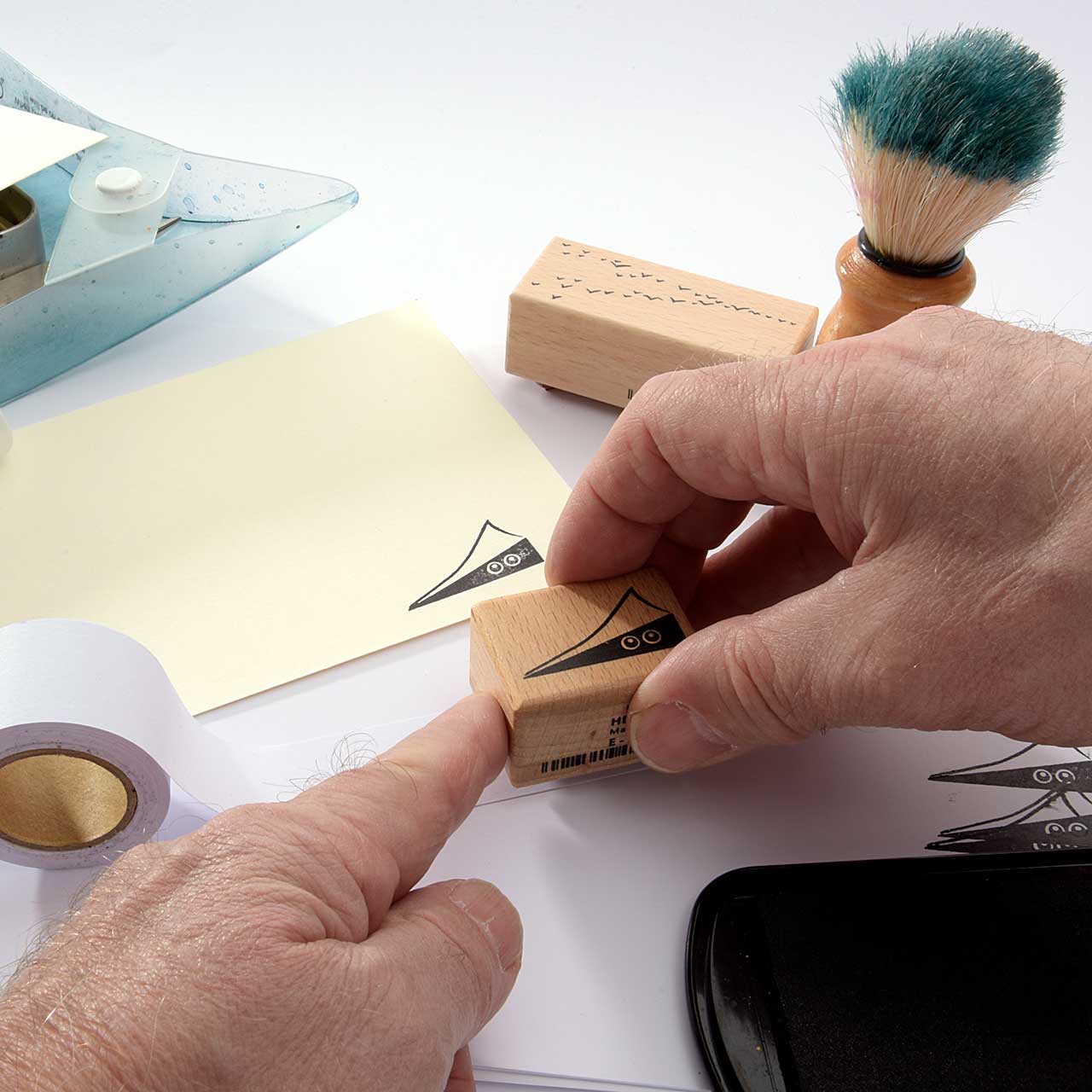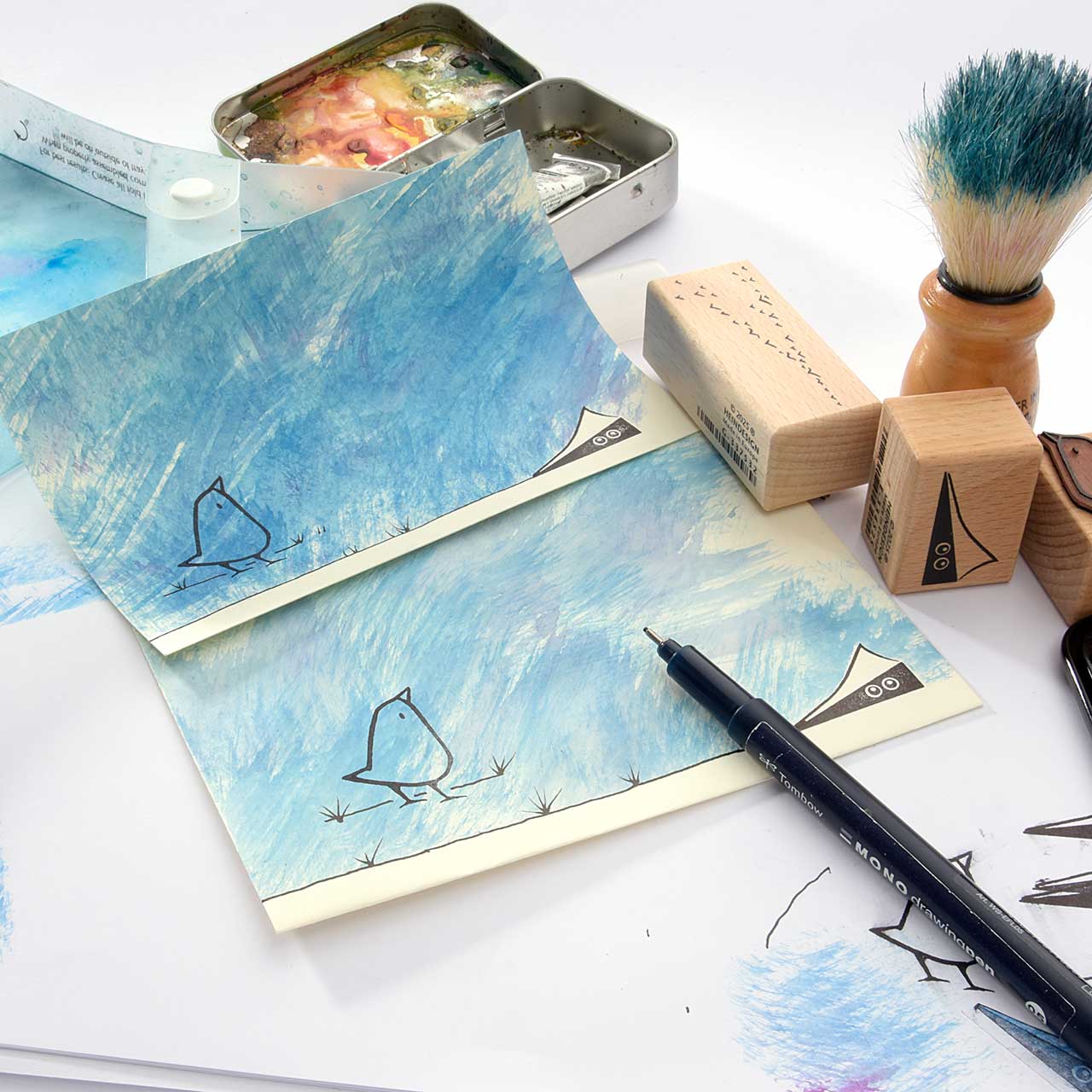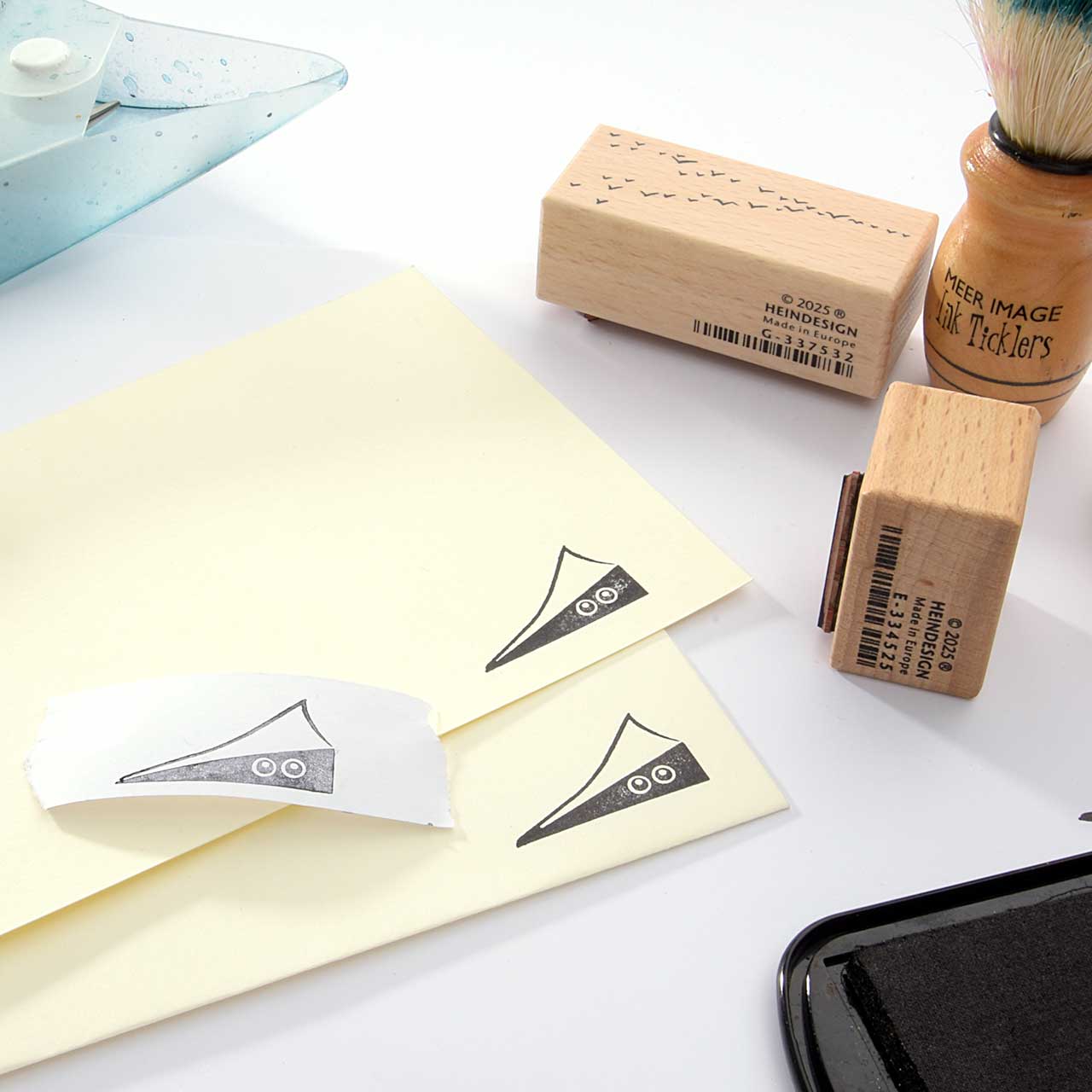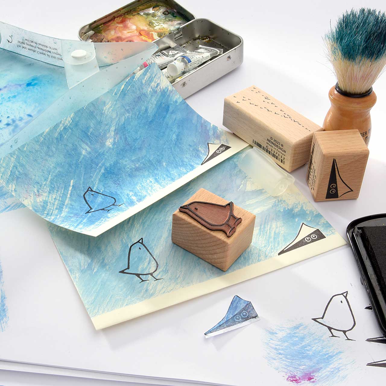 Stempeln Sie das Vogel Motiv mit dem schwarzen Stempelkissen ein mal auf Ihre Karte und ein weiteres mal auf Ihren Umschlag.
