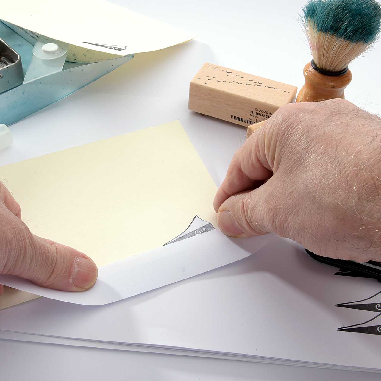 Stempeln Sie das Dunkelmunkel Motiv mit dem schwarzen Stempelkissen in die rechte untere Ecke ihrer Karte, ihres Umschlags und auf ein Stück Eclipse Papier.