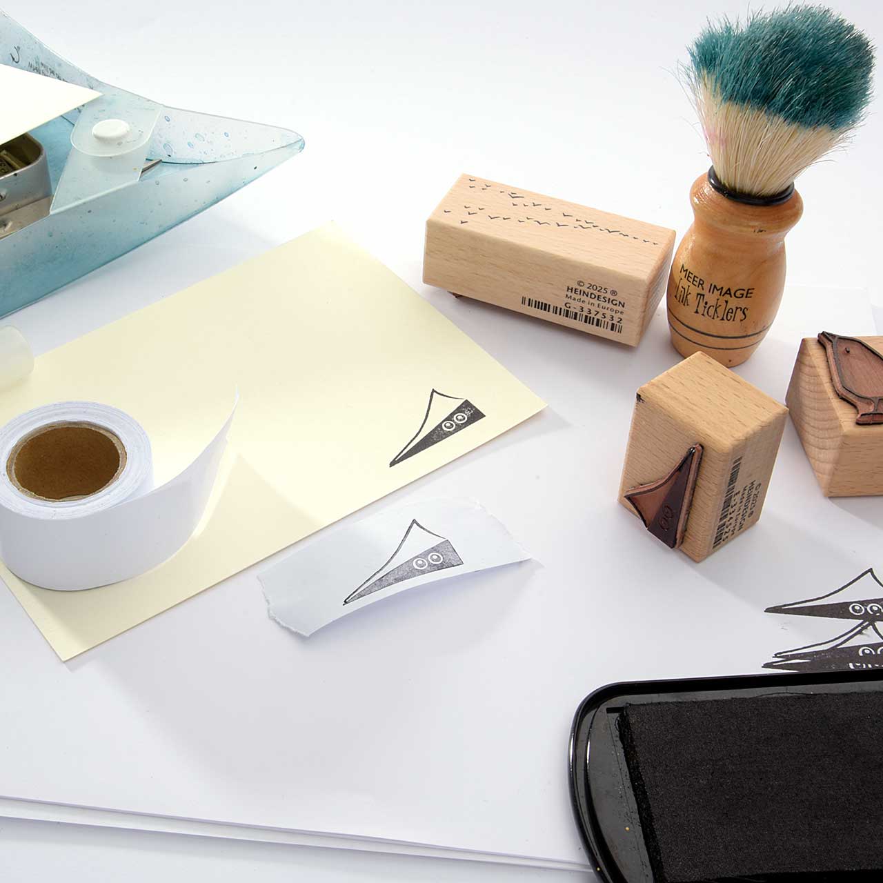 Stempeln Sie das kleine Herz Motiv mit dem roten Stempelkissen oberhalb des Vogel Motivs.