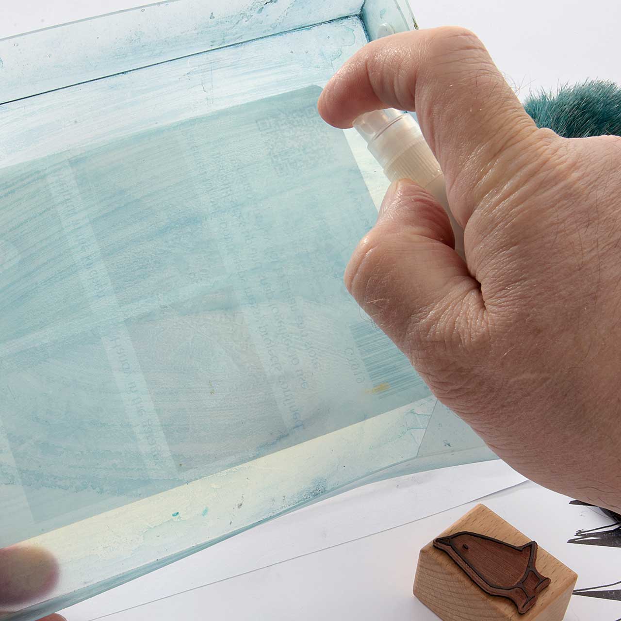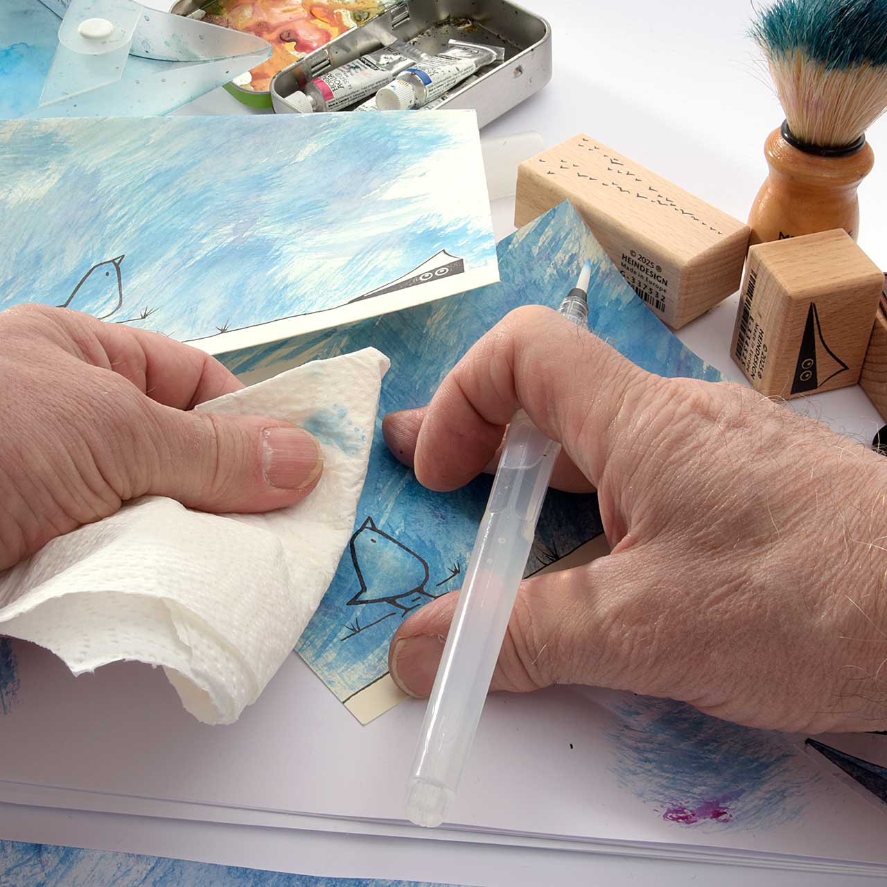 Benetzen Sie das Vogel Motiv und nehmen Sie die nasse Farbe mit einem Papiertuch ab.