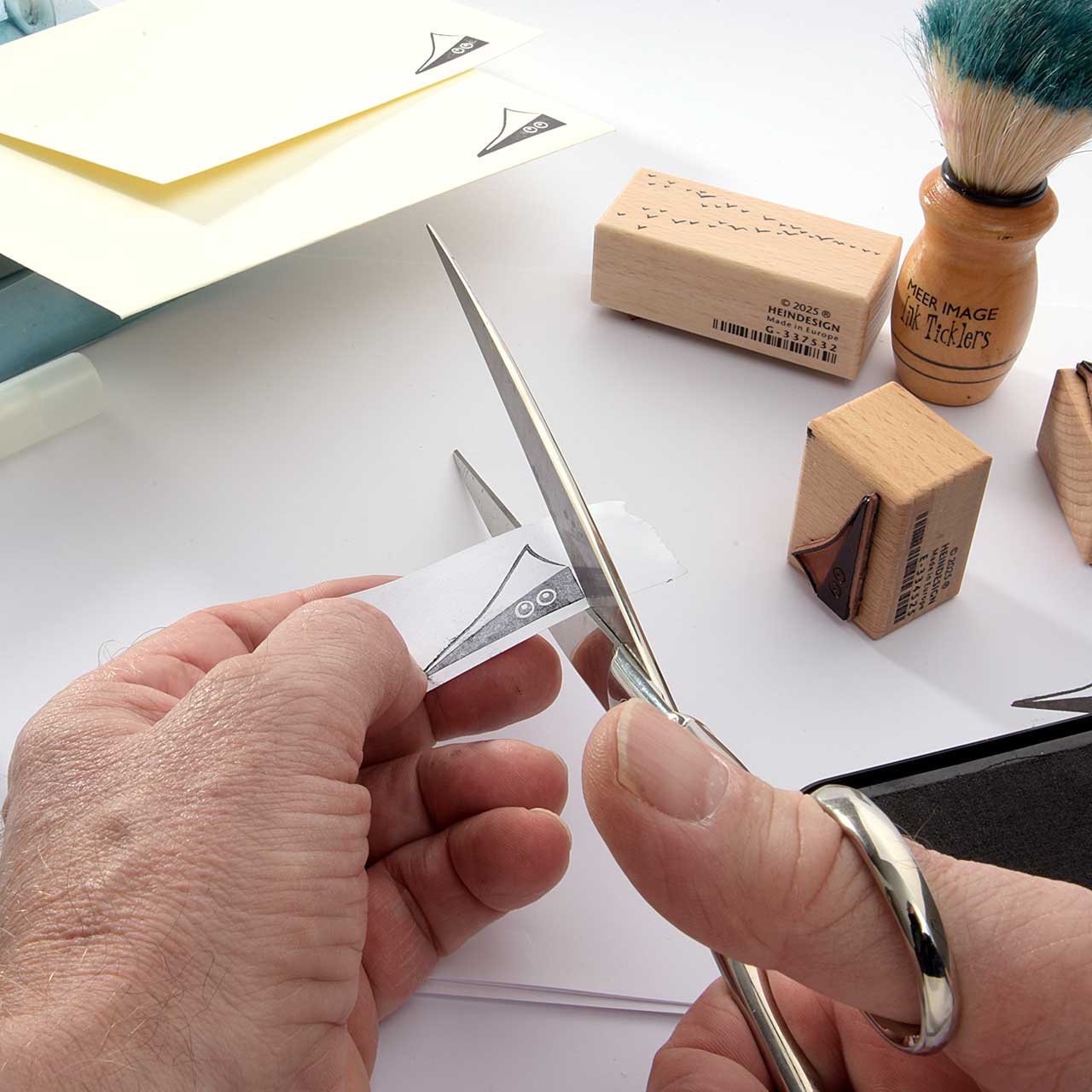 Schneiden Sie das Motiv mit einer Schere aus und decken Sie das Motiv auf Ihrer Karte ab. Zusätzlich kleben Sie an der unteren Kante ihrer Karte einen Streifen ab.