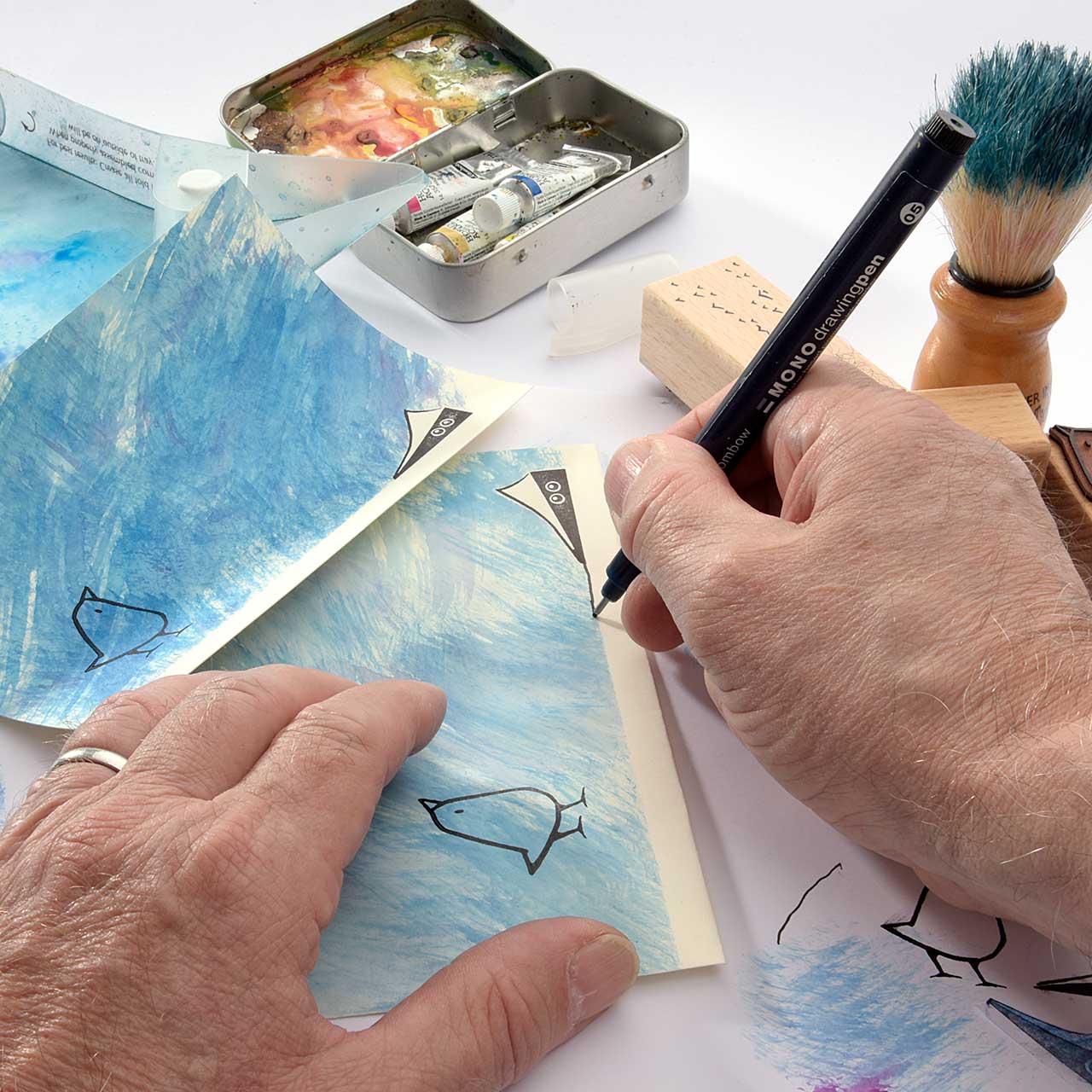 Ziehen Sie mit dem Tombow Fineliner eine Linie entlang der Farbkante. Ziehen Sie auch eine Linie zu den Füßen des Vogels.