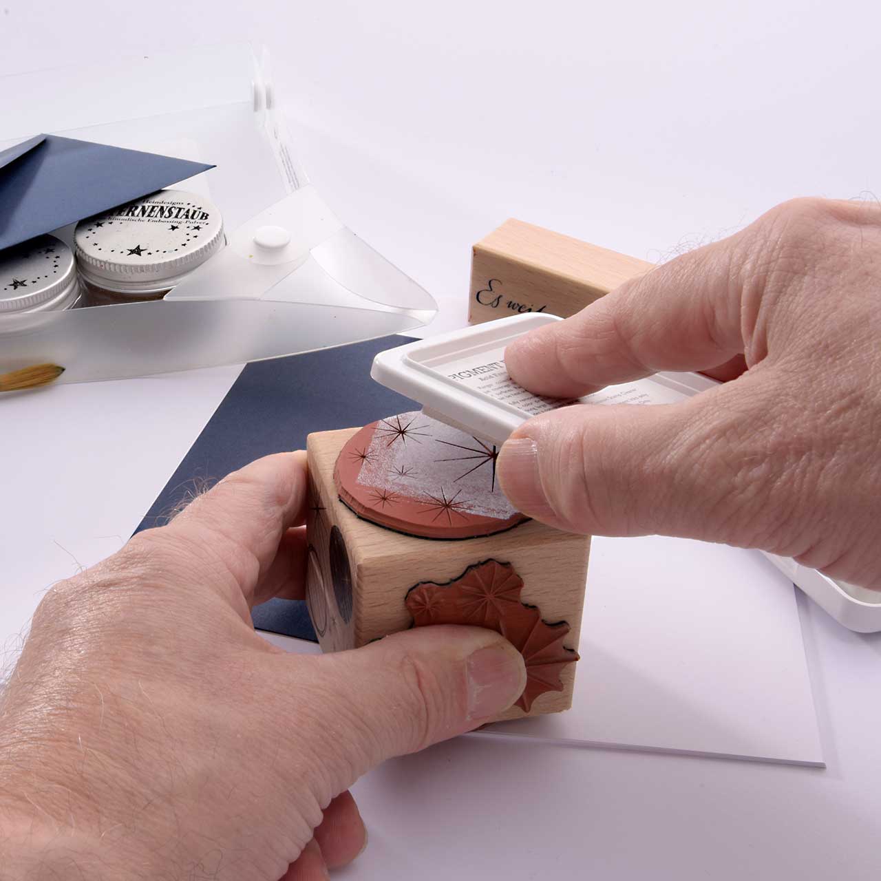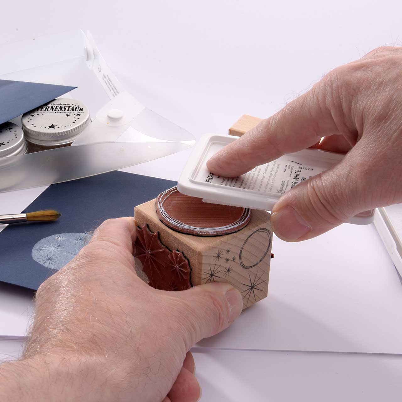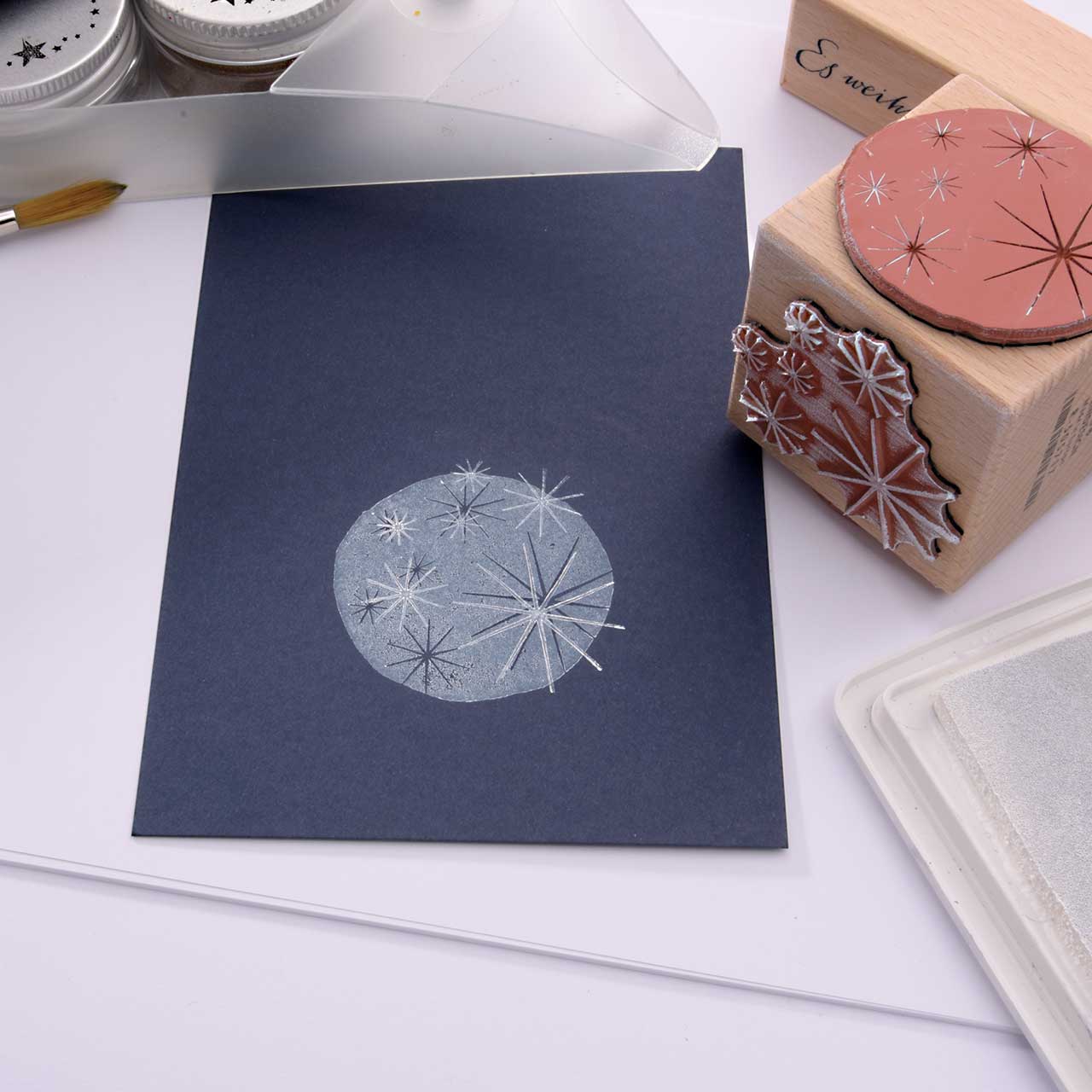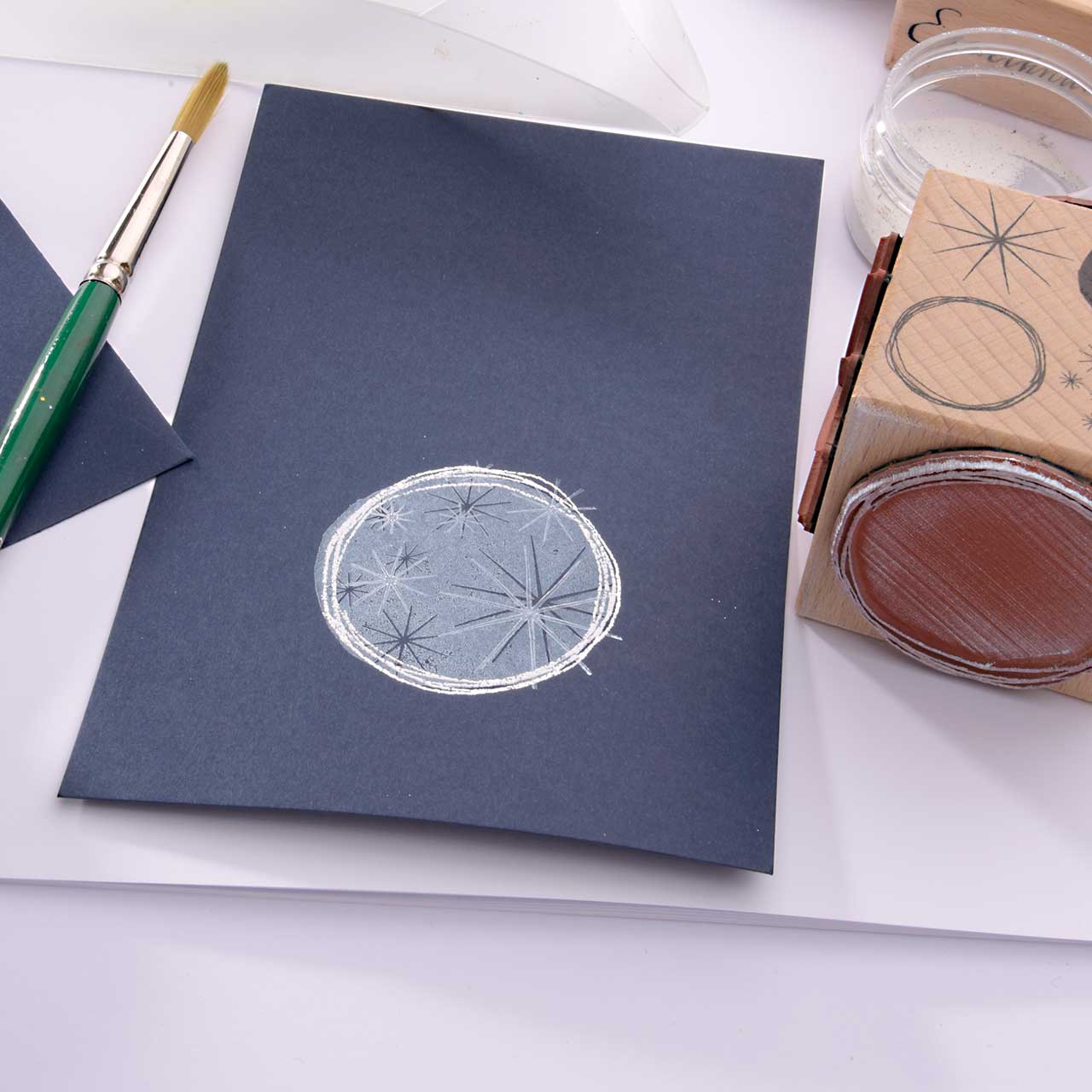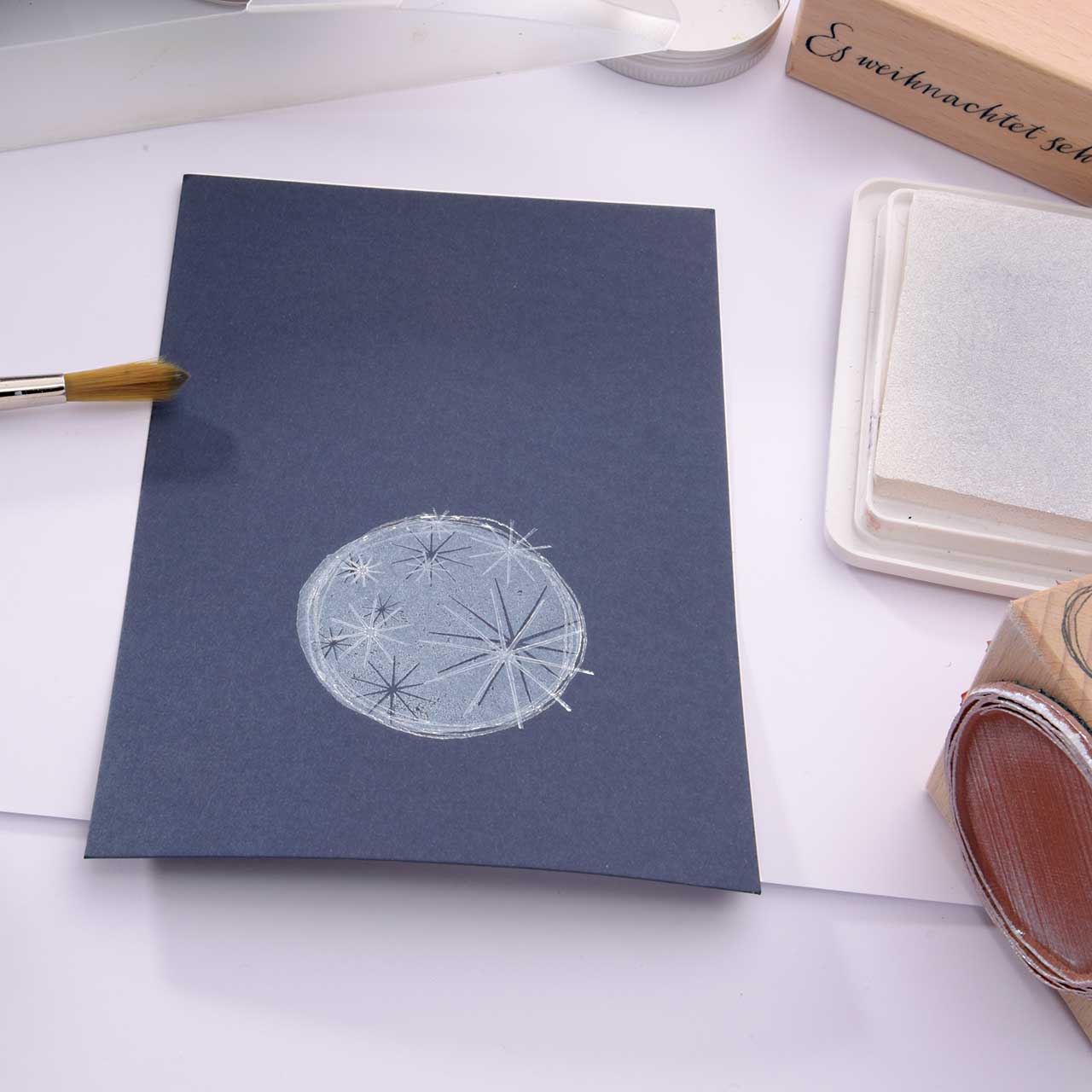 Stempeln Sie das Sterne am Himmel Motiv mit dem weißen Stempelkissen auf den zuvor gestempelten weißen Abdruck.
