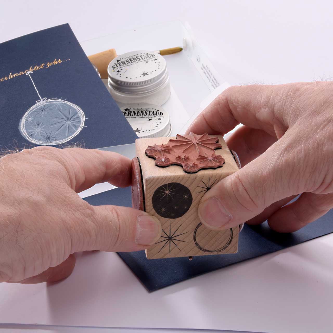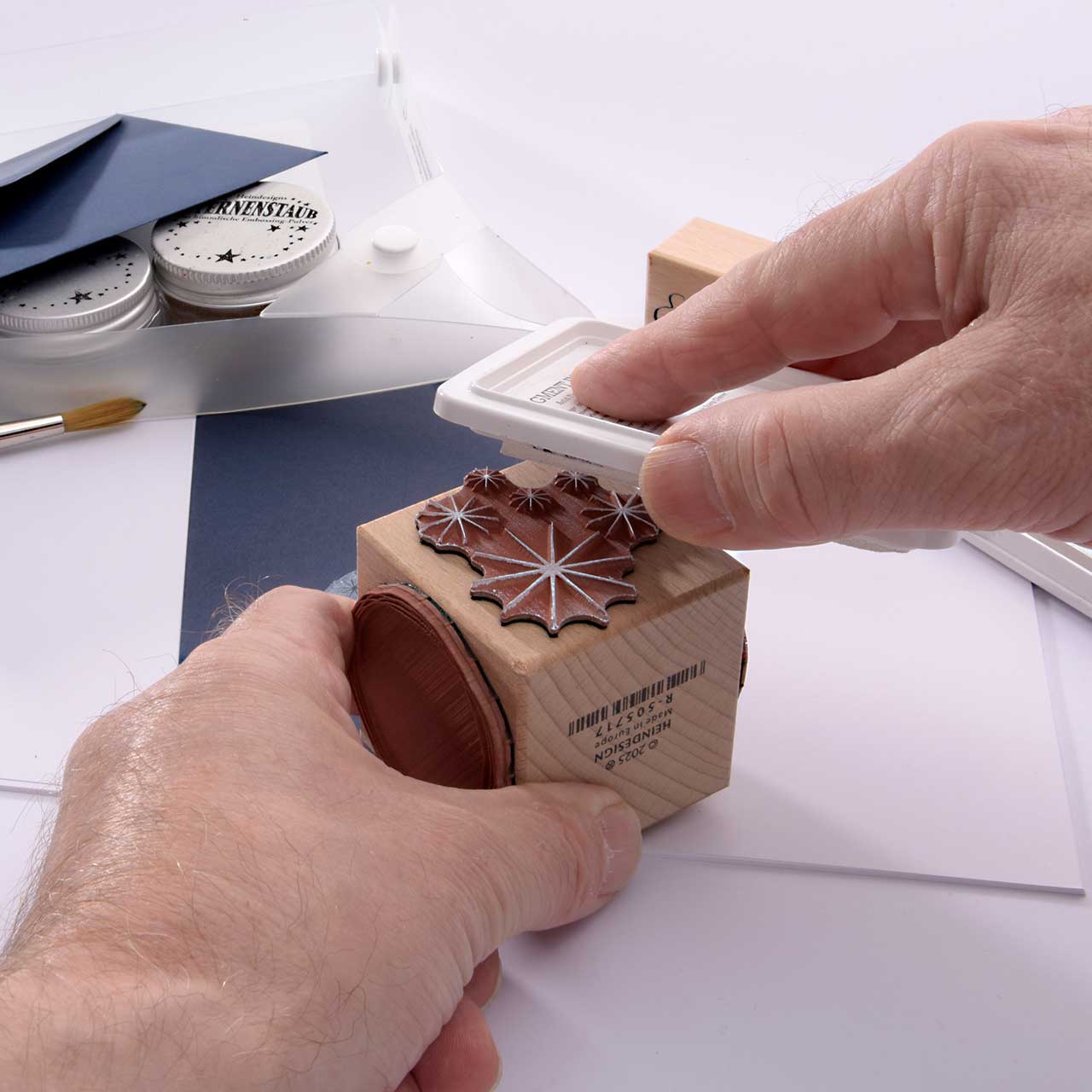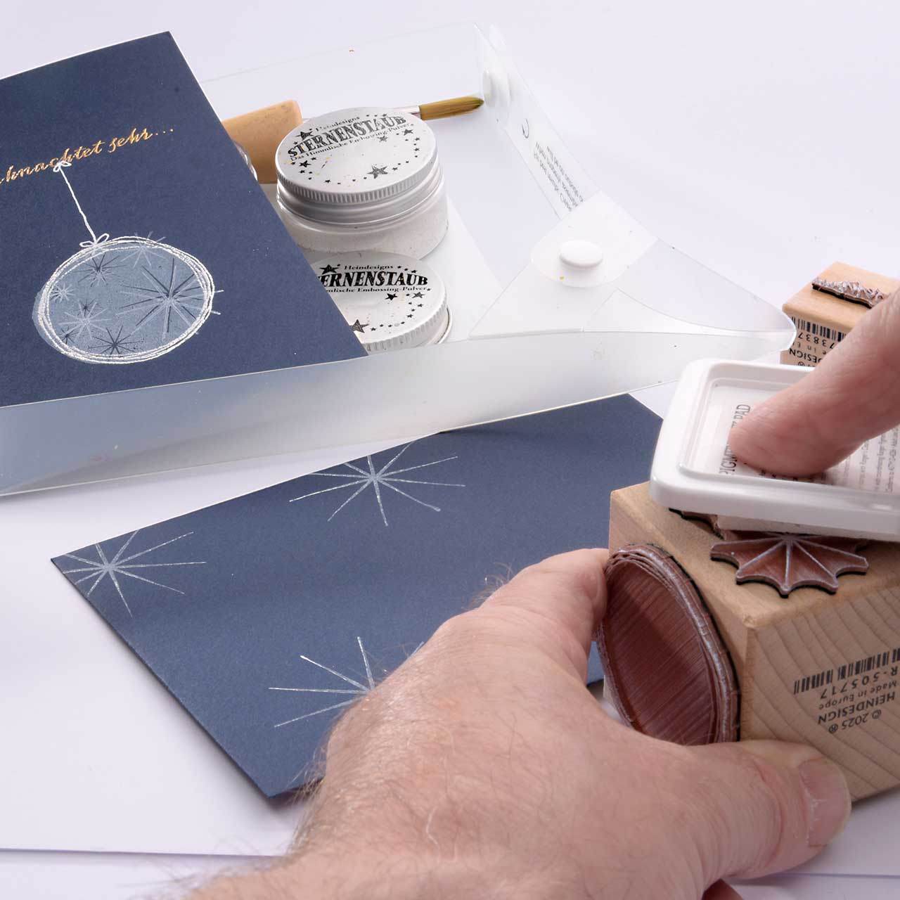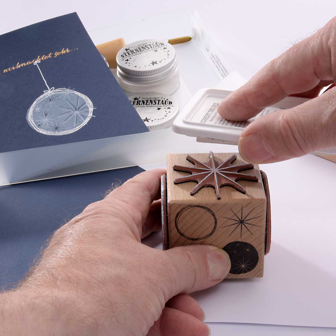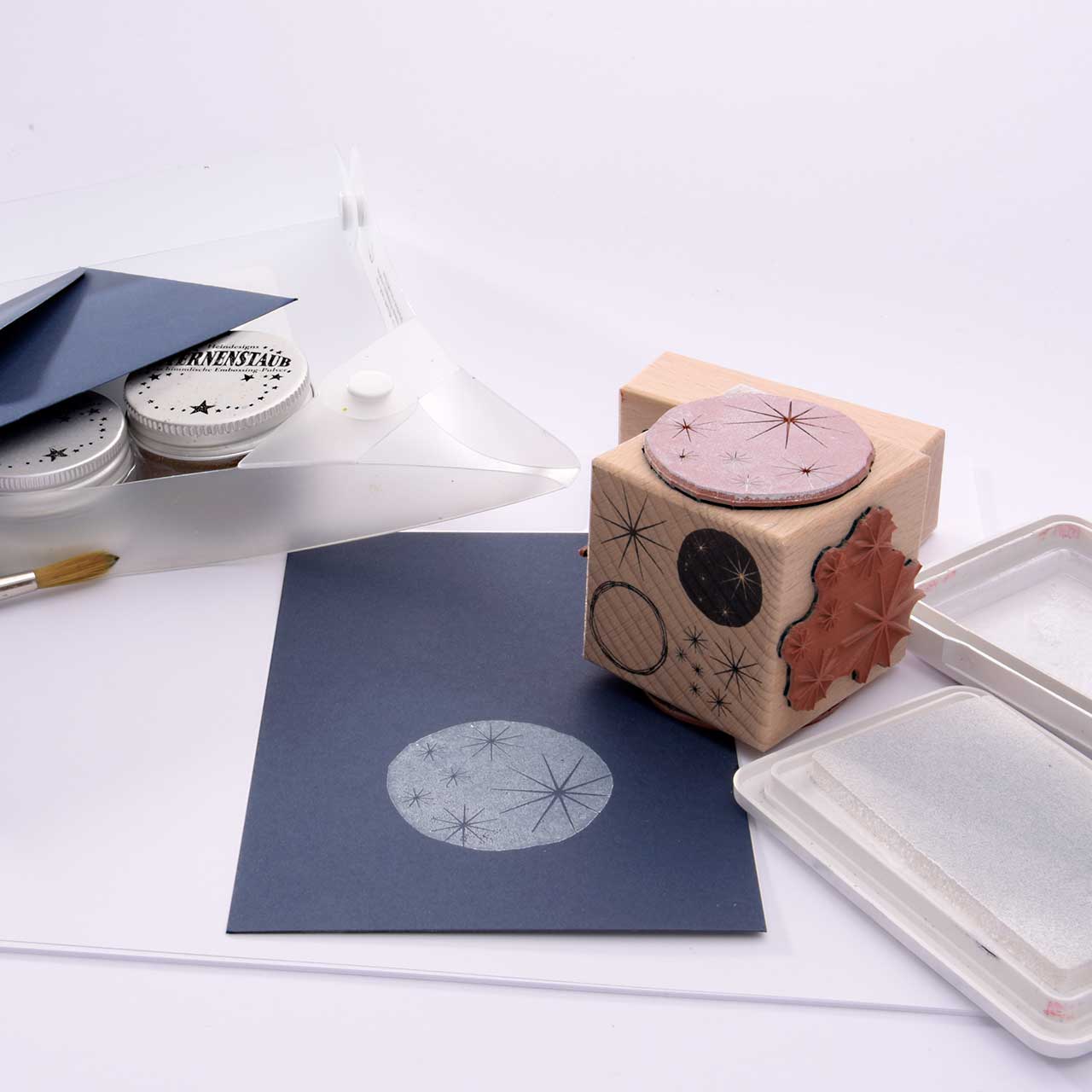 Stempeln Sie das Sterne am Himmel Motiv mit dem weißen Stempelkissen auf den zuvor gestempelten weißen Abdruck.