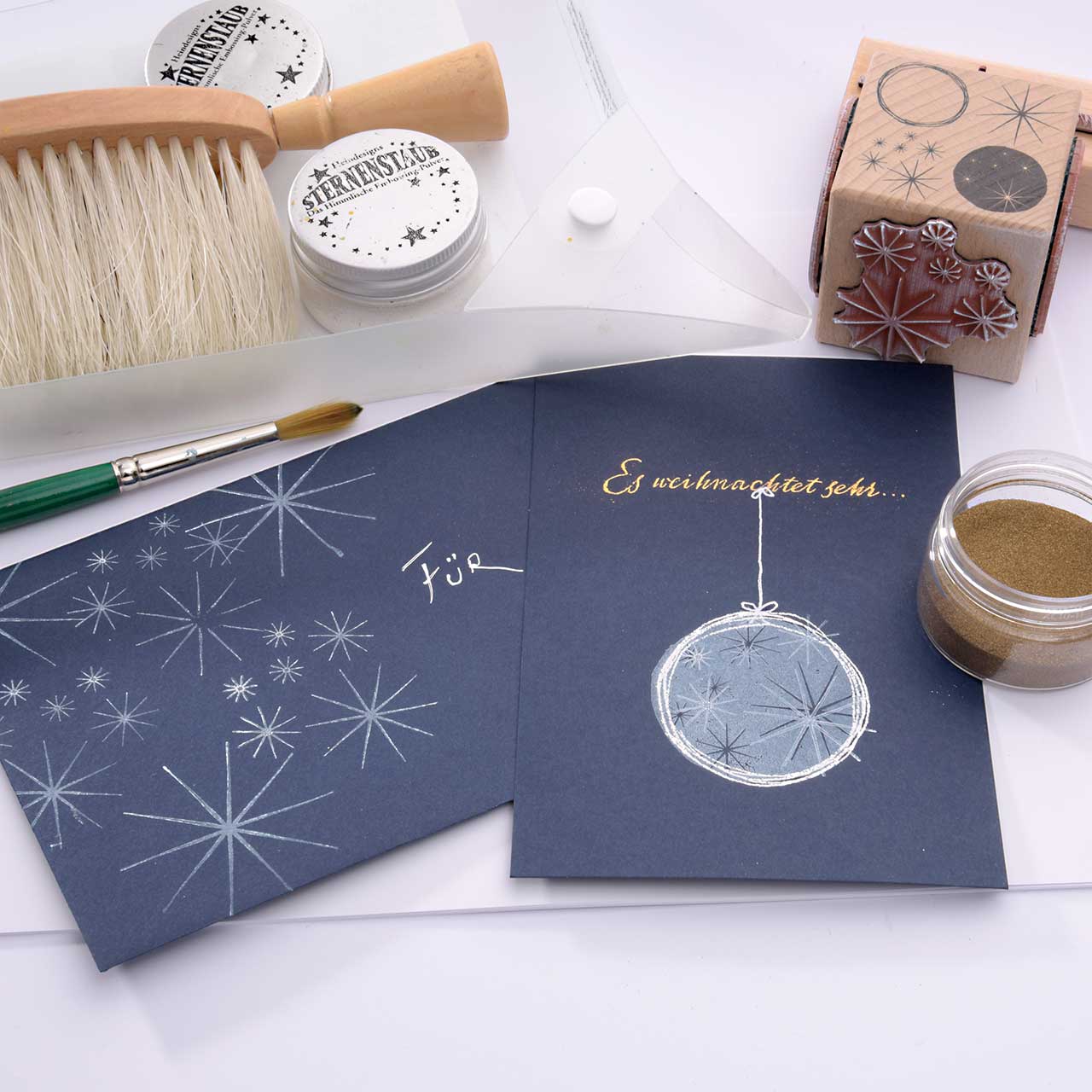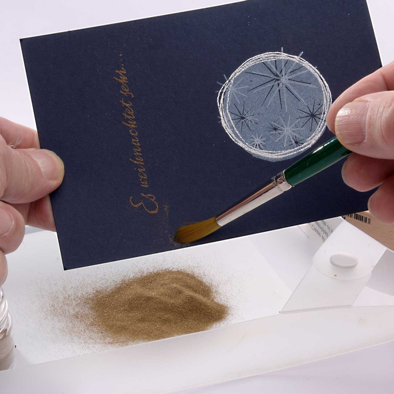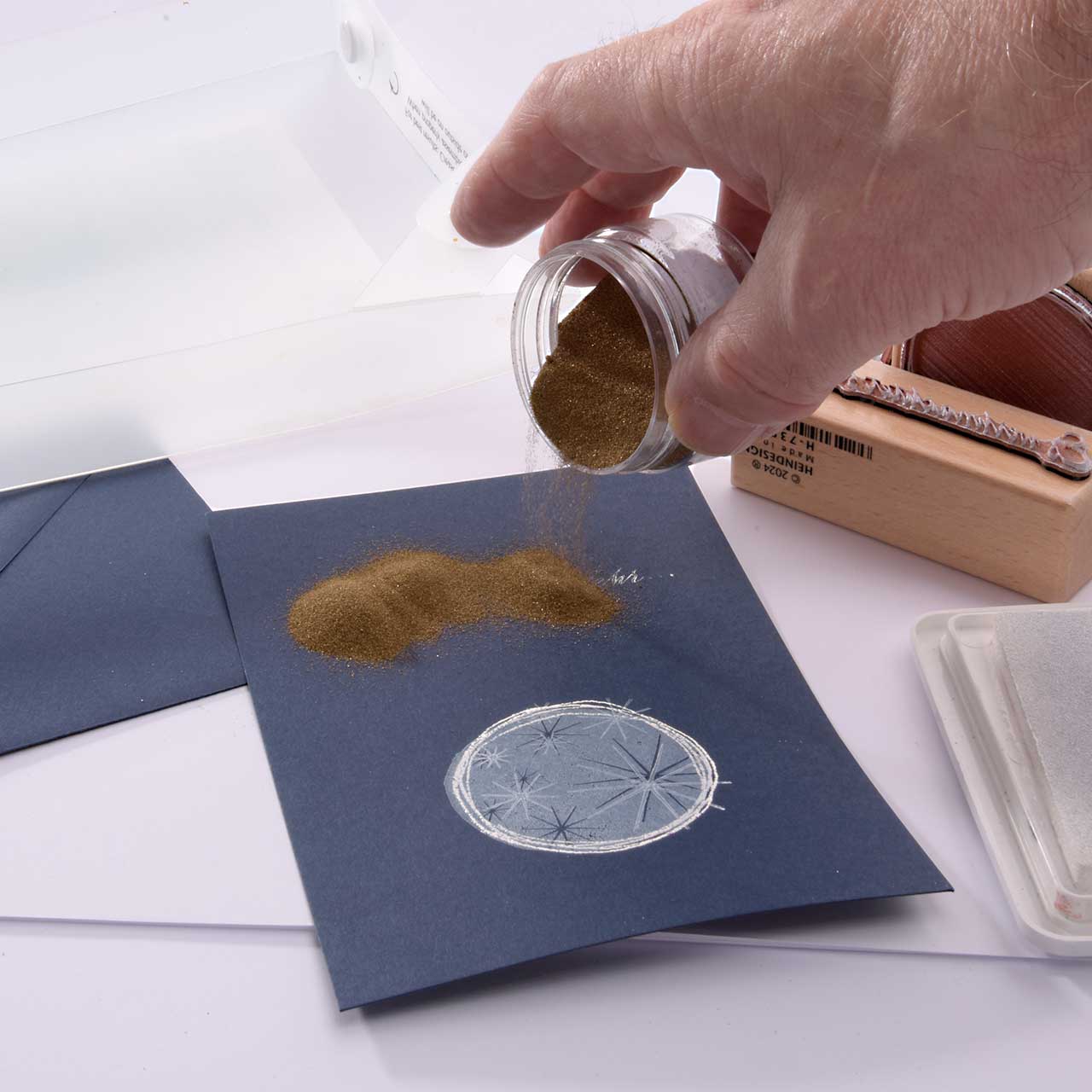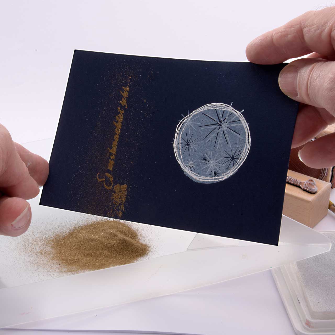Lassen Sie die Farbe gut trocknen*. Im nächsten Schritt arbeiten Sie mit Embossing Pulver, daher muss die Karten ganz trocken sein.