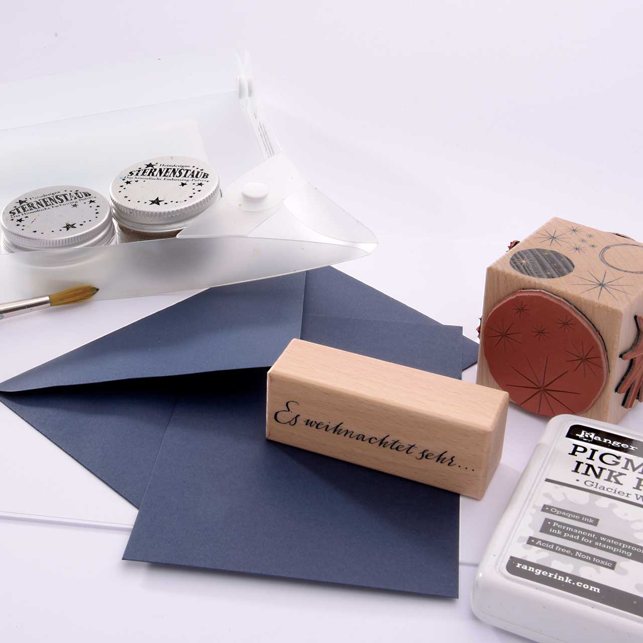 Stempeln das Sterne am Himmel Motiv ebenfalls mit dem weißen Stempelkissen zwischen die Lücken der großen Sternen Motive auf Ihrem Umschlag.