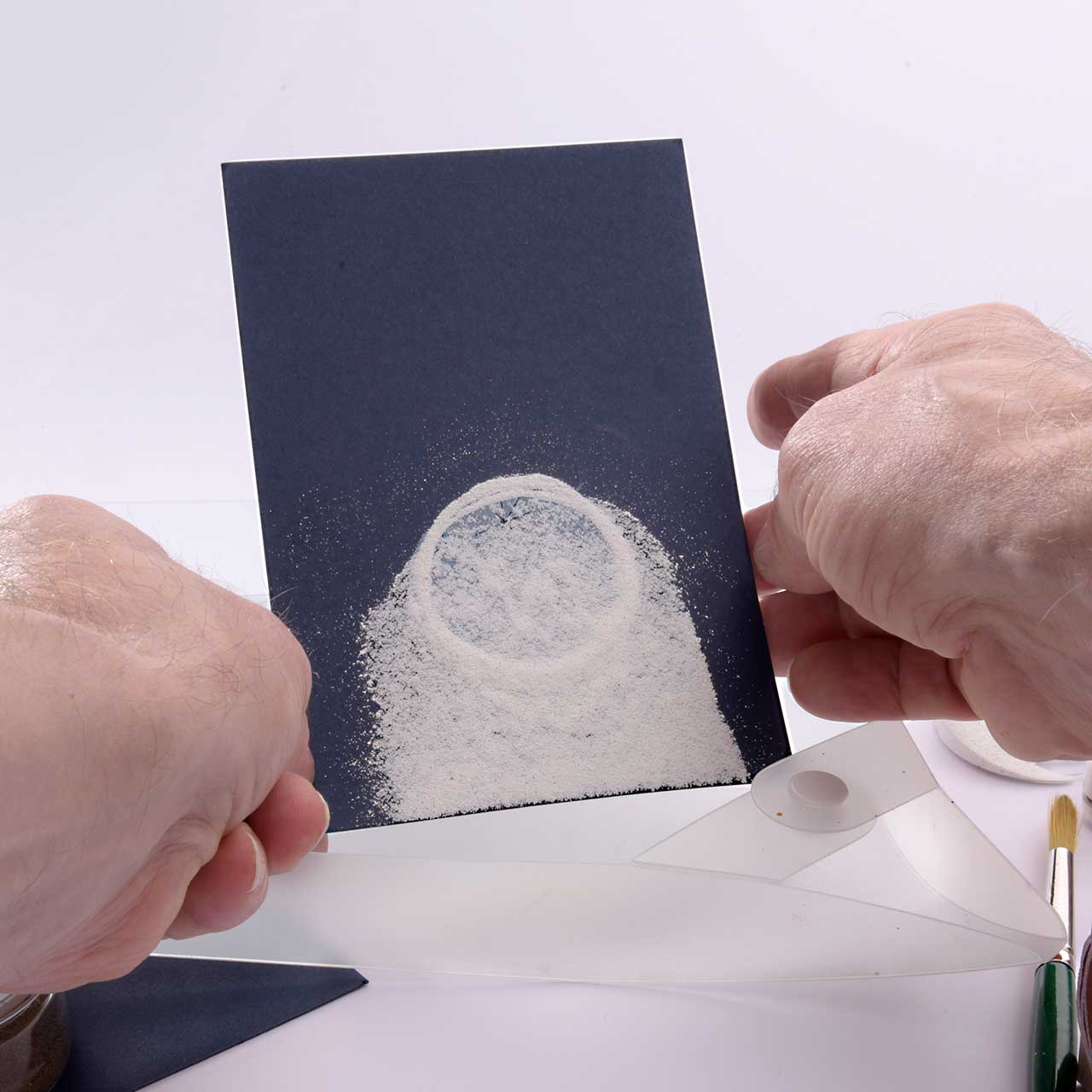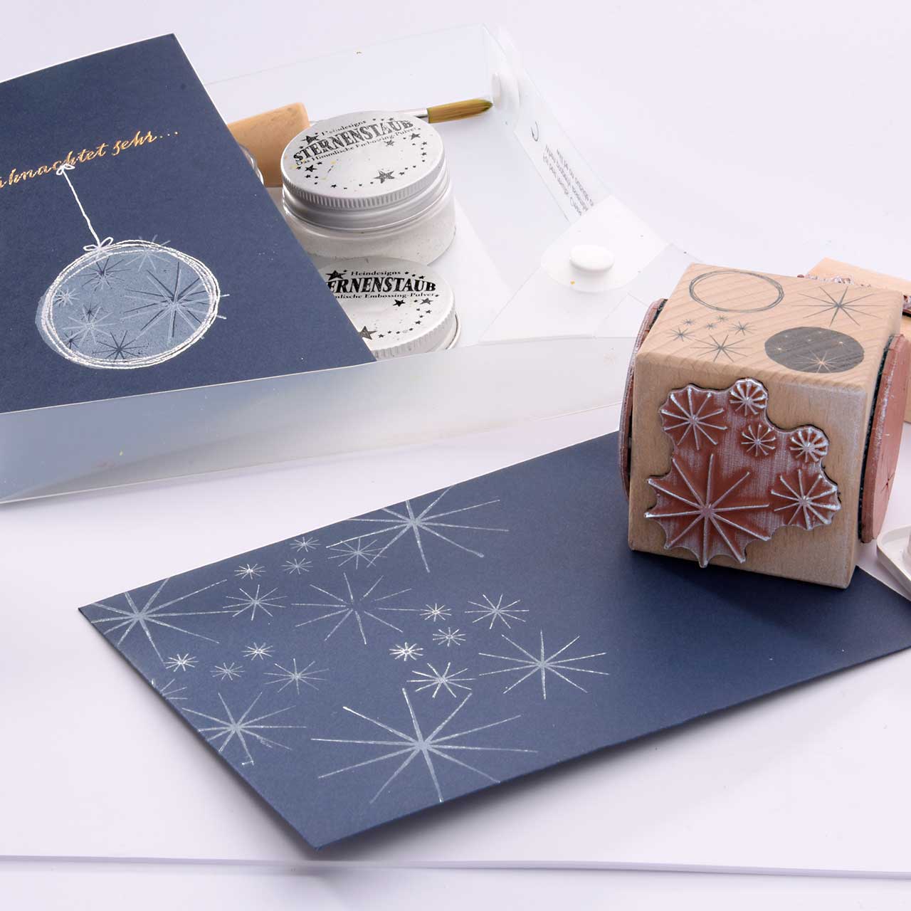 Stempeln und embossen Sie das Kringel Motiv mit dem weißen Sternenstaub auf die runde, weiße Sternenfläche.