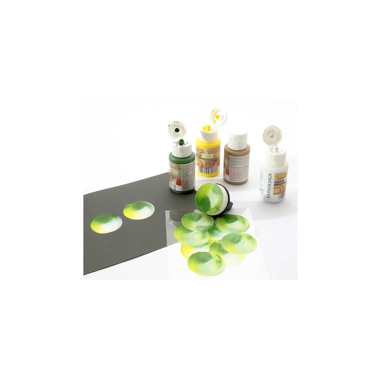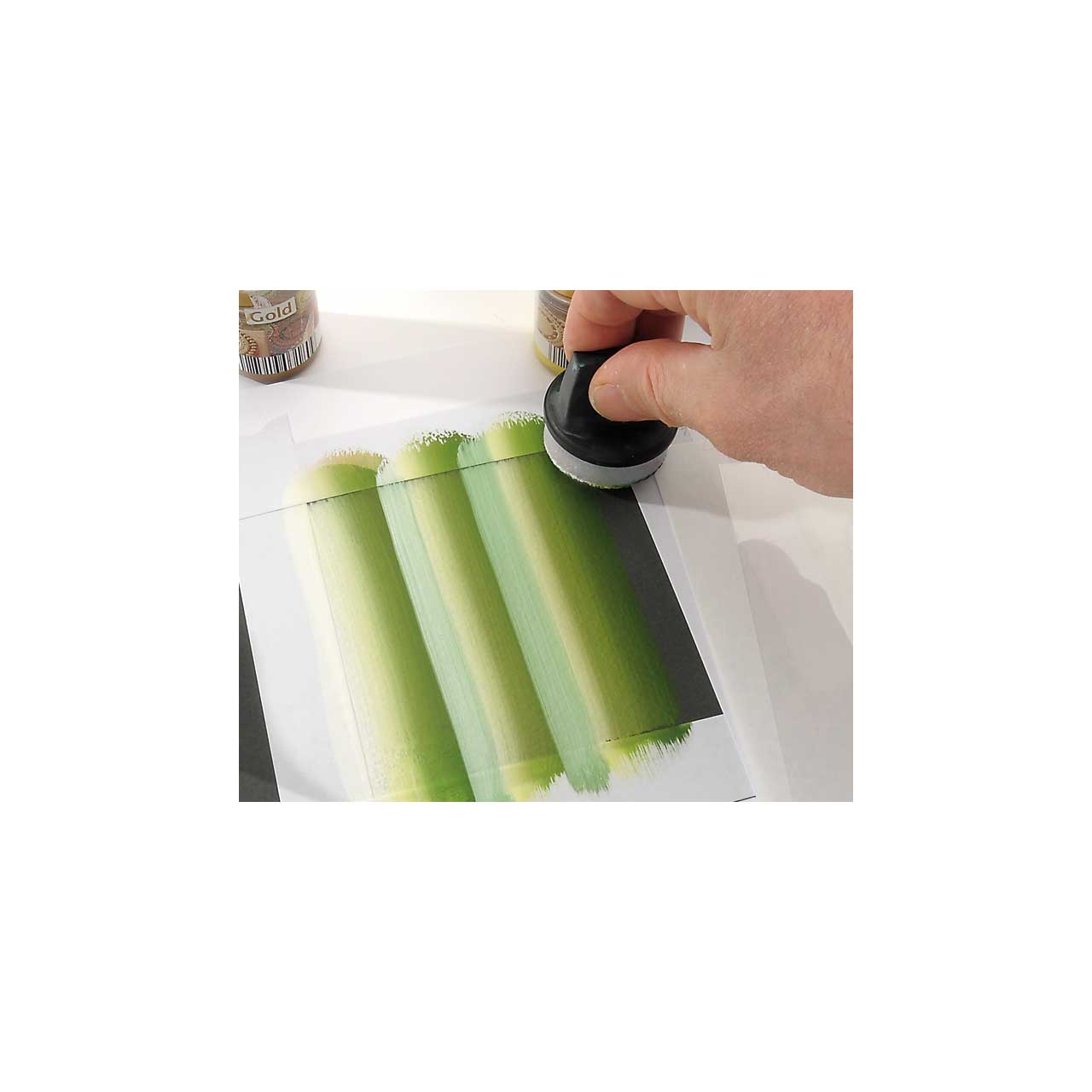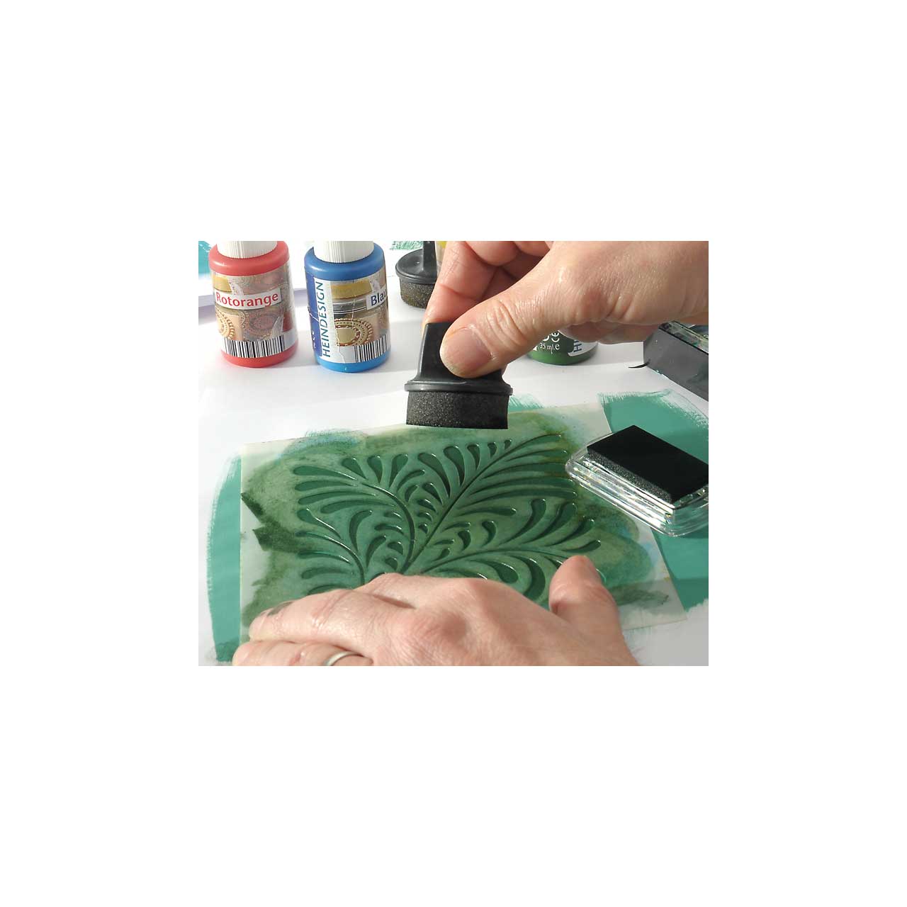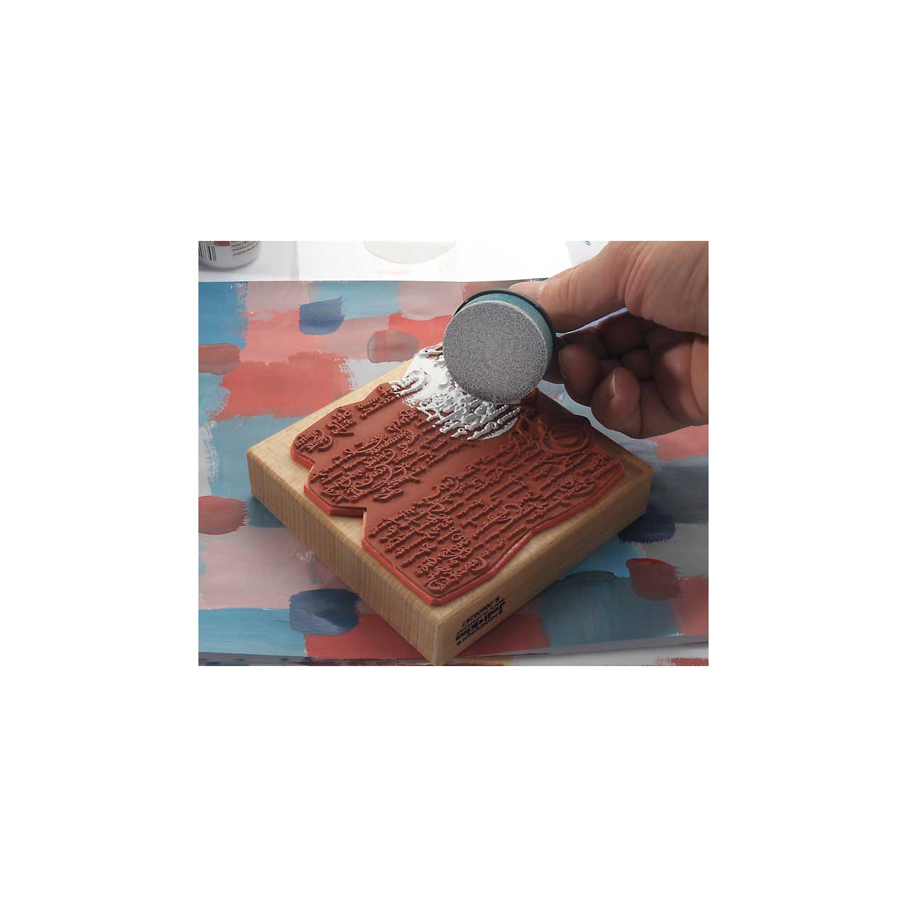 Die Schwämmchen haben einen stabilen komfortablen Handgriff mit dem Sie prima arbeiten können. Geben Sie einen großen Klecks Ihrer Farbe auf eine Palette und tupfen Sie mit dem Schwämmchen darauf. Die Farbe wird gemischt und aufgesaugt, anschließend können Sie die Farbe auf das Stempelgummi auftragen.