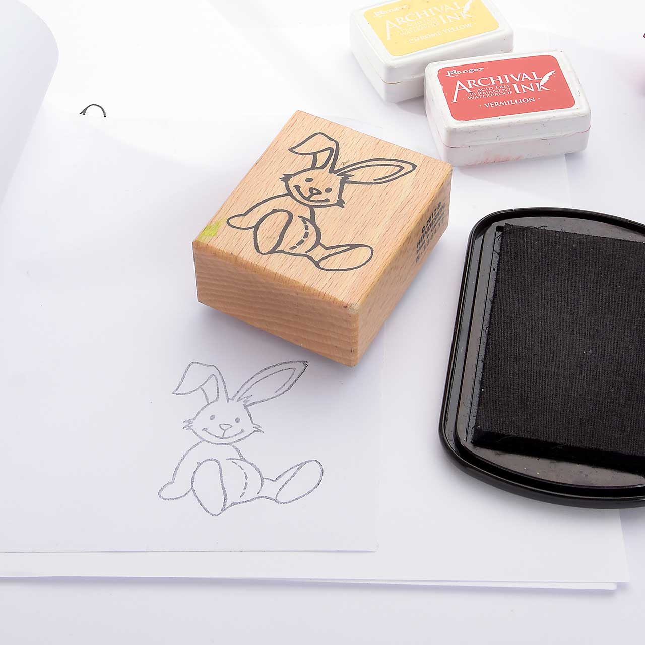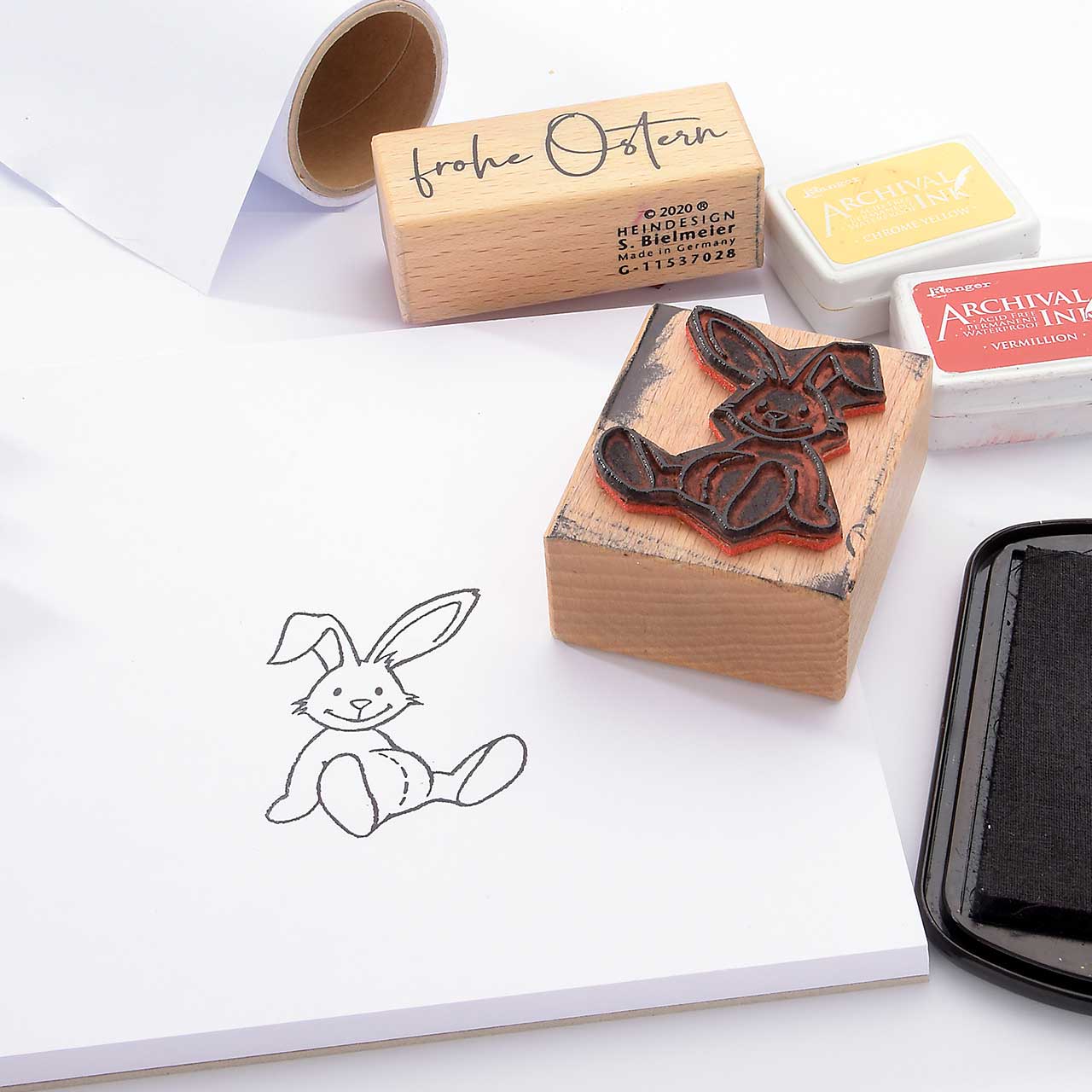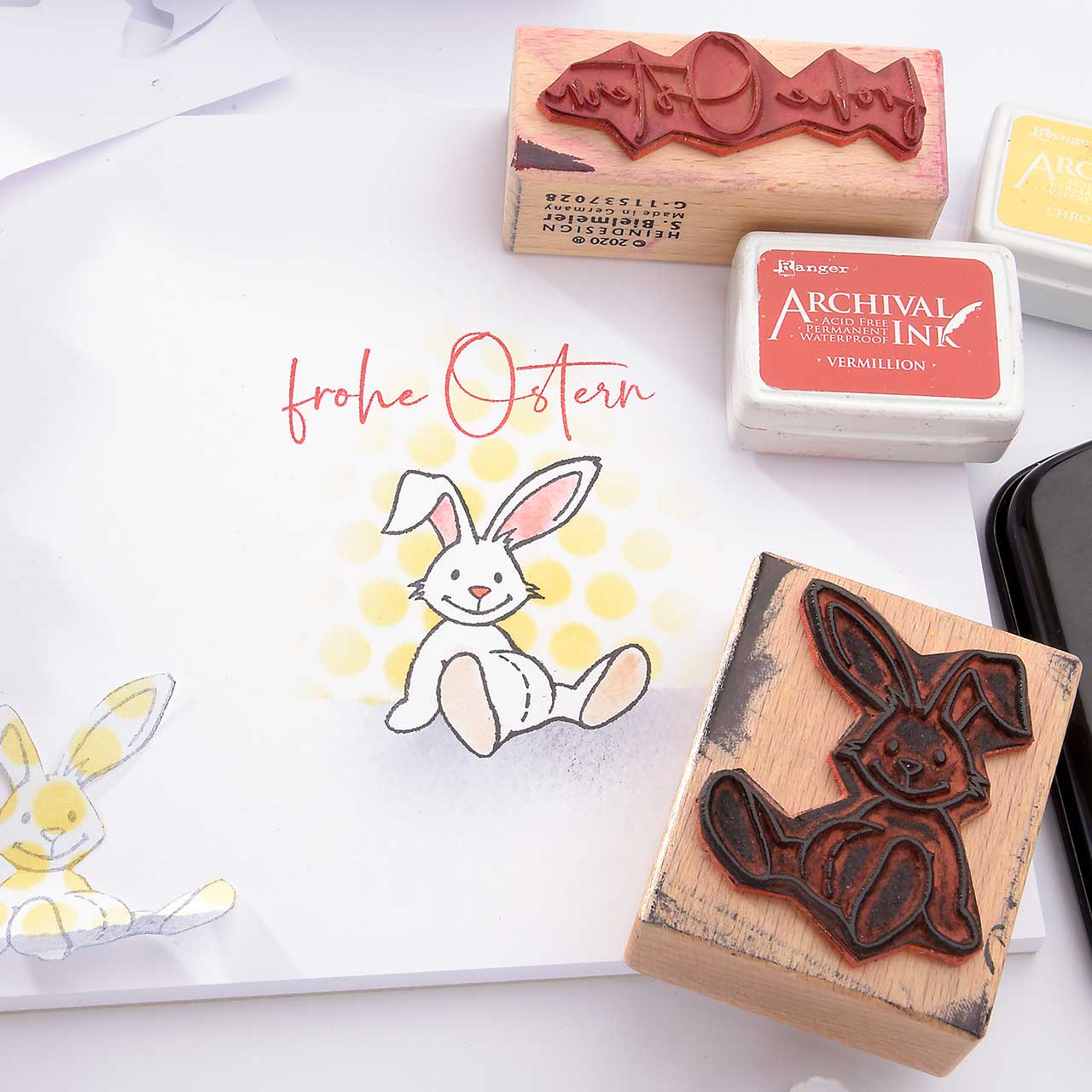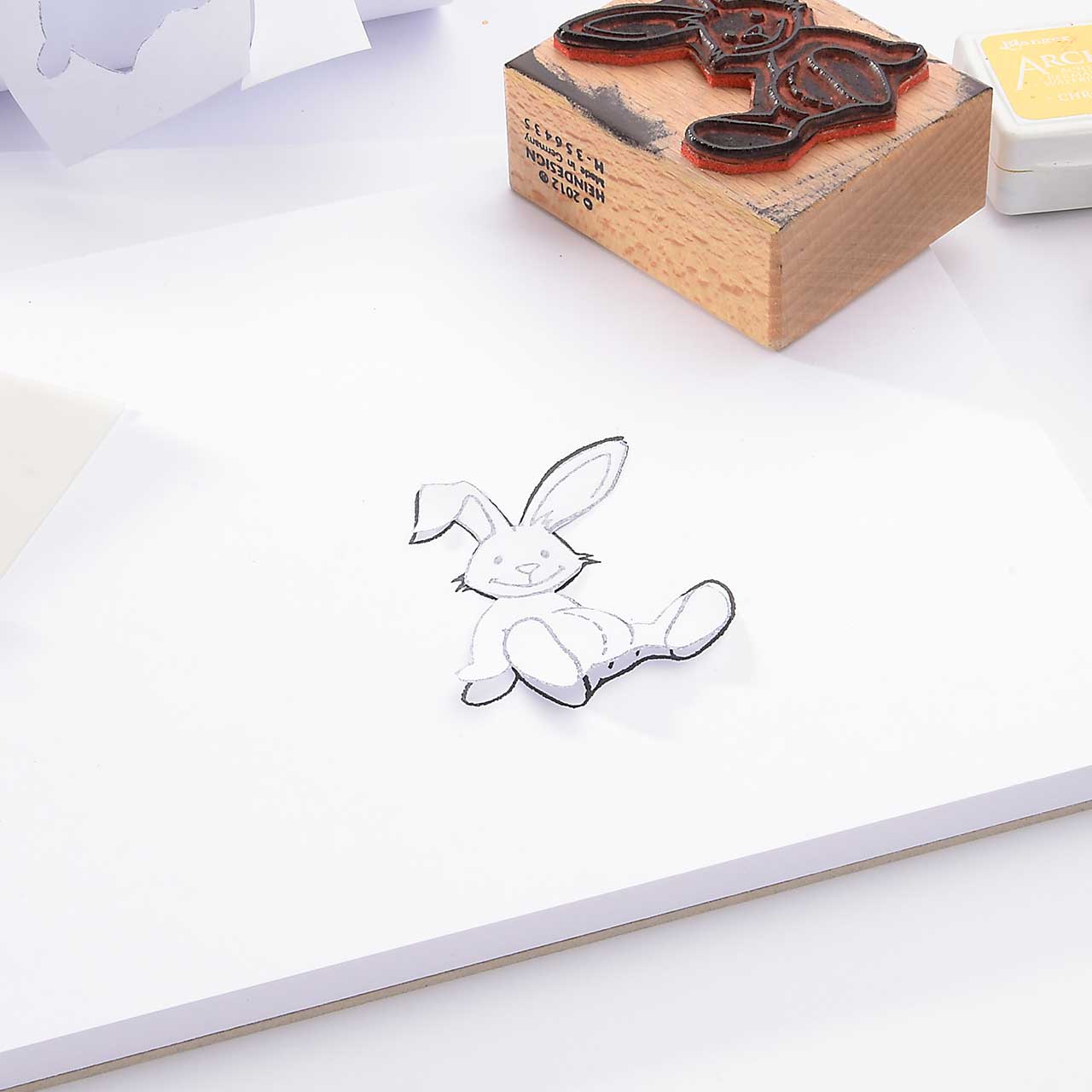 Stempeln Sie das Hasi Motiv mit dem schwarzen Stempelkissen in die Mitte Ihrer Karte.