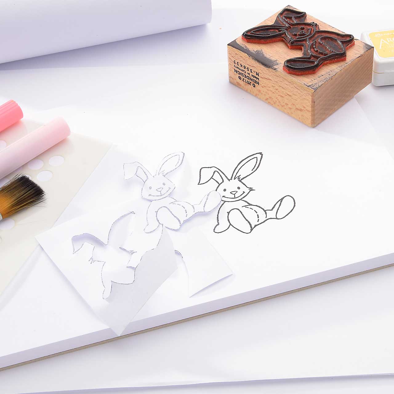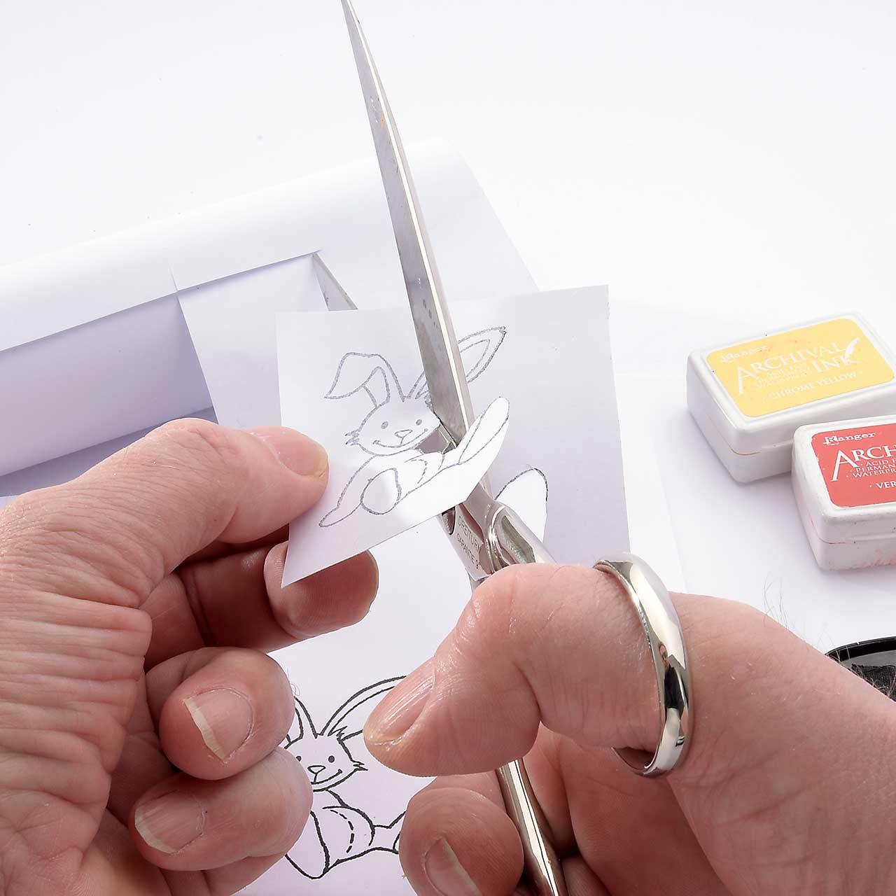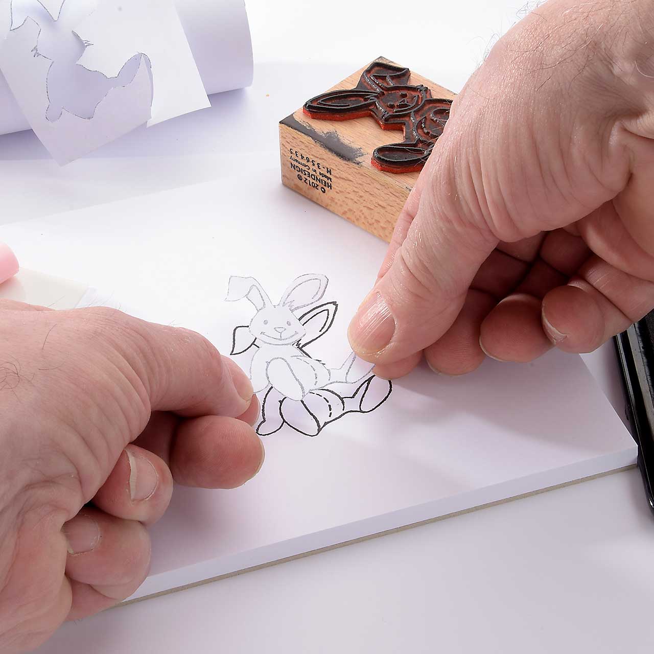 Stempeln Sie das Hasi Motiv ein weiteres Mal auf ein Stück Eclipse Schablonenpapier und schneiden Sie es aus. Decken Sie mit dieser Maske das Motiv auf Ihrer Karte ab.