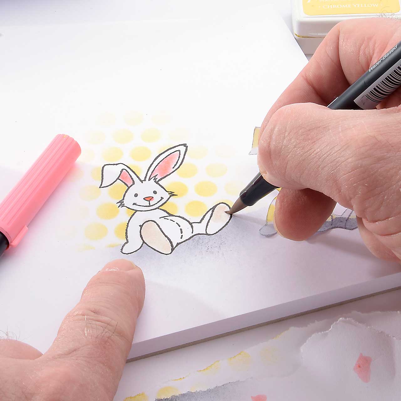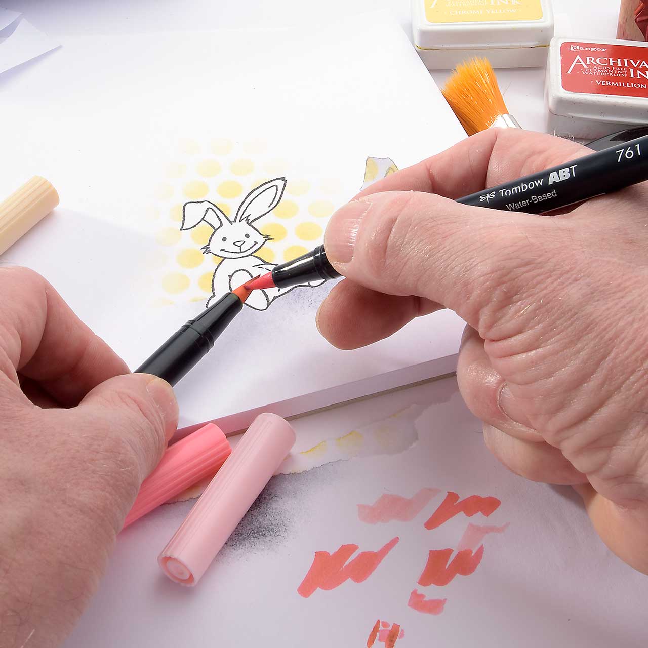 Kolorieren Sie das Hasi Motiv mit den Tombow Dual Brushpen Faserschreibern. (Wenn Sie mit dem hellrosa Faserschreiber Farbe von dem dunkelrosa Faserschreiber abnehmen, entsteht beim Malen ein schöner Verlauf.)