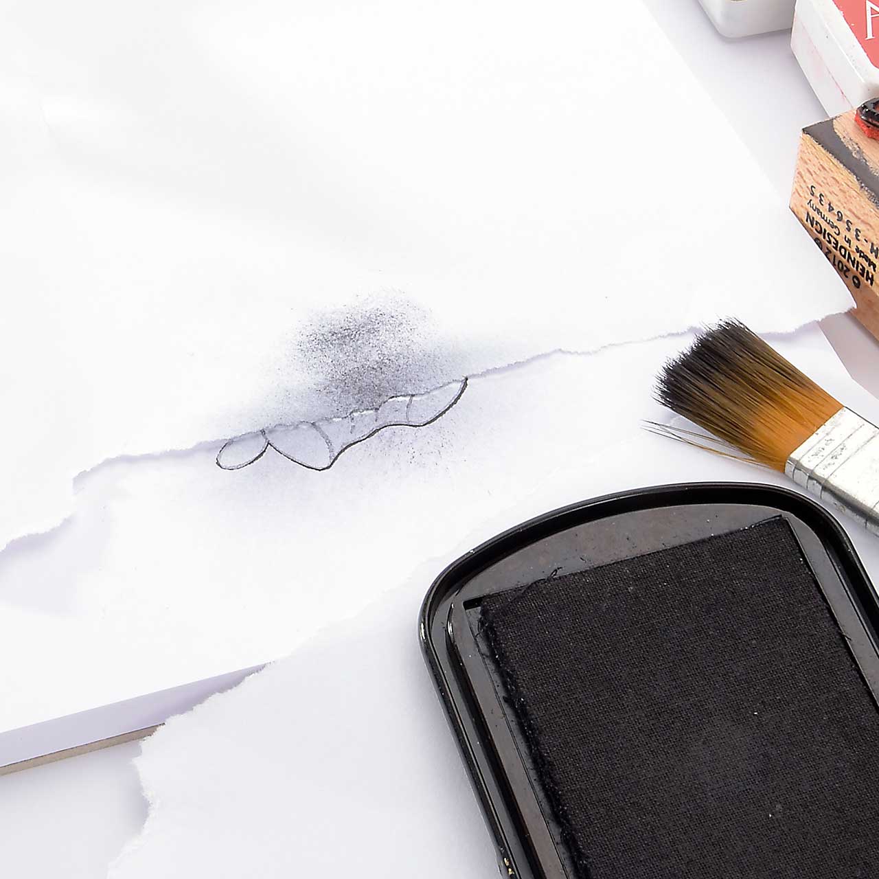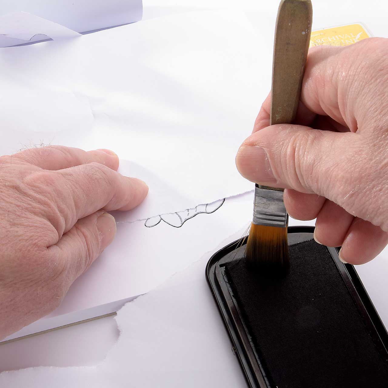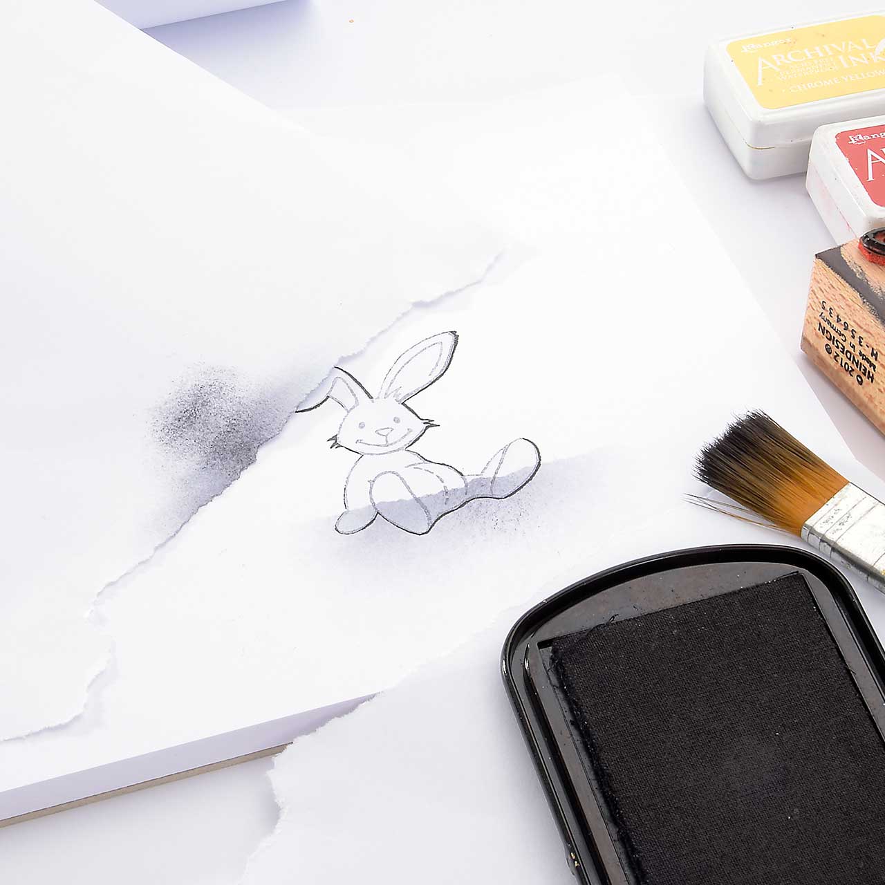 Legen Sie die gerissen Kante des Papiers auf das Hasi Motiv, so dass das Motiv bis auf die Pfoten abgedeckt ist. Nehmen Sie mit dem Pinsel etwas Farbe aus dem schwarzen Stempelkissen auf und tupfen Sie diese entlang der Papierkante - etwa ein/zwei Zentimeter größer als das Motiv ist - auf.