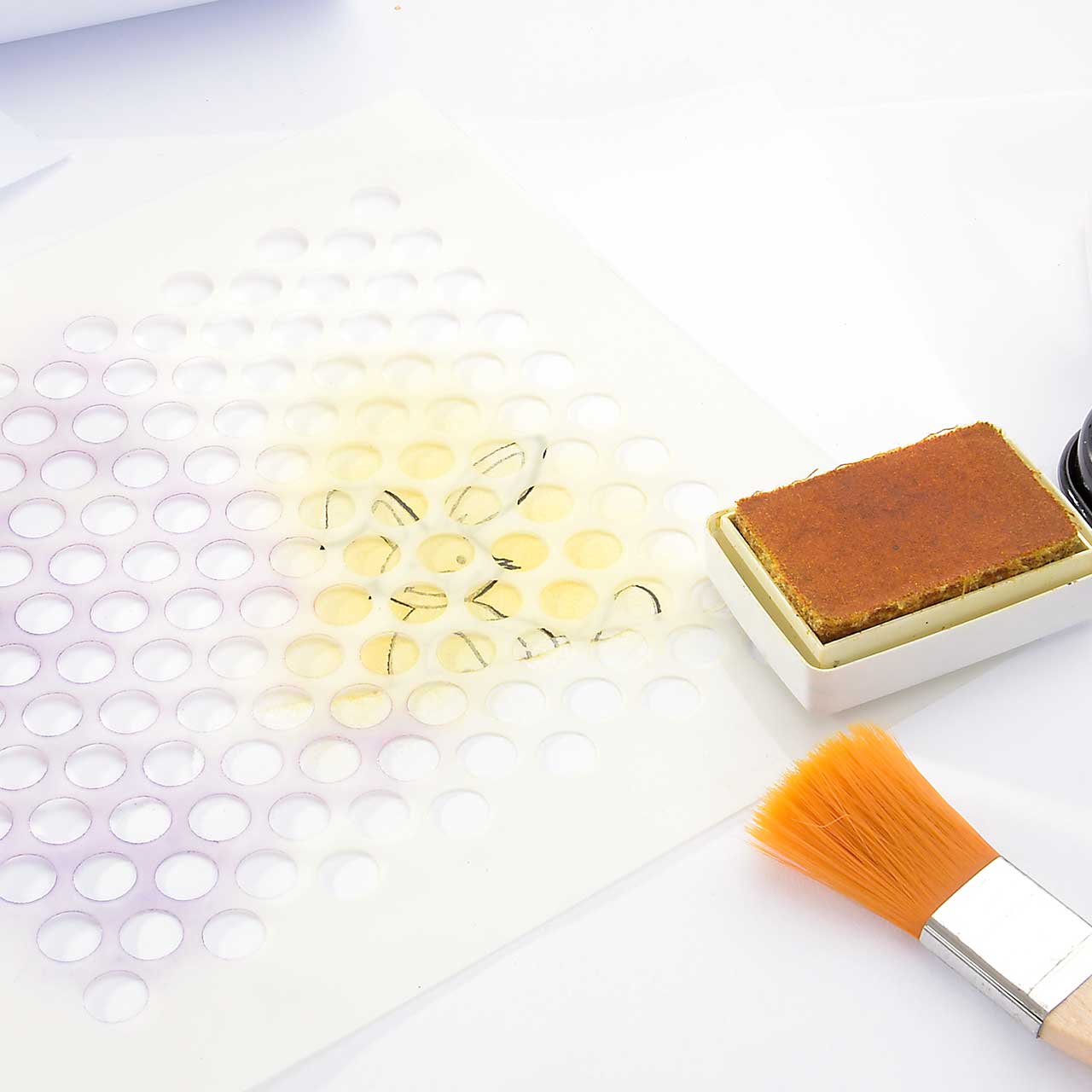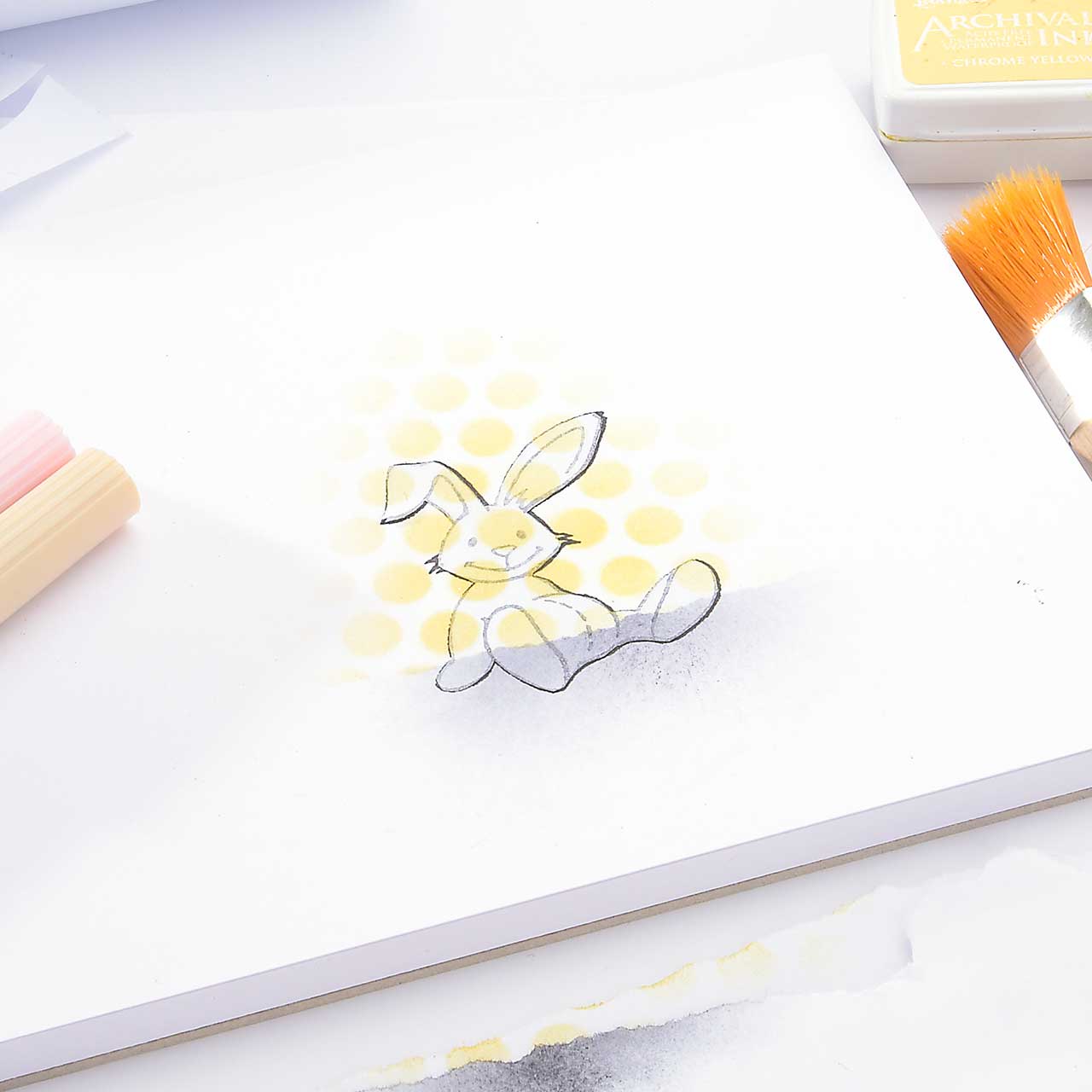 Darauf legen Sie die viele Punkte Schablone und tupfen mit einem Pinsel Farbe aus einen gelben Stempelkissen auf. (Tupfen Sie die Farbe so auf, dass sie in der Nähe des Hasi Motivs relativ kräftig und weiter weg relativ blass ist.)