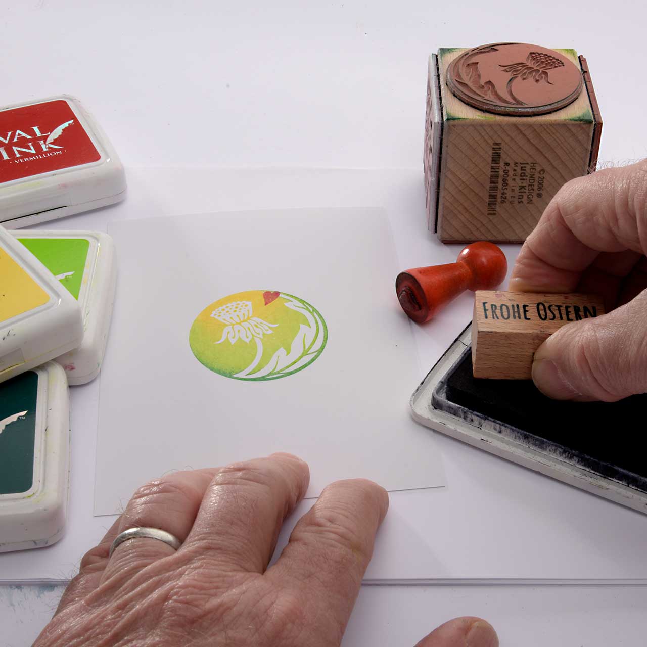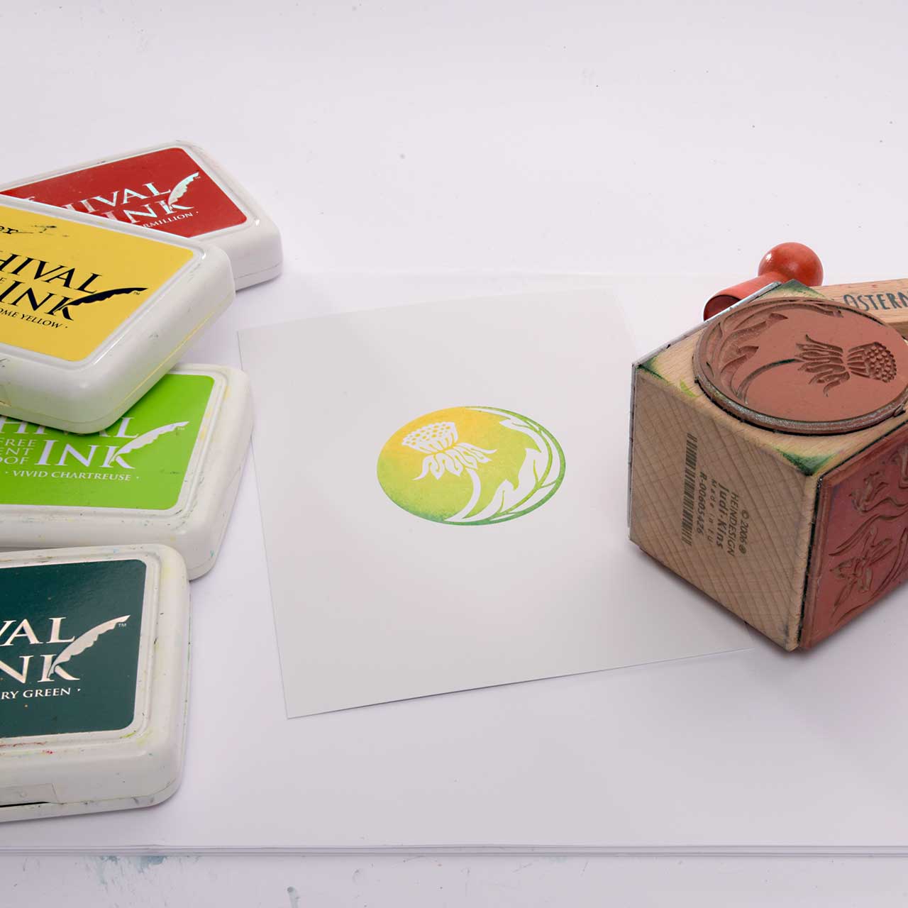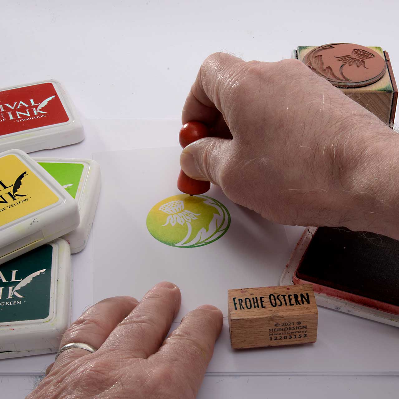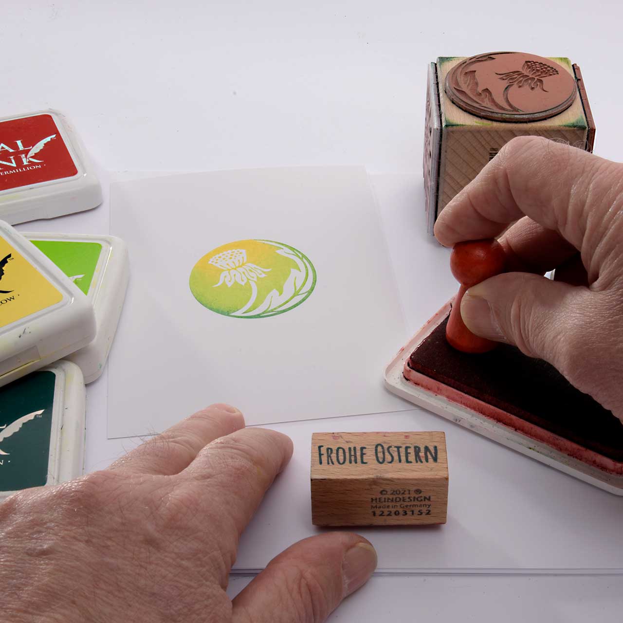 Tupfen mit dem gelben Stempelkissen ganz flächig Farbe auf das Stempelgummi. Im zweiten Schritt tupfen Sie mit dem hellgrünen Stempelkissen Farbe auf die untere Hälfte des Motivs (Stiel und Blatt). Mit dem dunkelgrünen Stempelkissen tupfen Sie im dritten Schritt vorsichtig am Rand entlang. (Beginnen Sie immer mit der hellsten Farbe, wenn Sie ihren Stempel mit mehreren Farben einfärben.)