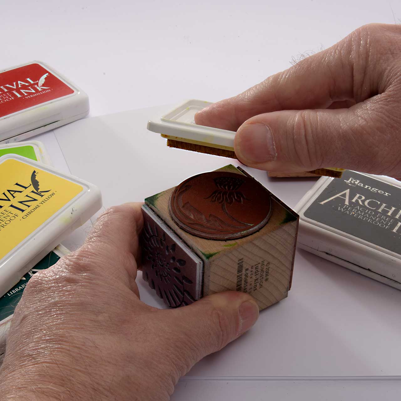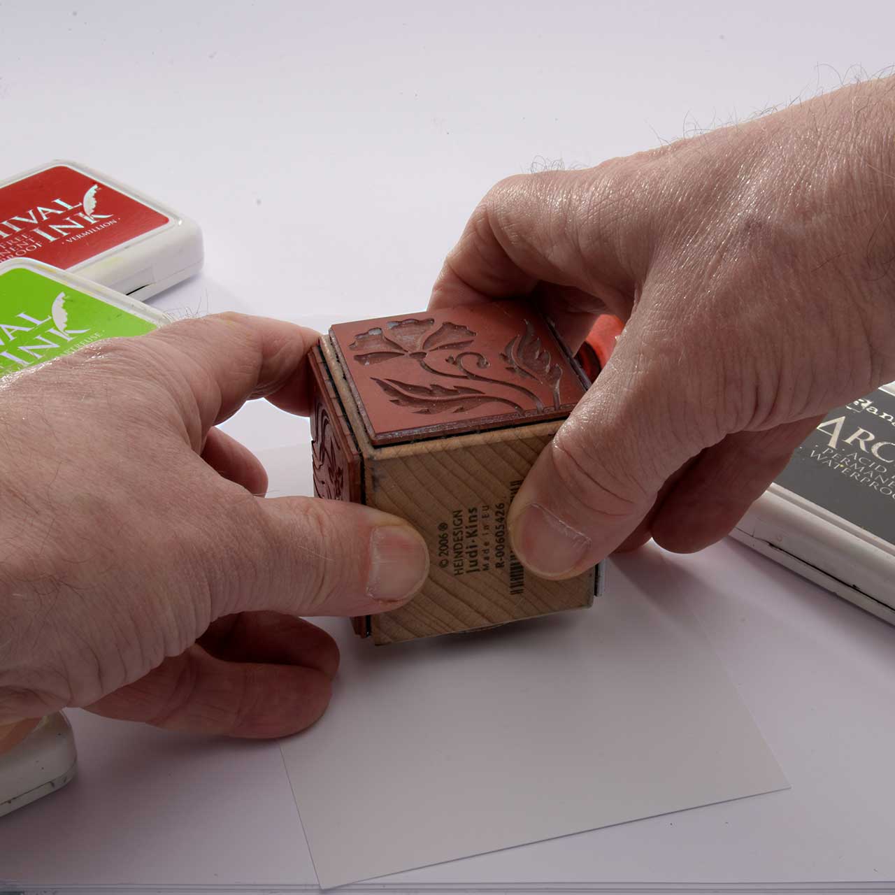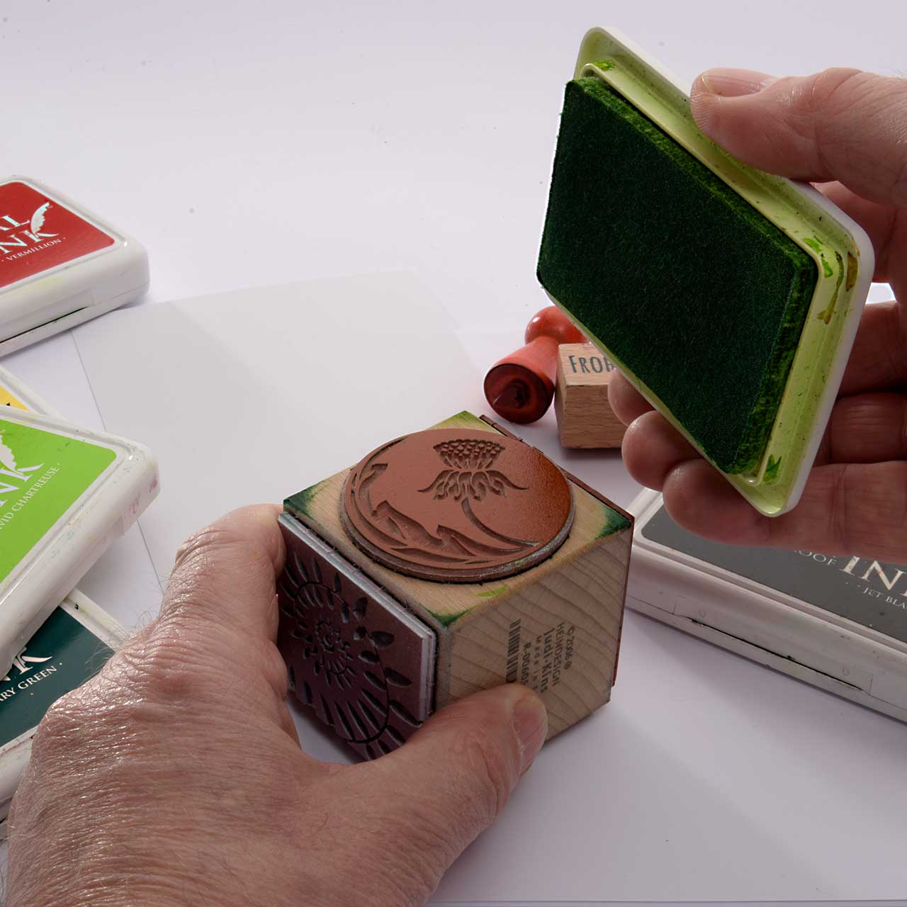 Tupfen mit dem gelben Stempelkissen ganz flächig Farbe auf das Stempelgummi. Im zweiten Schritt tupfen Sie mit dem hellgrünen Stempelkissen Farbe auf die untere Hälfte des Motivs (Stiel und Blatt). Mit dem dunkelgrünen Stempelkissen tupfen Sie im dritten Schritt vorsichtig am Rand entlang. (Beginnen Sie immer mit der hellsten Farbe, wenn Sie ihren Stempel mit mehreren Farben einfärben.)