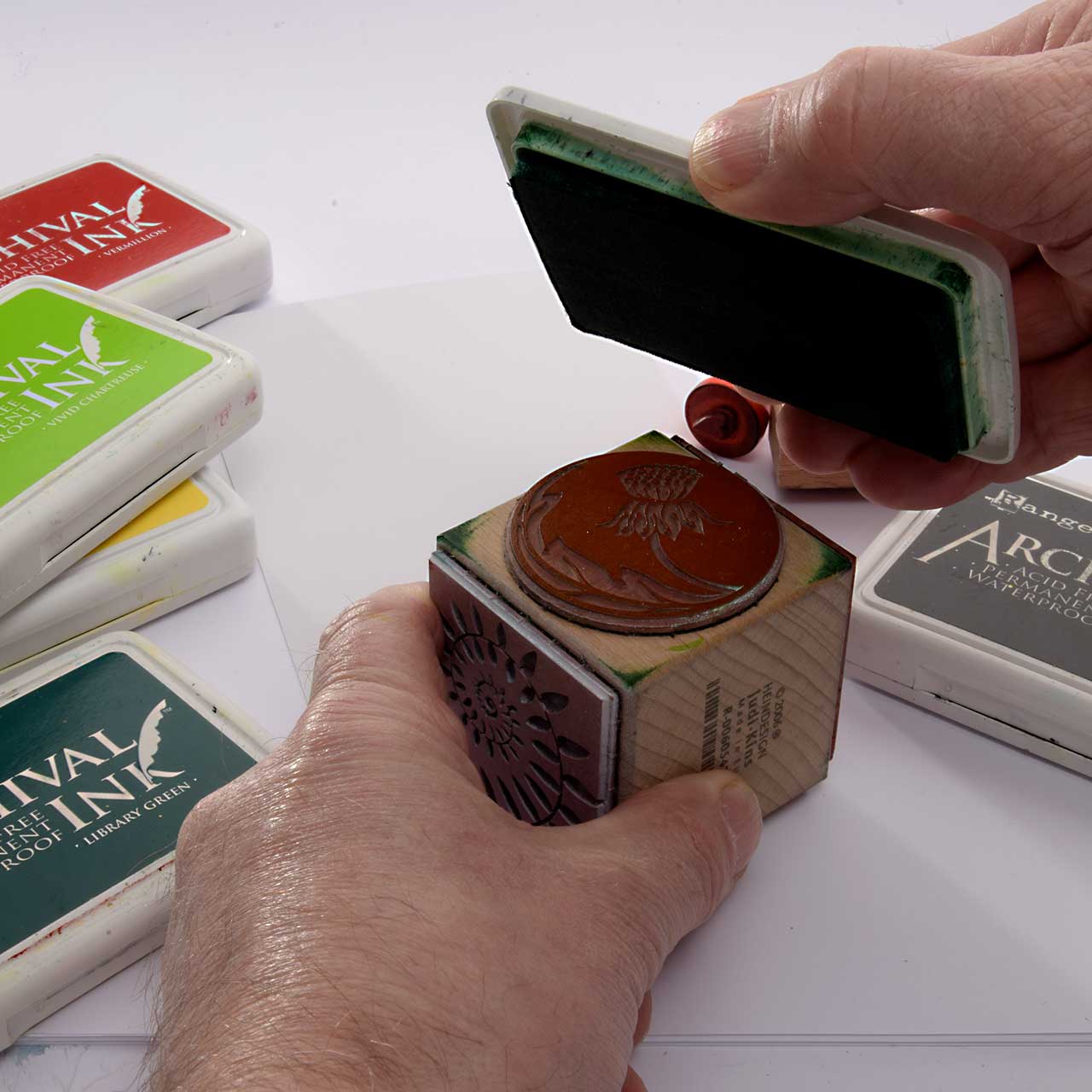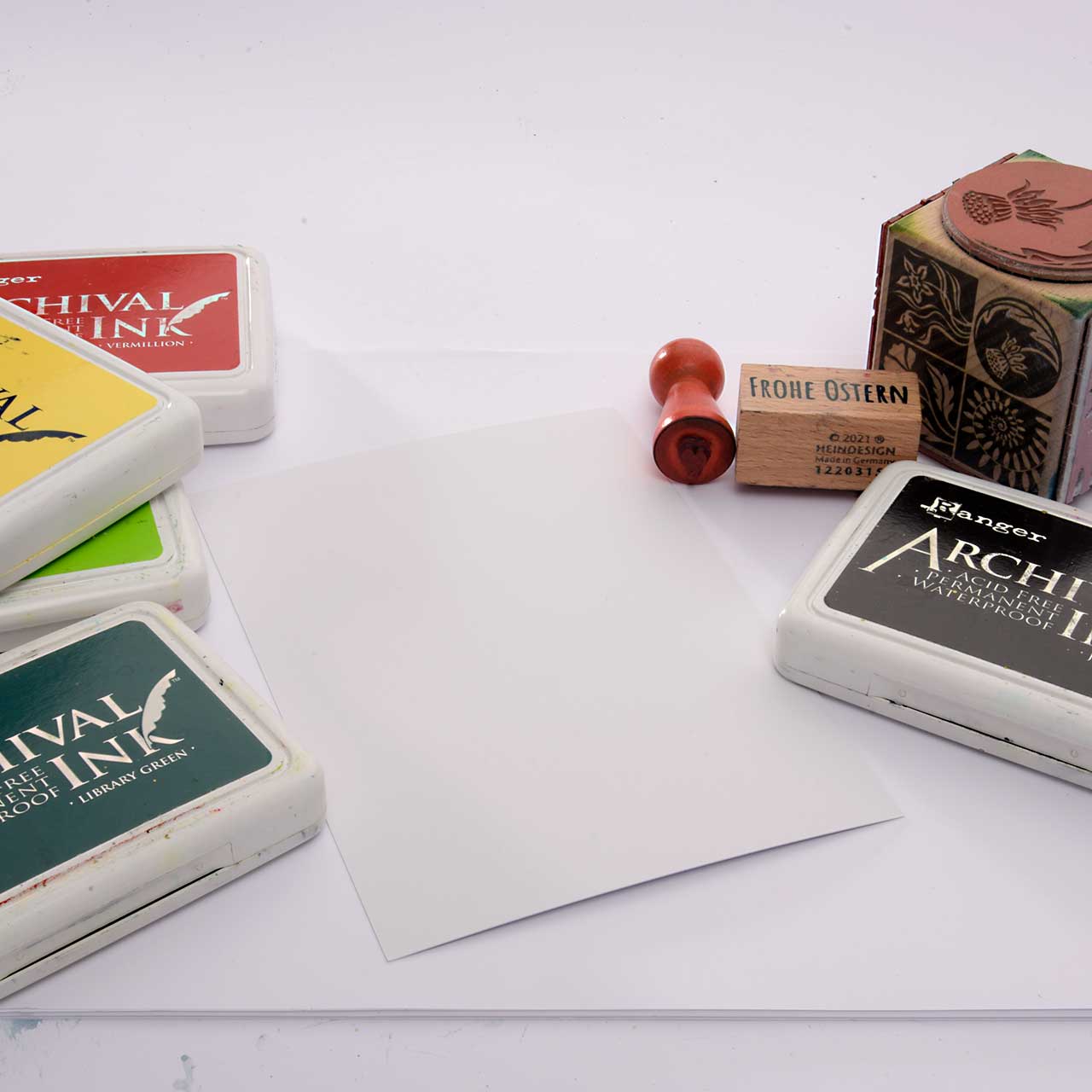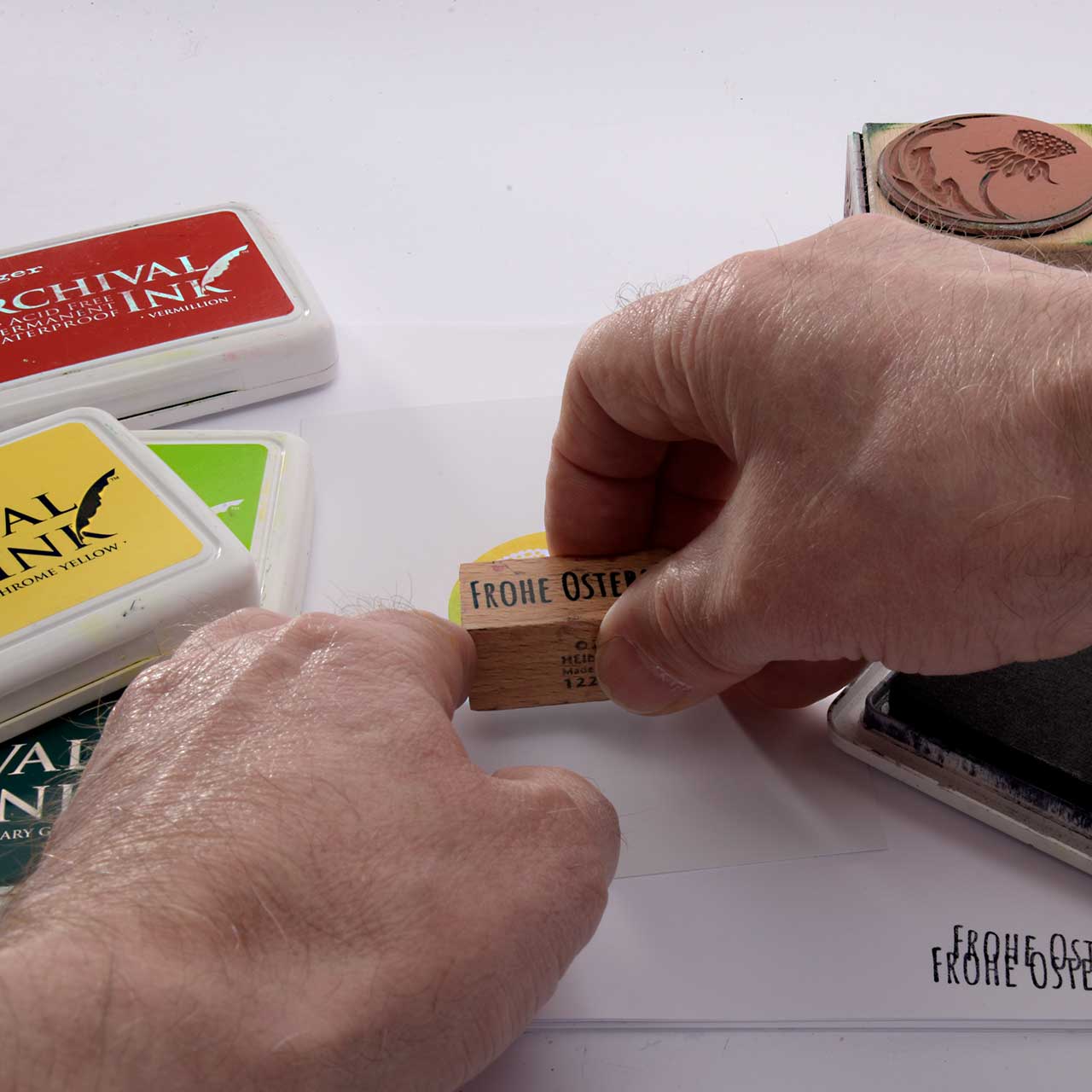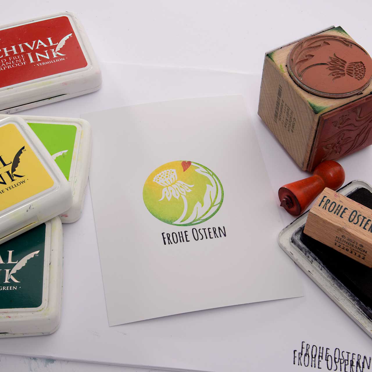 Tupfen mit dem gelben Stempelkissen ganz flächig Farbe auf das Stempelgummi. Im zweiten Schritt tupfen Sie mit dem hellgrünen Stempelkissen Farbe auf die untere Hälfte des Motivs (Stiel und Blatt). Mit dem dunkelgrünen Stempelkissen tupfen Sie im dritten Schritt vorsichtig am Rand entlang. (Beginnen Sie immer mit der hellsten Farbe, wenn Sie ihren Stempel mit mehreren Farben einfärben.)