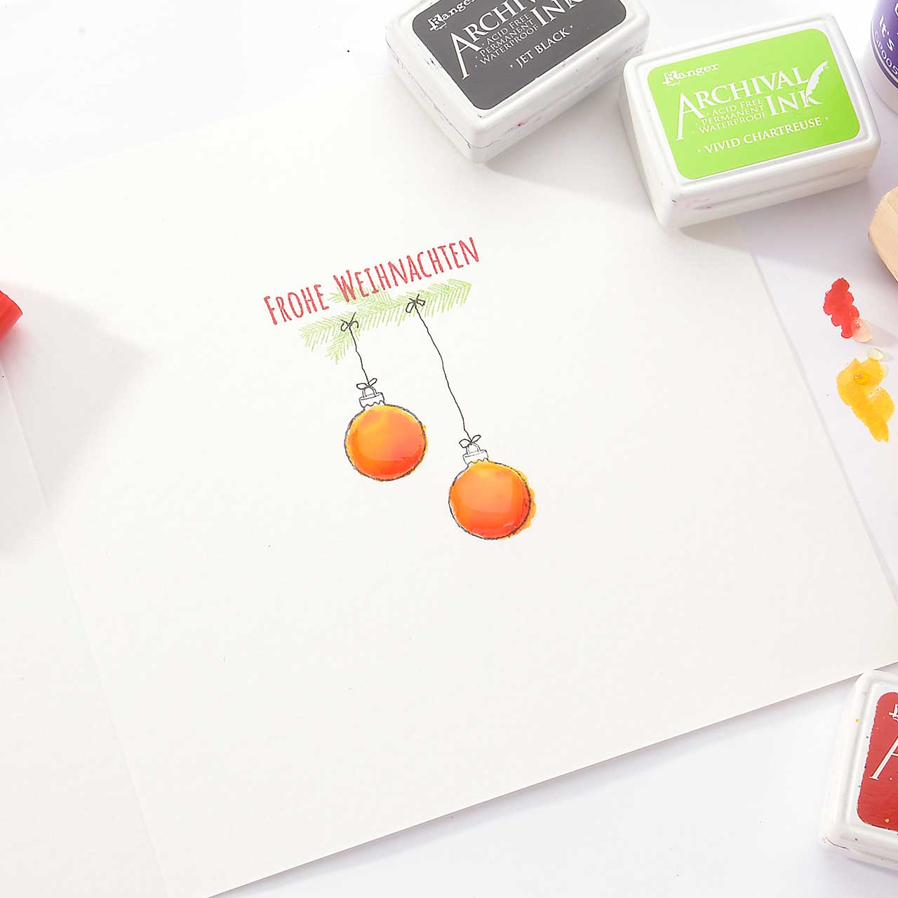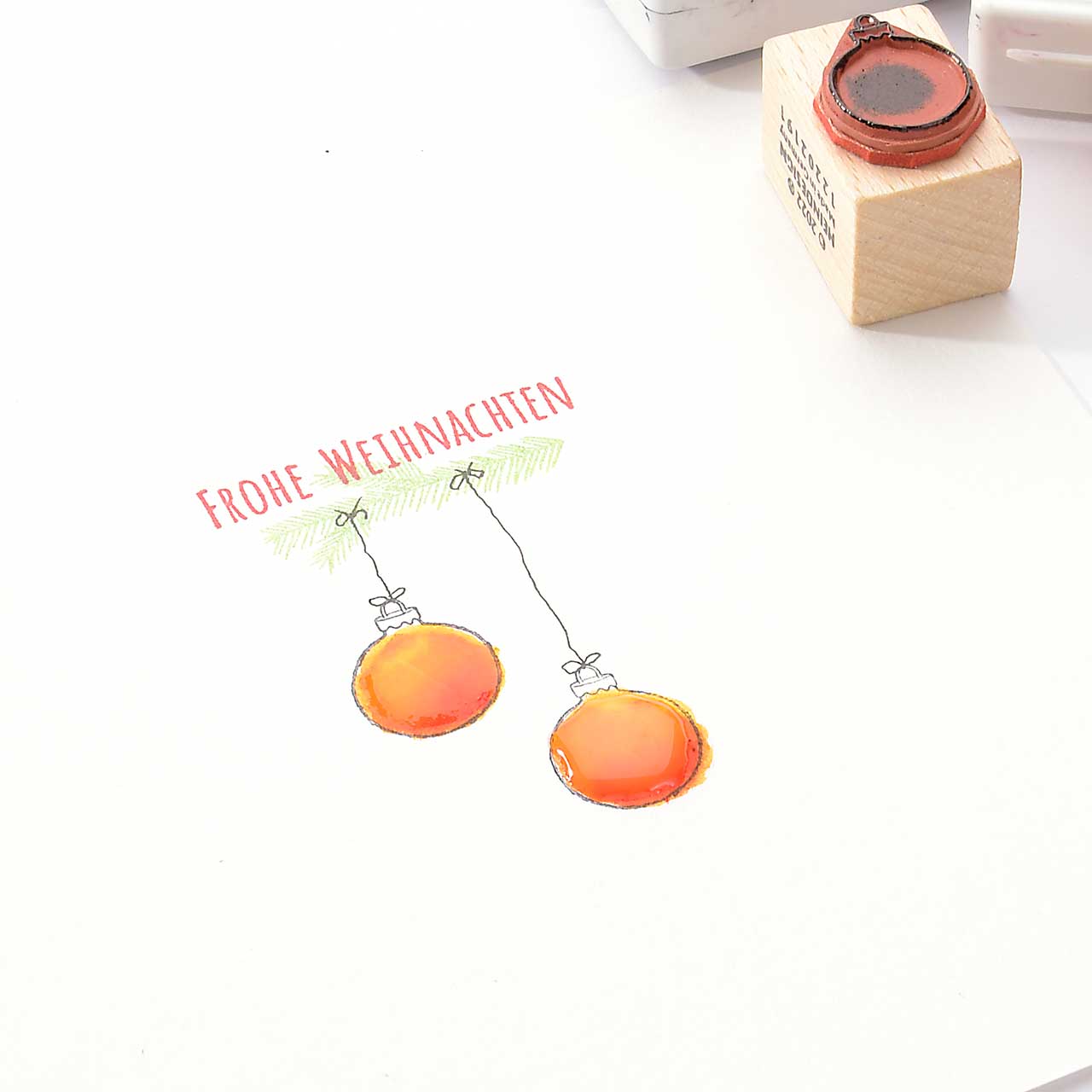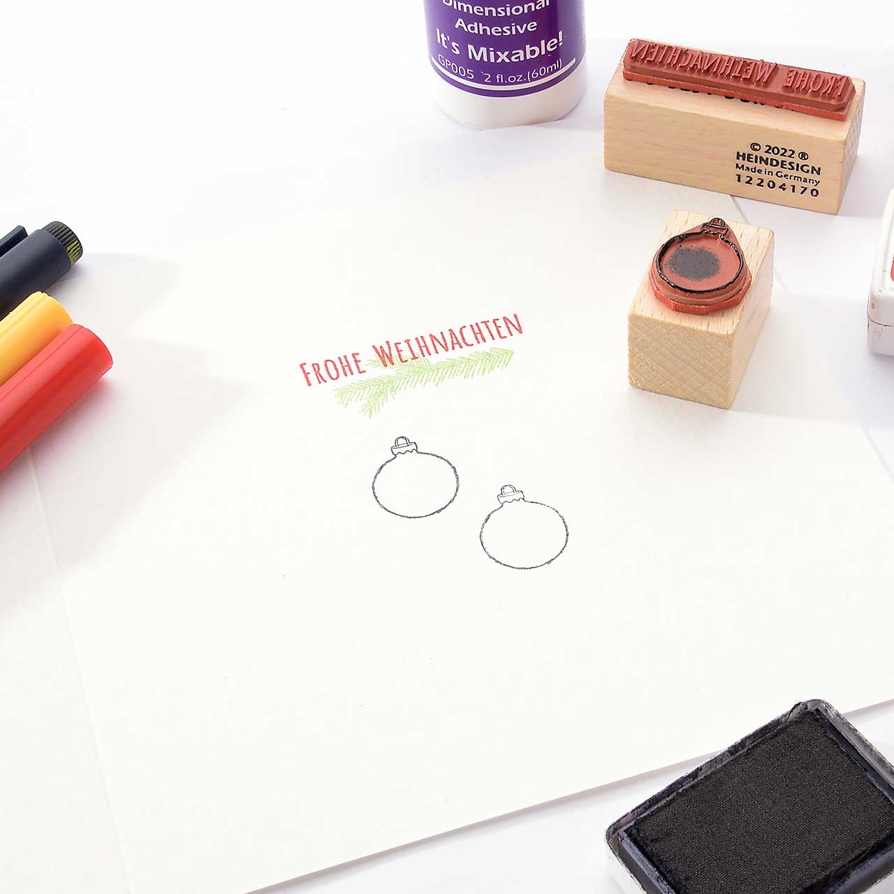 Stempeln Sie das Christbaumkugel Motiv zweimal mit dem schwarzen Stempelkissen unterhalb des Tannenzweig Motivs in die Mitte Ihrer Karte. Für ein gleichmäßiges Druckbild färben Sie den Stempel vor jedem Abdruck erneut ein.