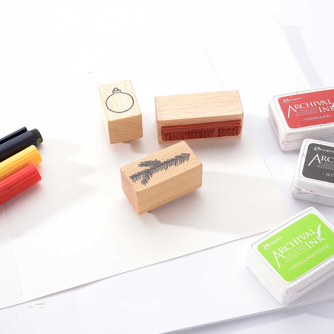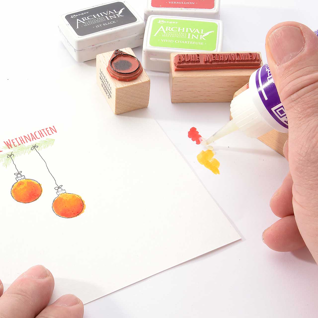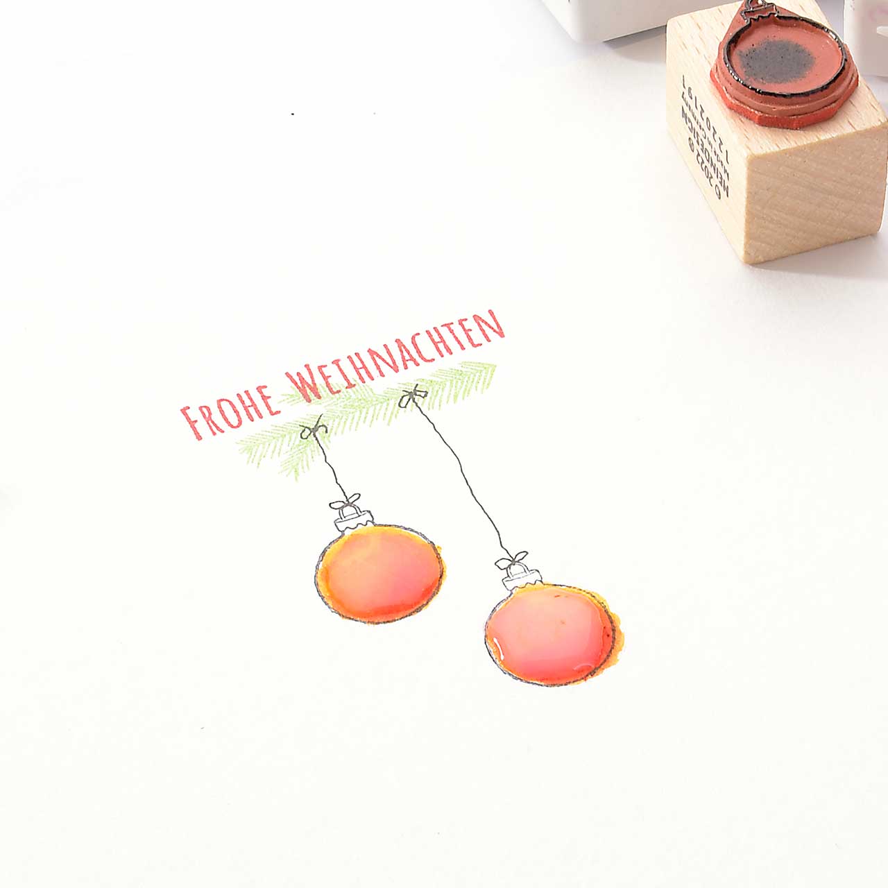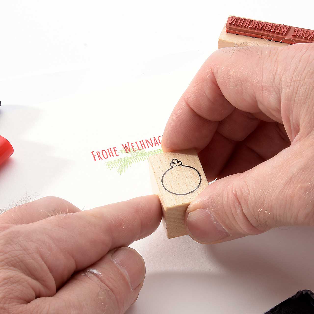 Stempeln Sie das Christbaumkugel Motiv zweimal mit dem schwarzen Stempelkissen unterhalb des Tannenzweig Motivs in die Mitte Ihrer Karte. Für ein gleichmäßiges Druckbild färben Sie den Stempel vor jedem Abdruck erneut ein.