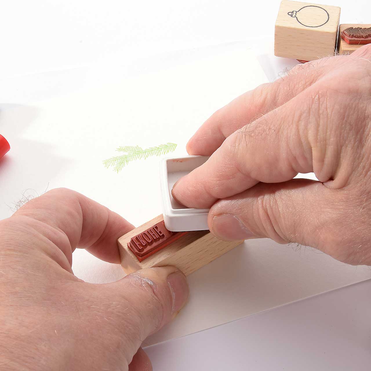 Stempeln Sie das „Frohe Weihnachten“ Textmotiv mit dem roten Stempelkissen halb auf das soeben gestempelte Tannenzweig Motiv.