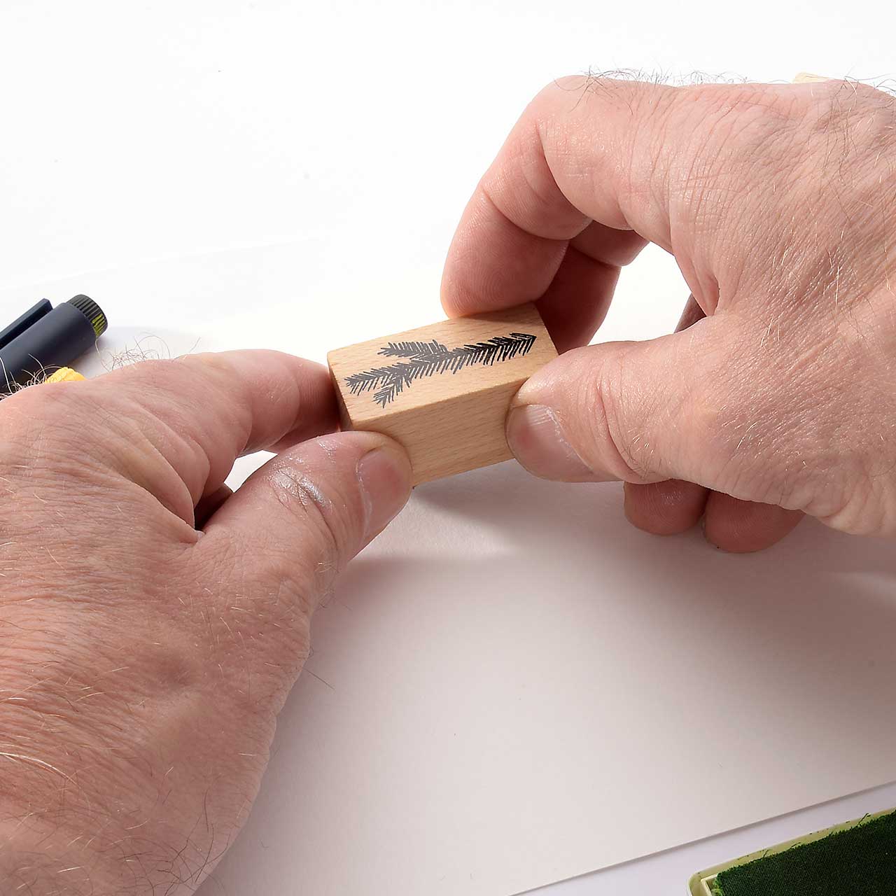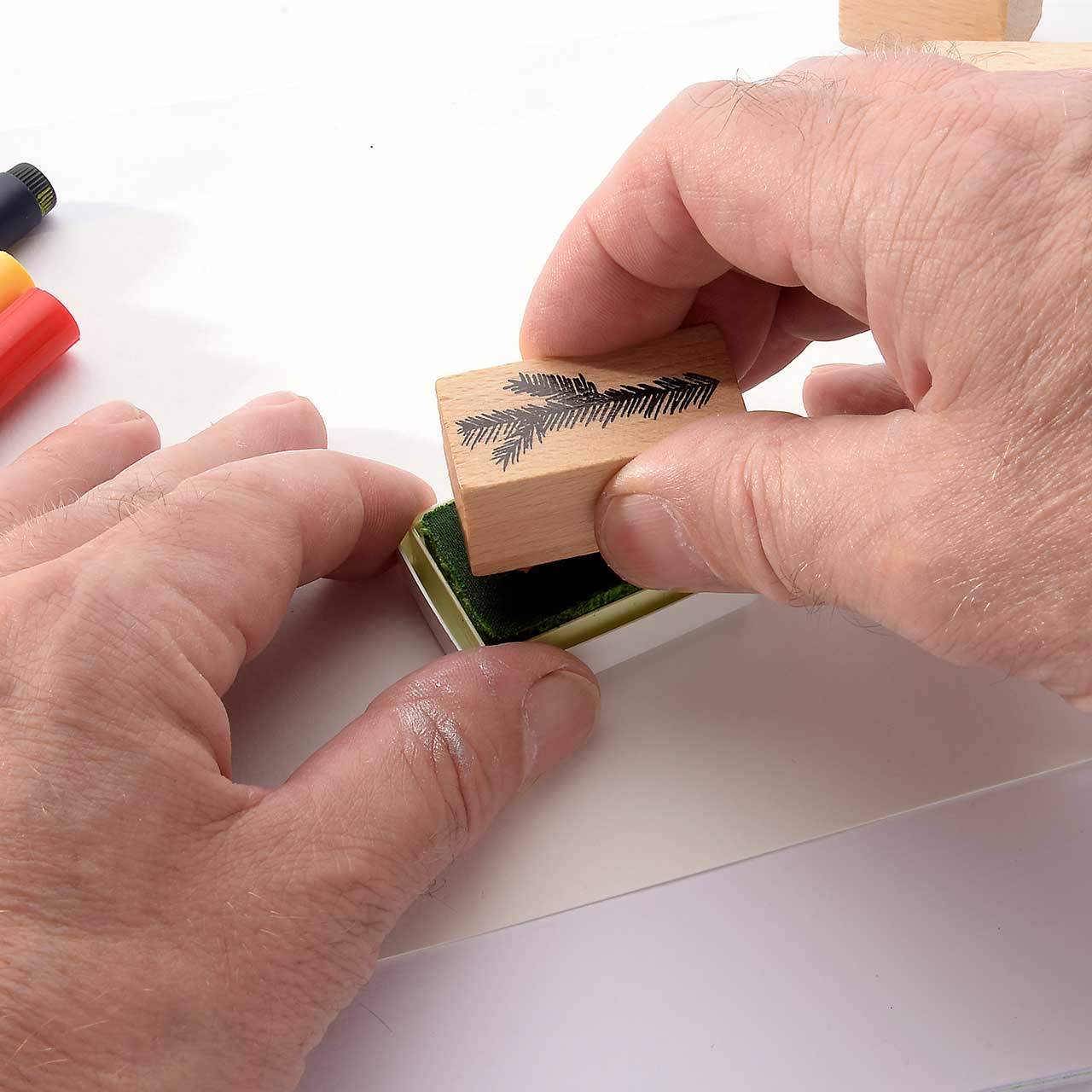 Stempeln Sie das Tannenzweig Motiv mit dem grünen Stempelkissen in die obere Mitte Ihrer Karte.